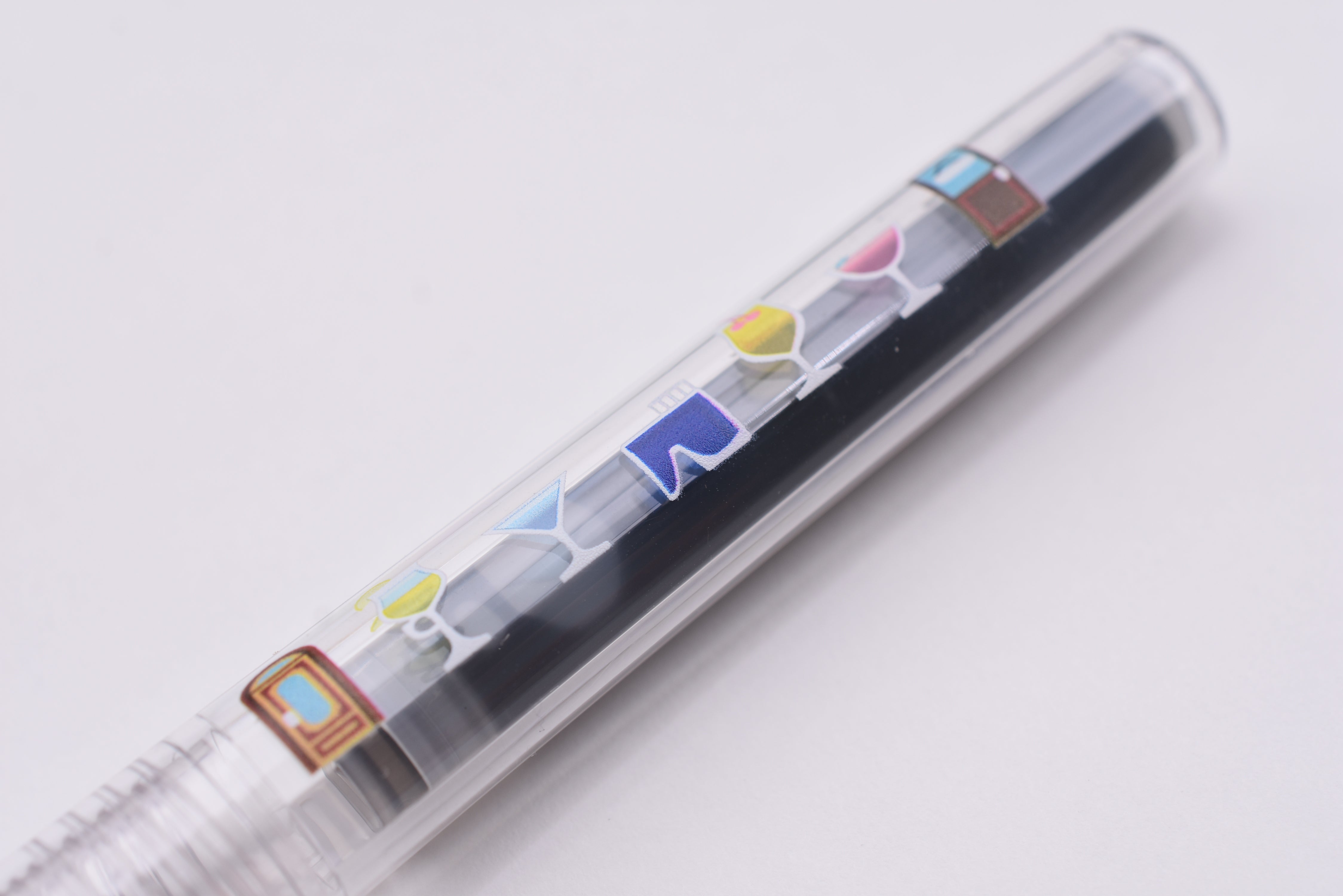 This fountain pen is inspired by a cocktail bar setting; the clear plastic barrel features a door on either end of the barrel and colorful drinks of various kinds in between—and in the middle, a sneakily included BUNGUBOX ink bottle with its signature shape!