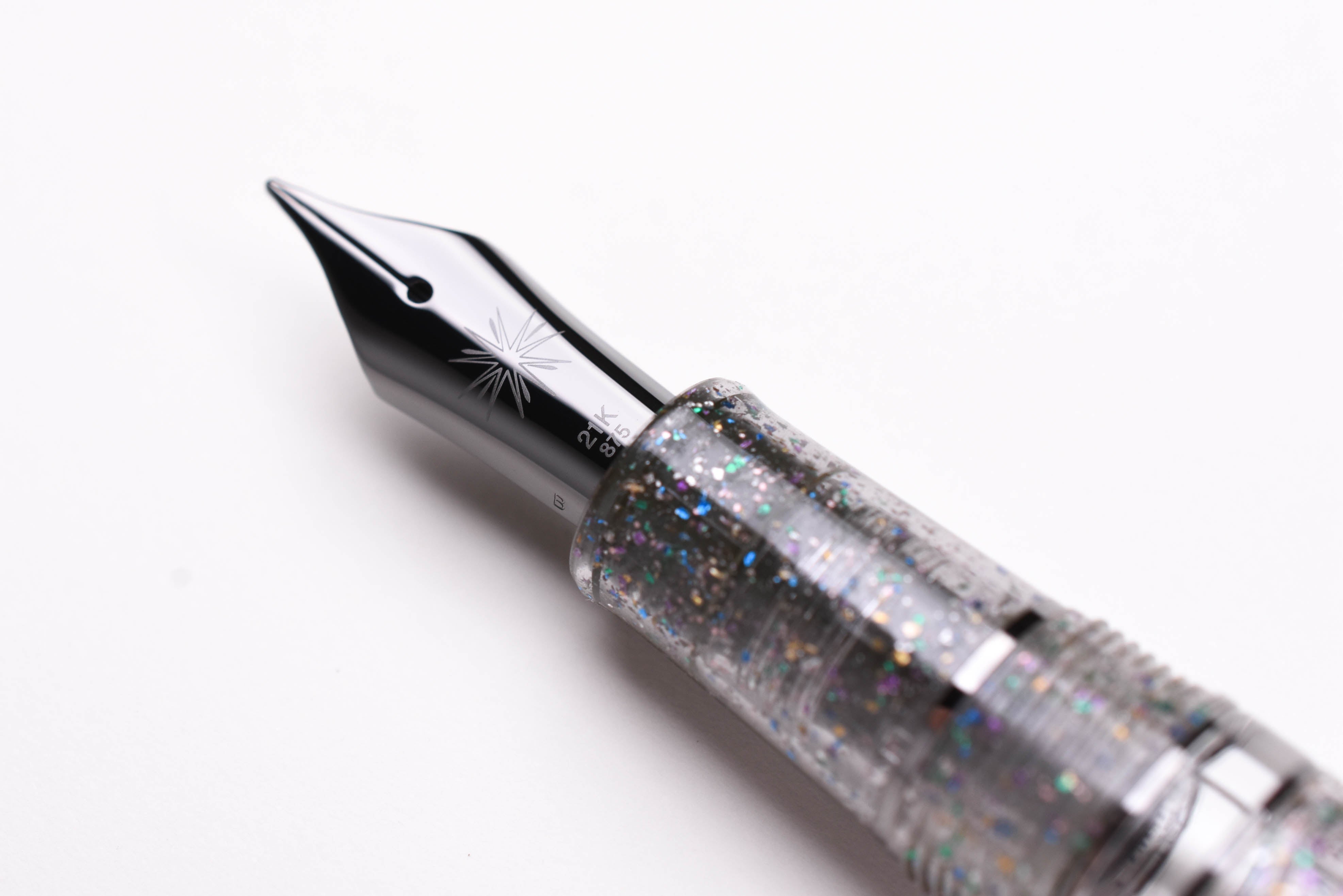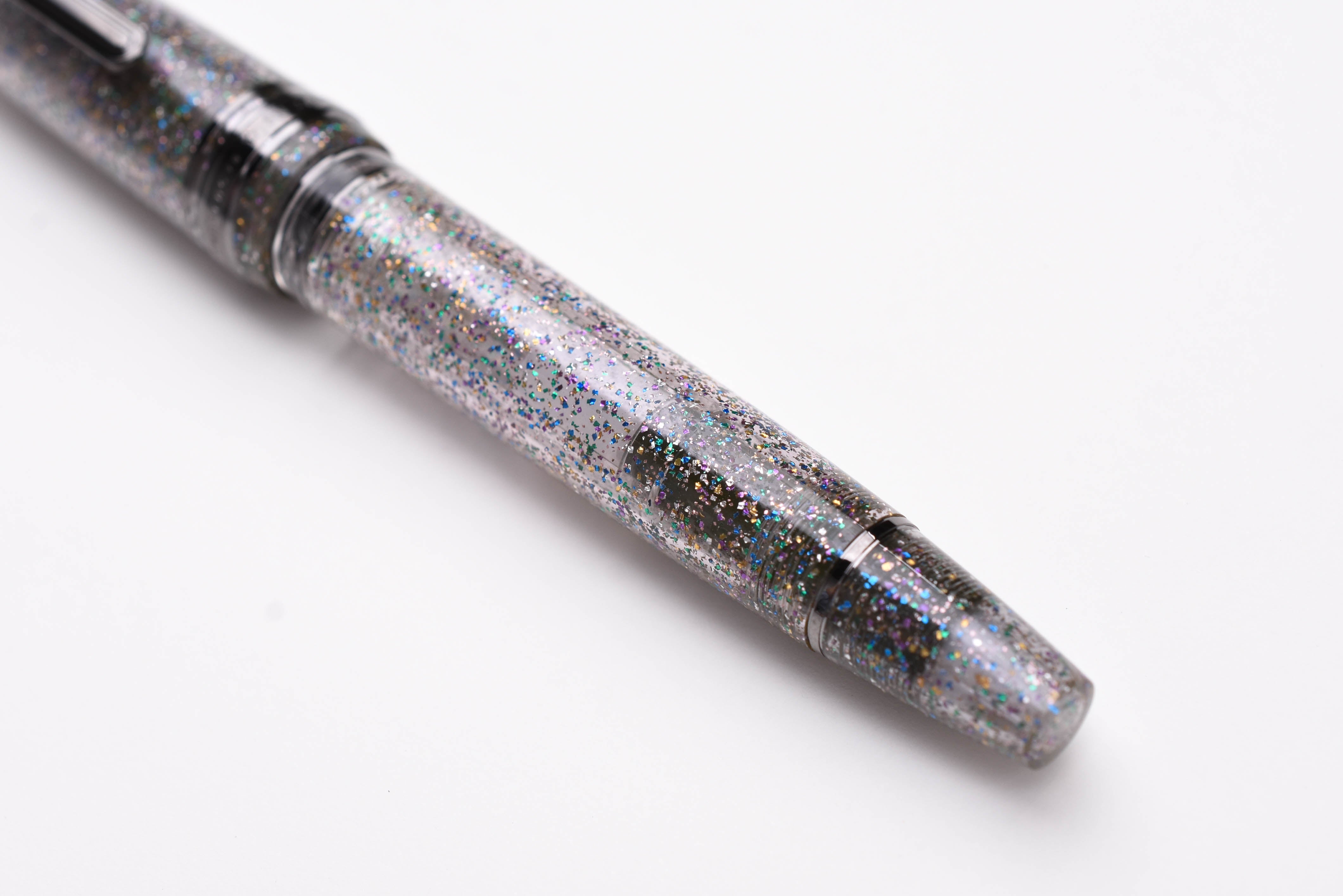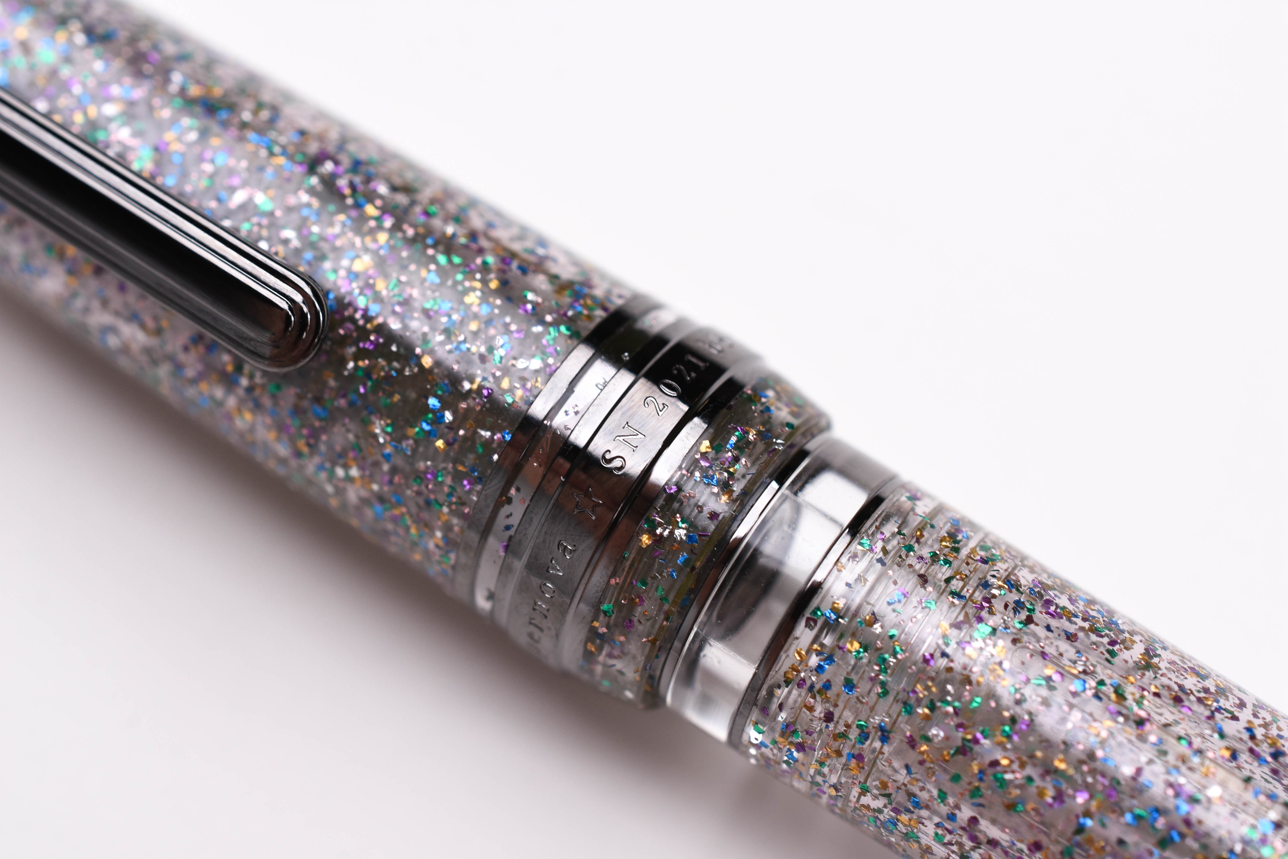 BUNGUBOX Original Fountain Pen - Supernova 2021. Originally produced to commemorate the 2021 Tokyo Pen Show, the Supernova features a transparent resin body inlaid with six different colors of lame and black-ion detailing. Bungubox is re-releasing the Supernova in July of 2023. In the 2023 version, the starburst finial has been changed from raden to maki-e.