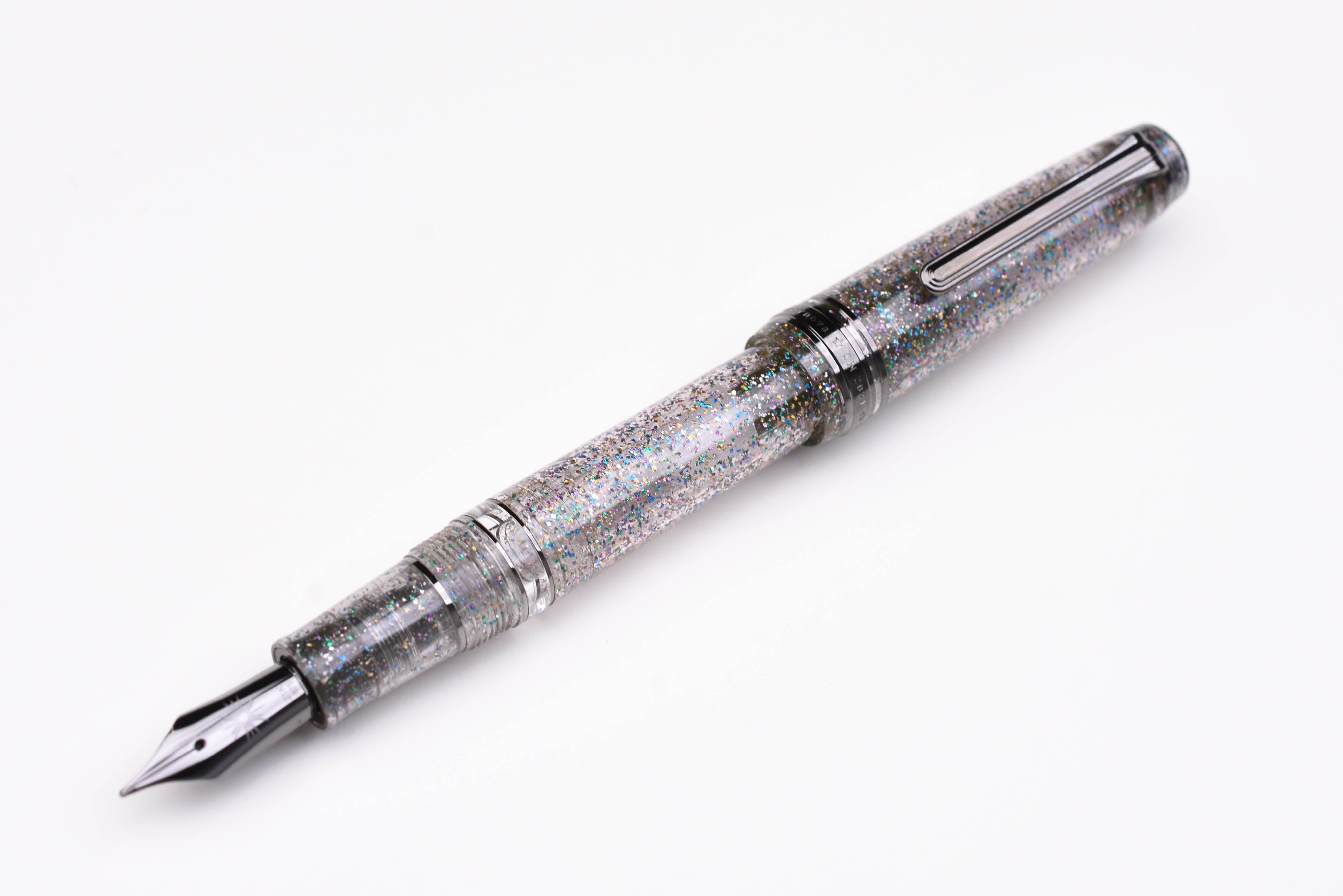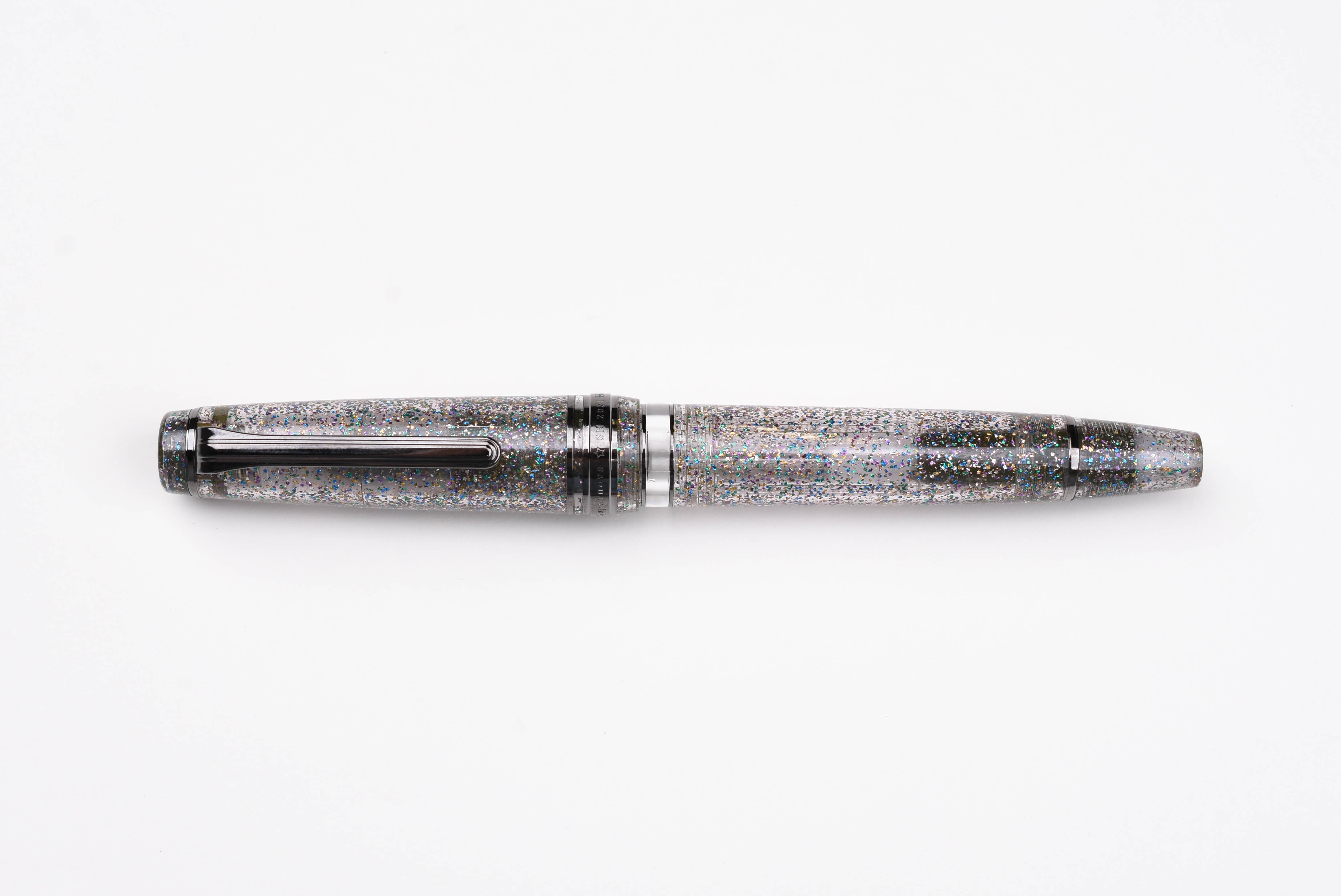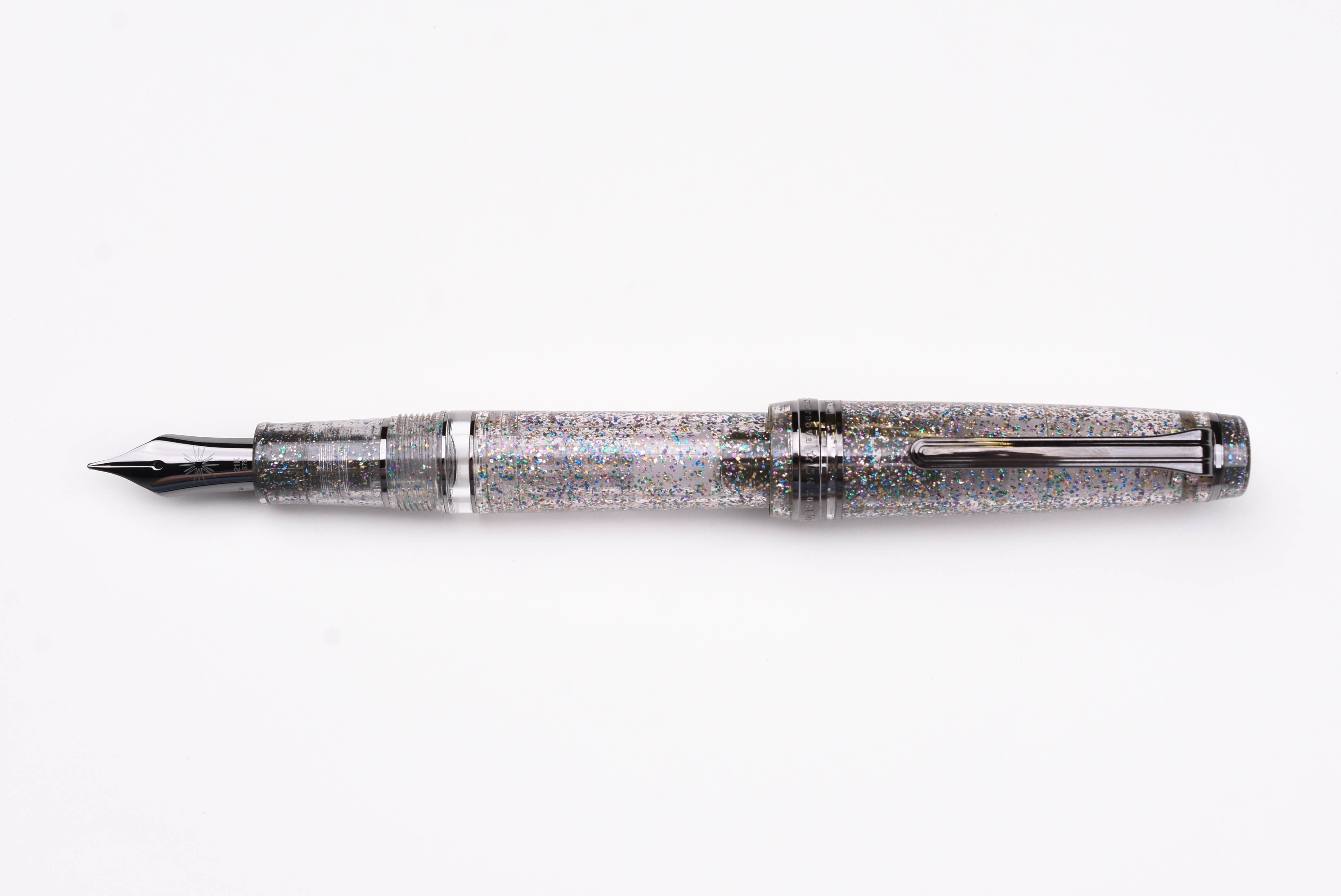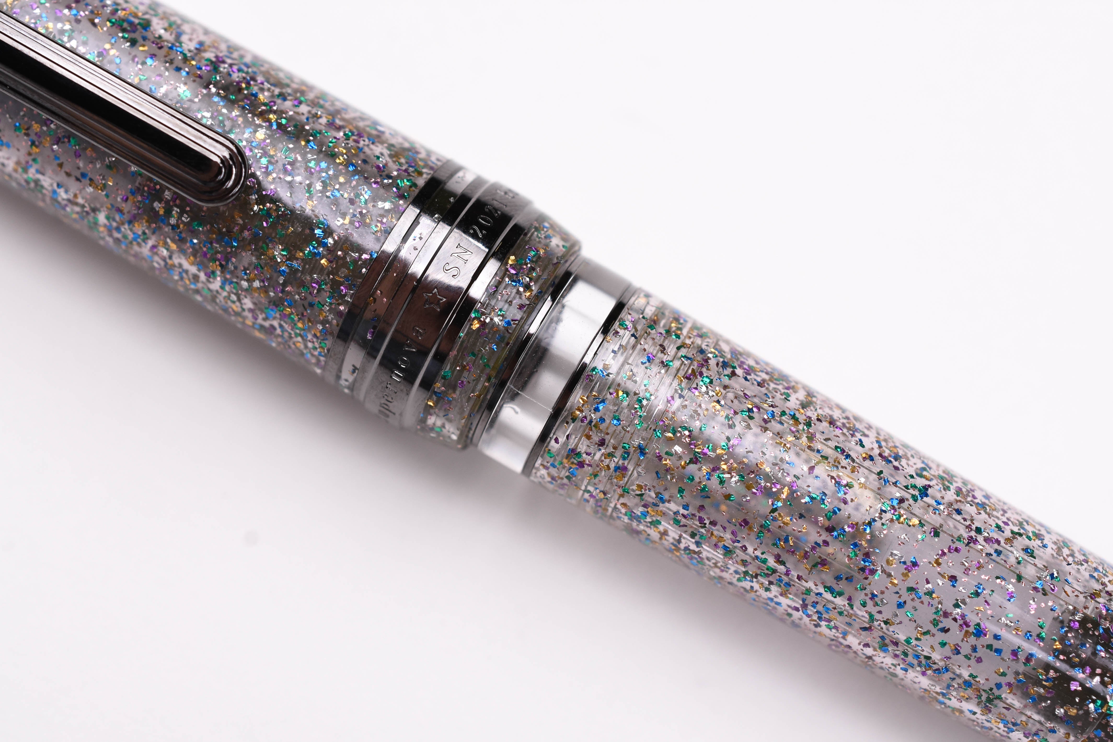 BUNGUBOX Original Fountain Pen - Supernova 2021. Originally produced to commemorate the 2021 Tokyo Pen Show, the Supernova features a transparent resin body inlaid with six different colors of lame and black-ion detailing. Bungubox is re-releasing the Supernova in July of 2023. In the 2023 version, the starburst finial has been changed from raden to maki-e.