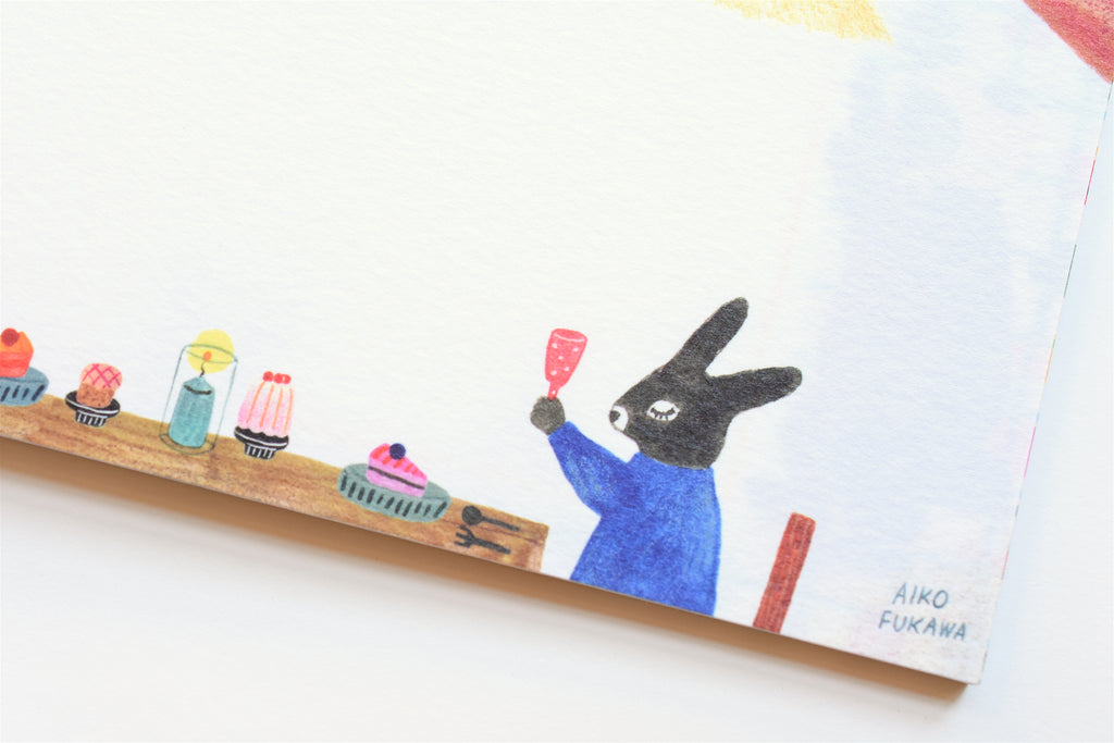 Aiko Fukawa is an illustrator who creates art used for advertisements, book covers, stationery, magazines, children's picture books and more. She has published an art book called Holiday Art Works and a coloring book entitled Four Seasons. We love her playful illustrations and can see why they would be the perfect choice for children's picture books. Her Instagram bio reads "ILLUSTRATOR. I LOVE CAT" and her love of cats is clearly evident in many of her fun works. These note pads, made with Mino washi paper and designed in collaboration with Aiko Fukawa, feature her fun and playful illustrations, which often include personified animals engaging in human activities.