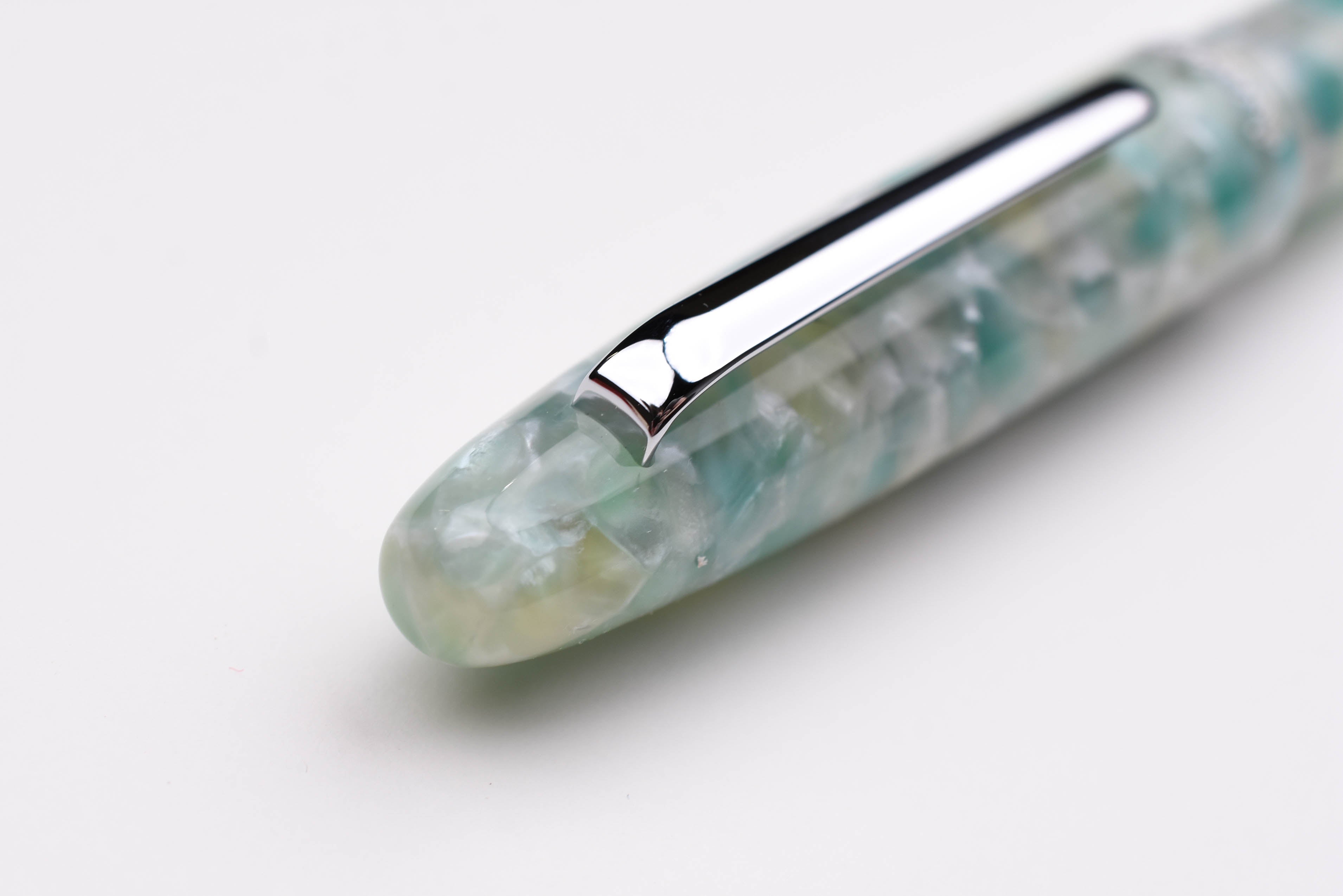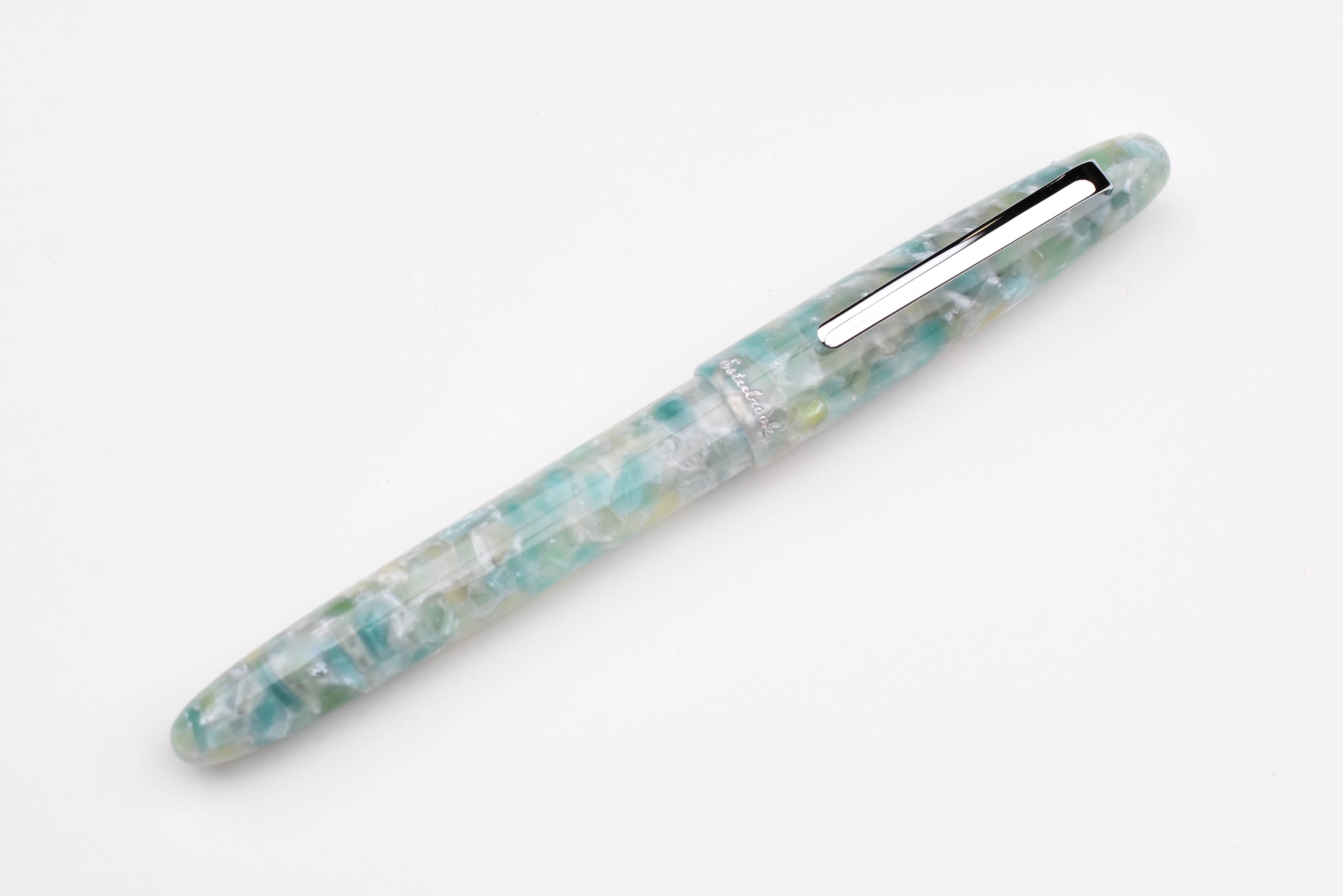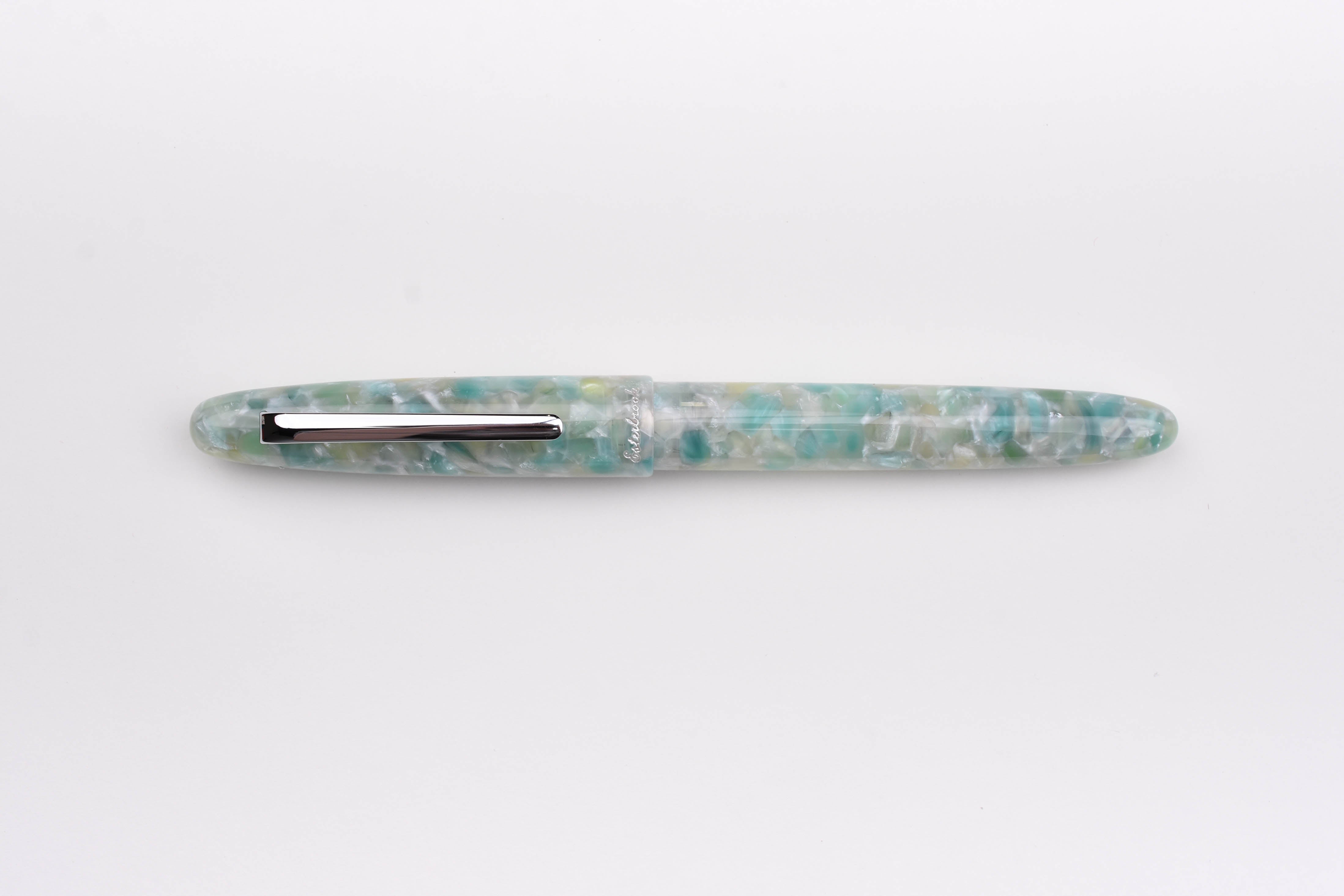 The Estie in Sea Glass is a speckled light green and blue pen with silver trim. It is a classic look for this style of pen.