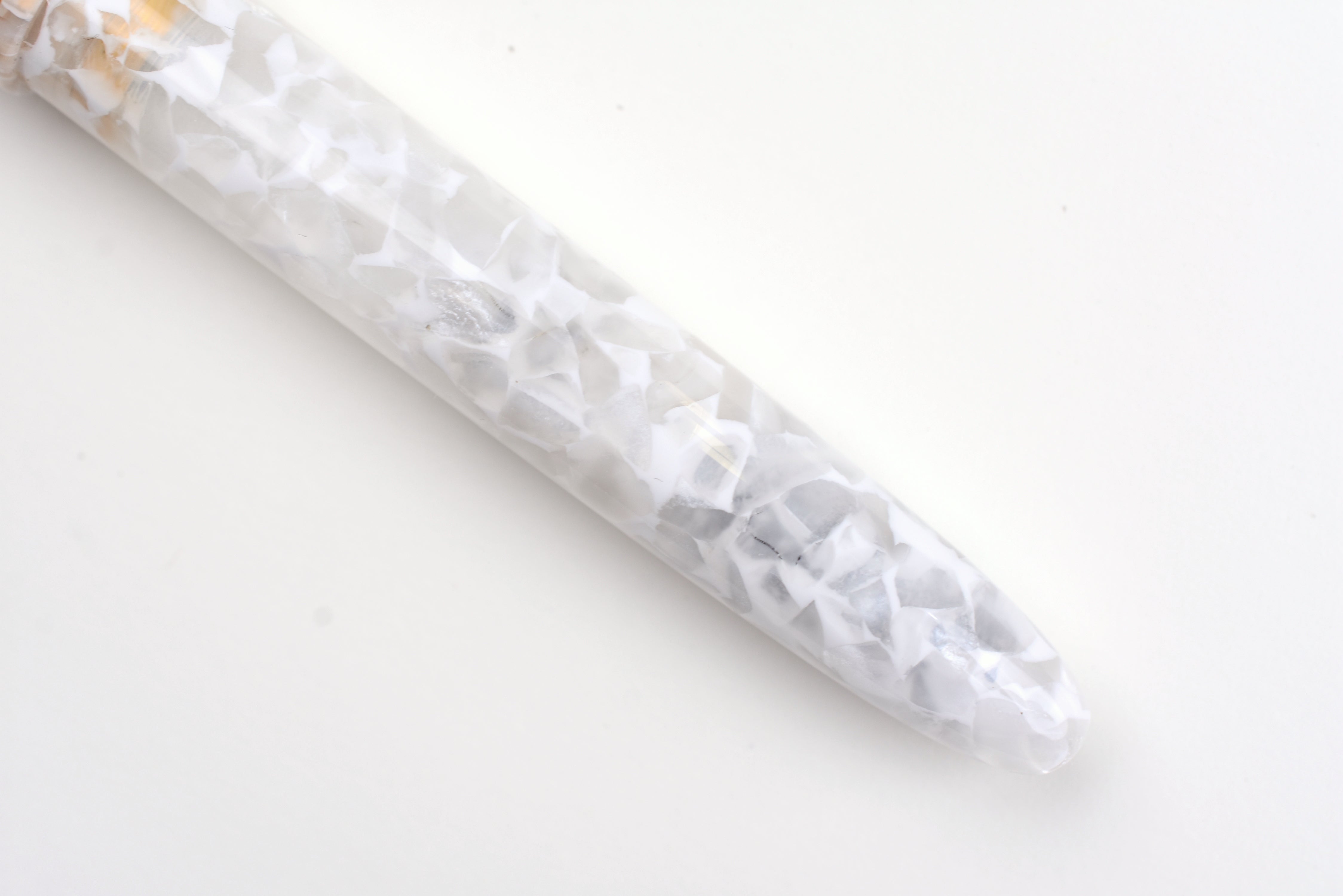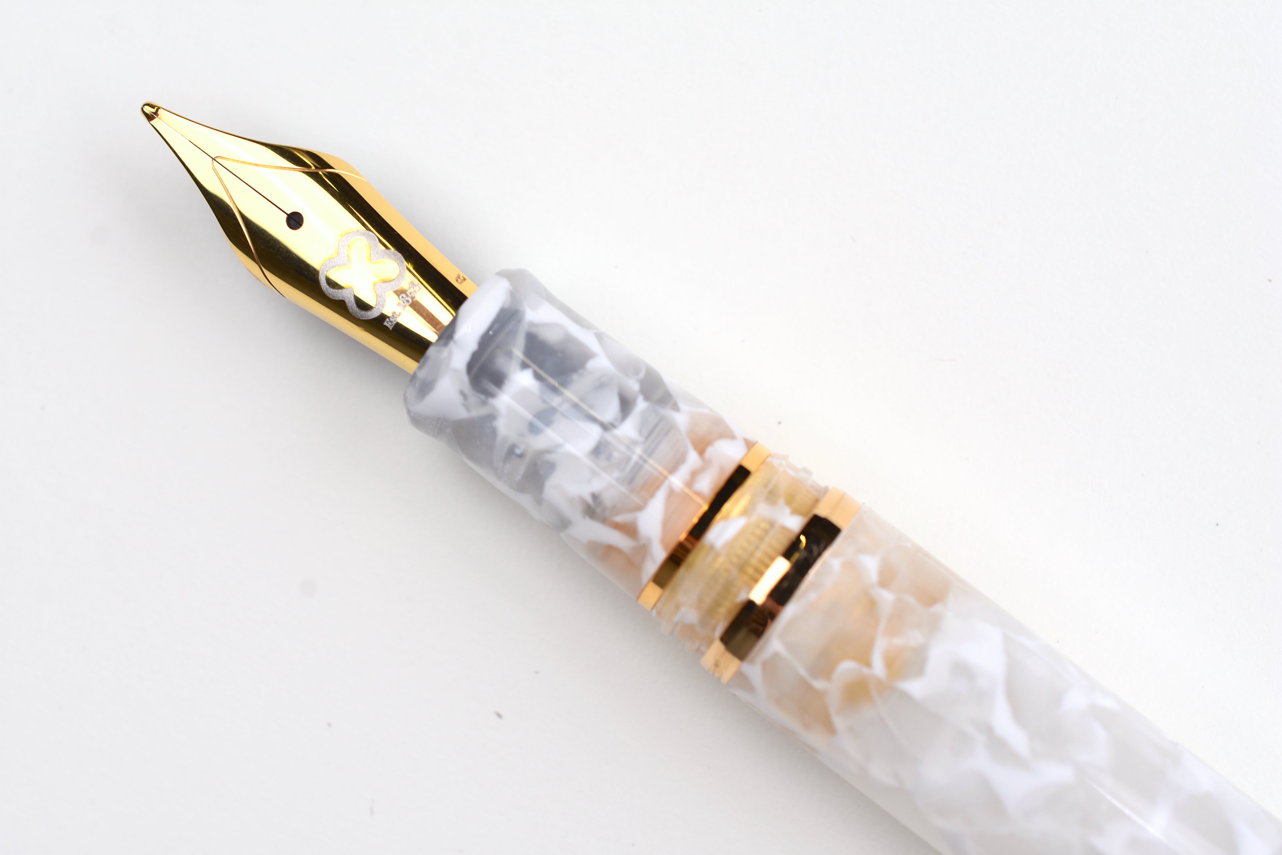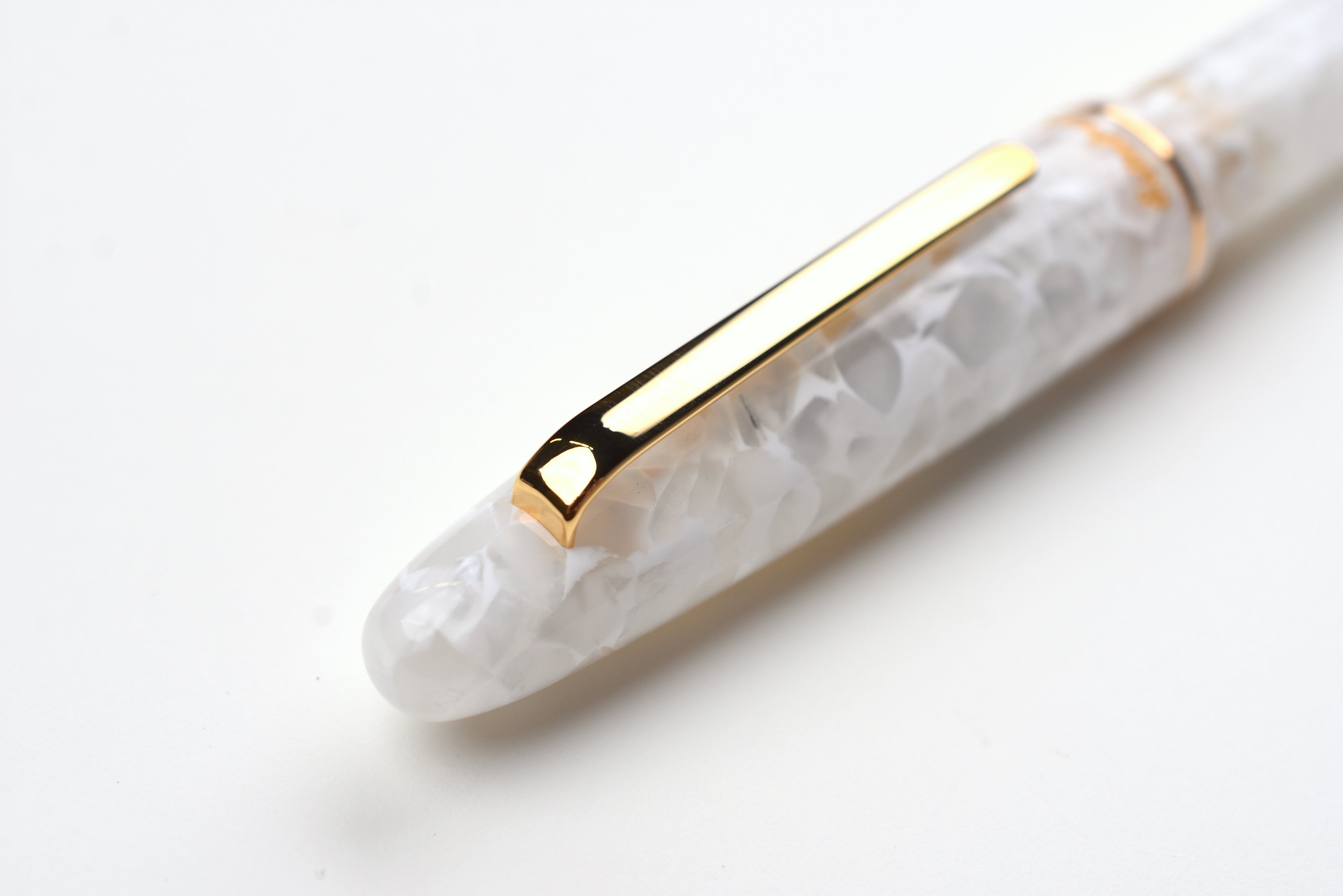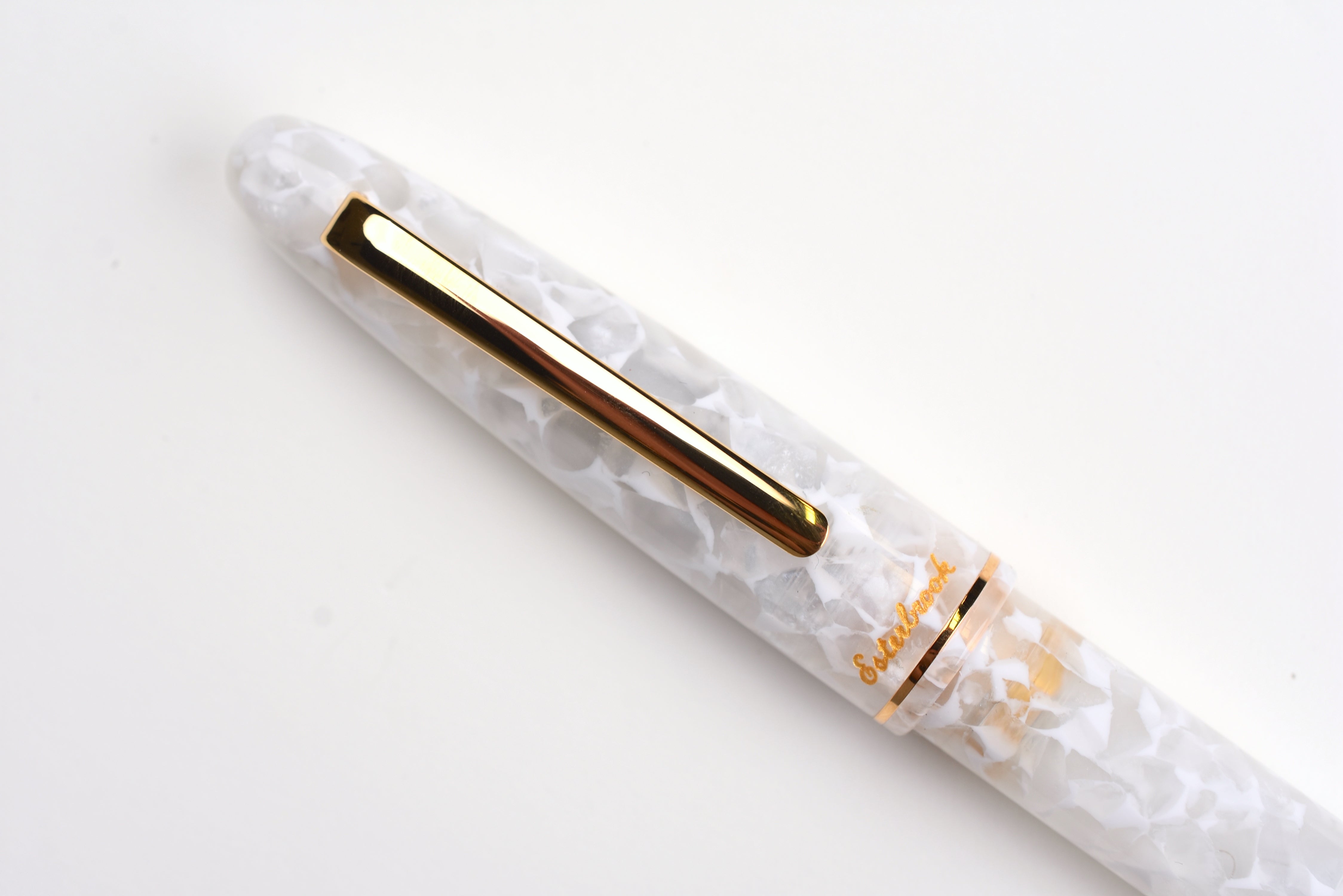 The Estie in Winter White is a limited time production crafted from snow-white acrylic accented with gold trim. Its translucent design is reminiscent of pure fallen snow, or the swirling ice patterns on a frozen lake. The Push Piston edition is also available.
