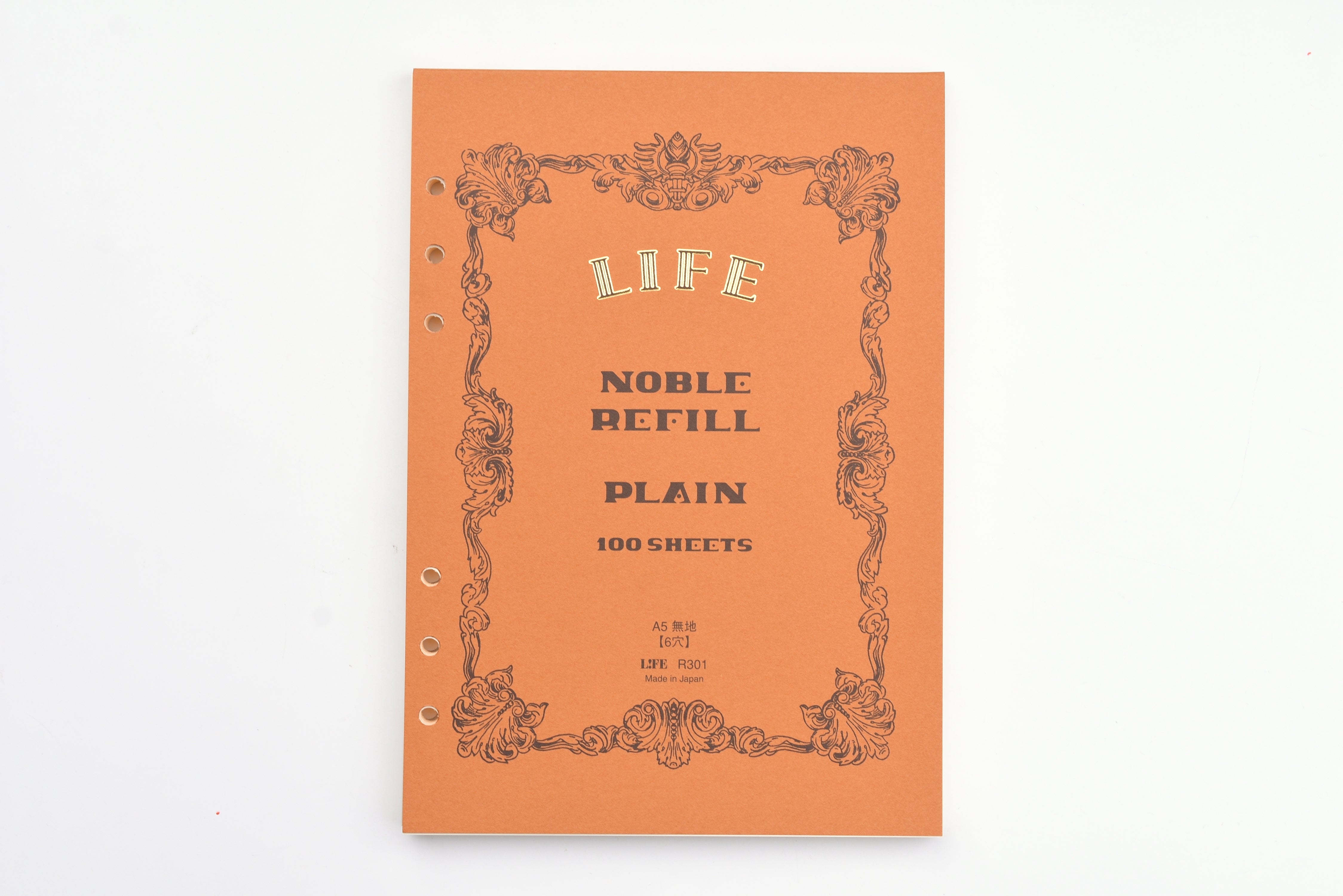 This "Noble Note" Notebook line by Life features generous refills for A5-sized binder or ringed planners. They come in a pack of 100 sheets of Life's high quality cream-colored paper. These refill pages are 6-ringed and will be compatible with classic A5 binders. Each notebook style (plain, section and ruled) comes in a brightly colored soft card stock paper cover with a vintage style border. Inside this notebook, you will find exceptionally smooth, acid-free paper that's great for fountain pen writing.