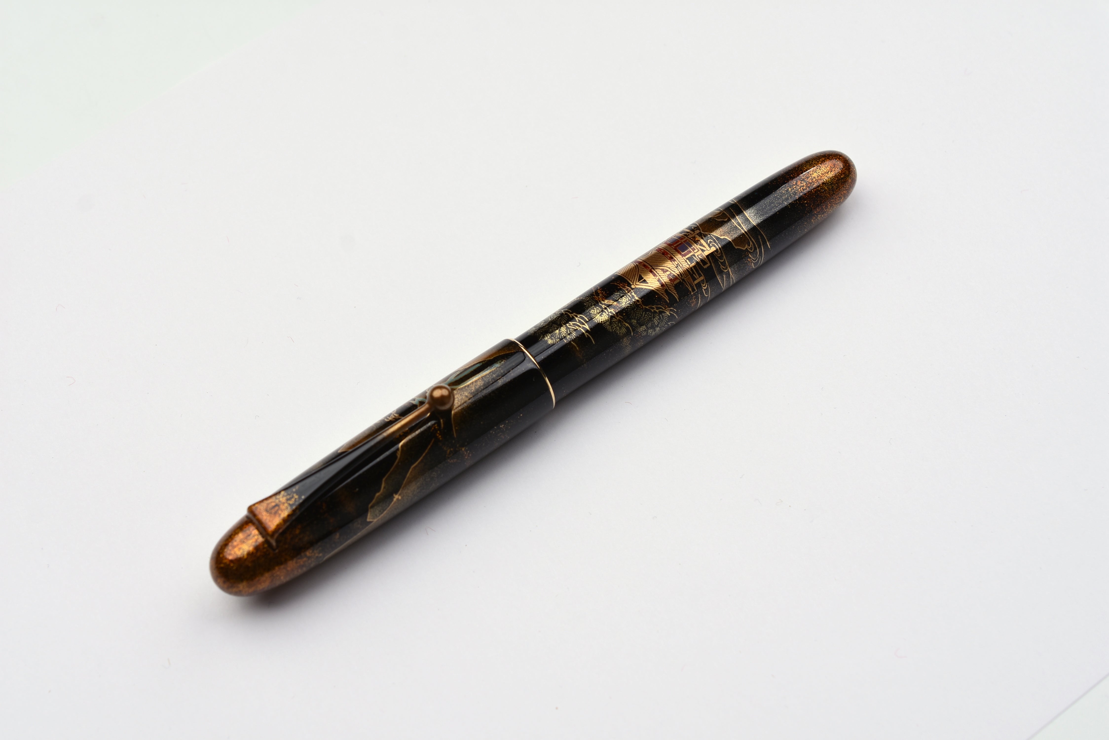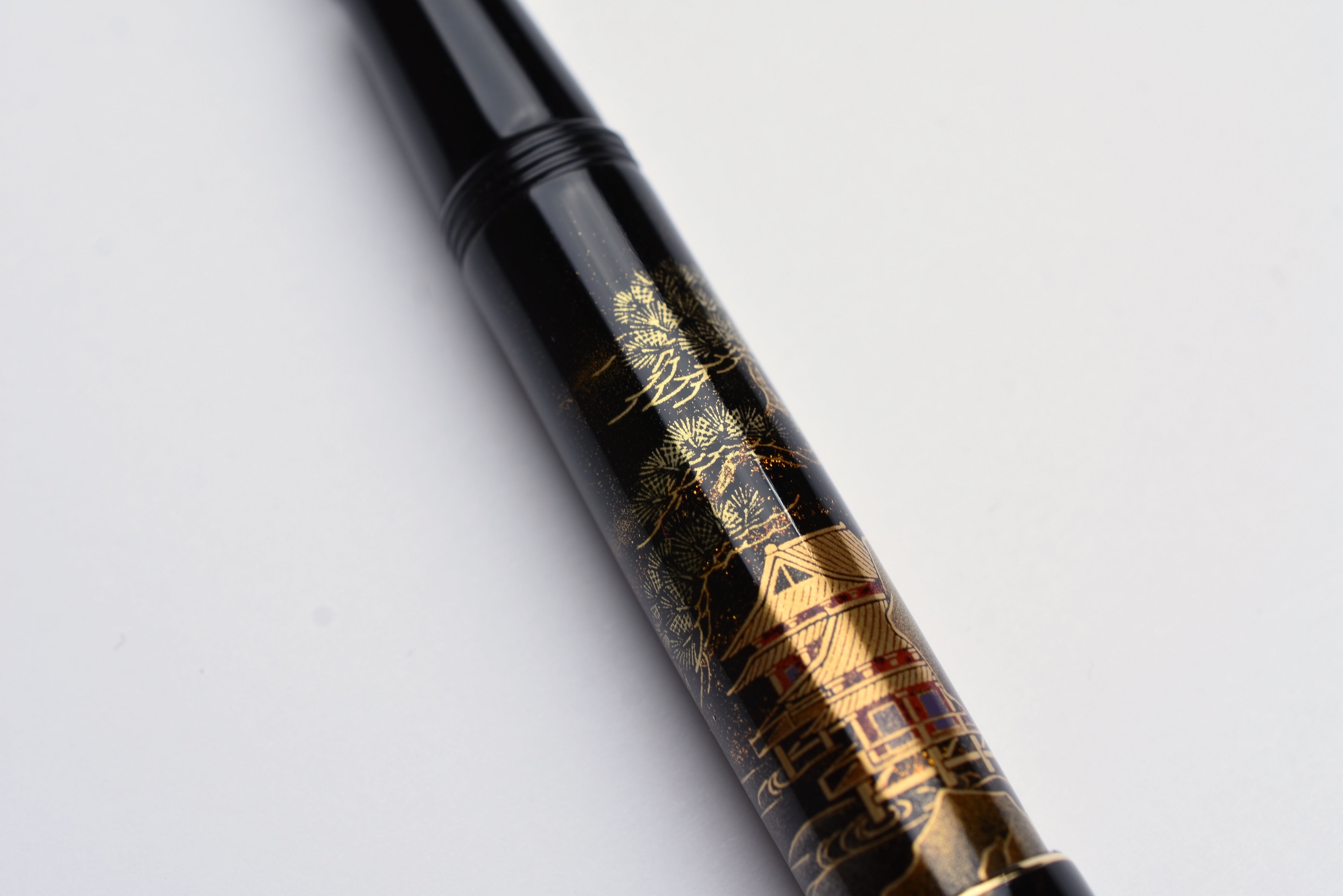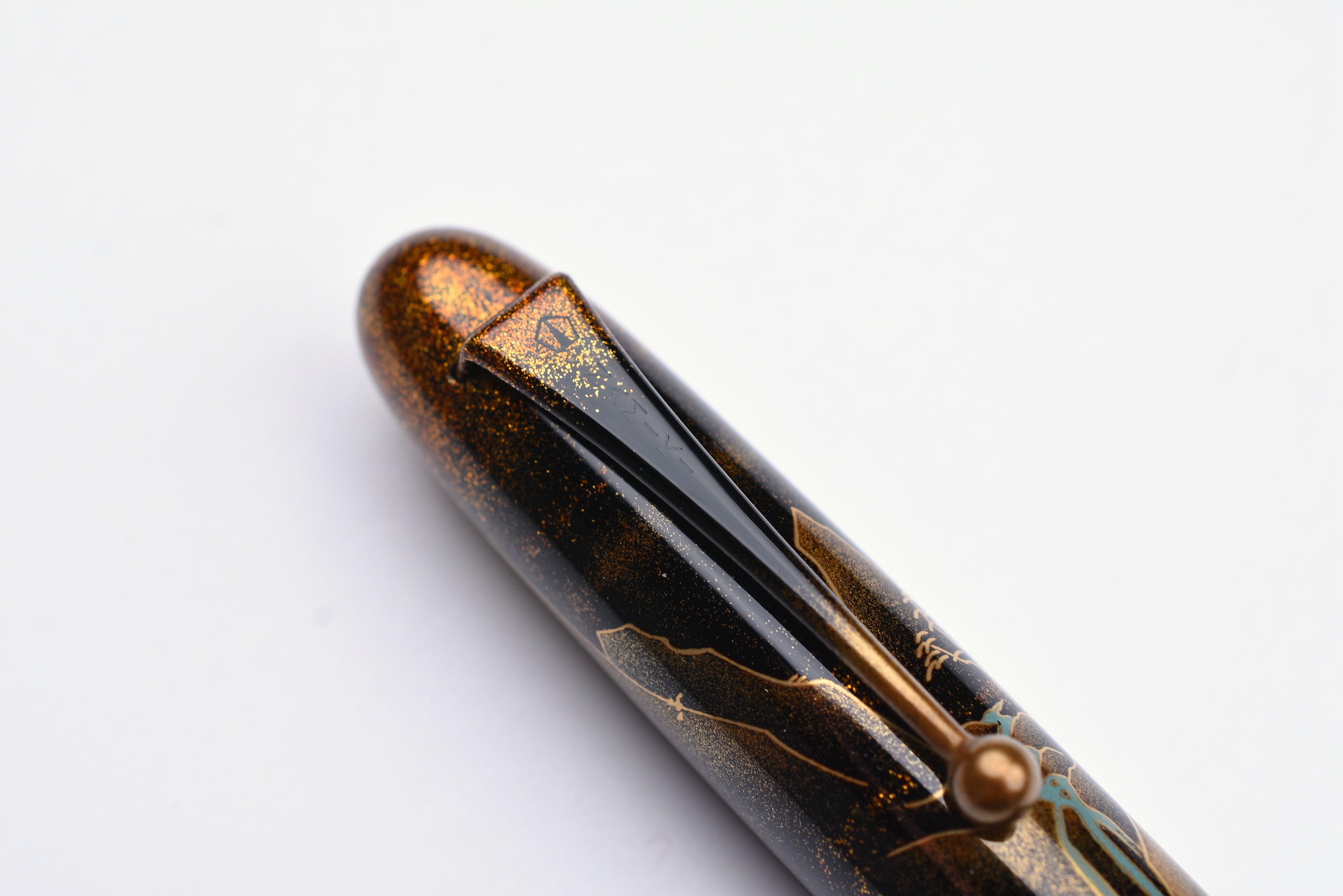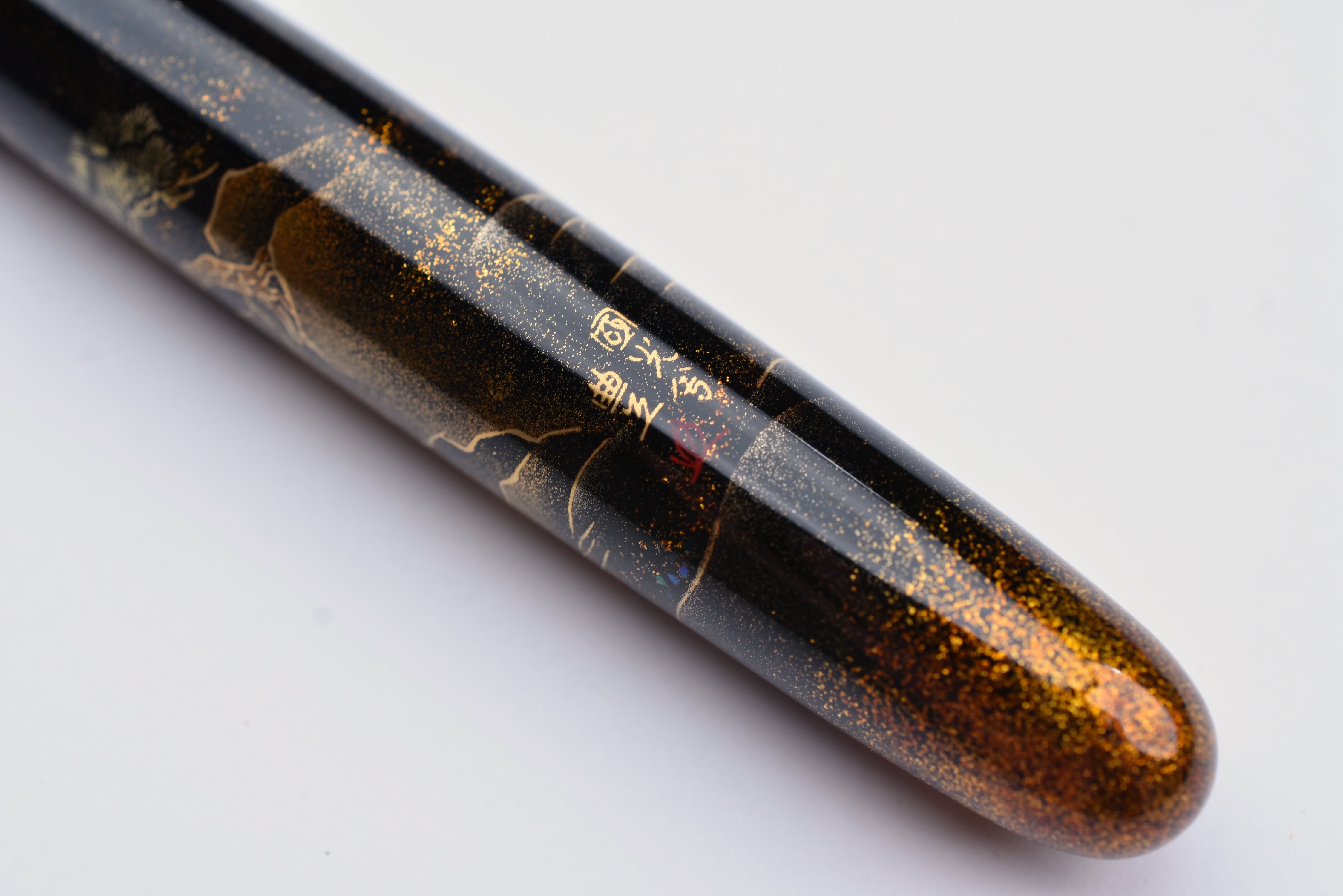 The pens in Namiki's Yukari Royale Collection feature elegant designs on a large ebonite body and size #20 18k gold nib. The motifs are created through the highly advanced Togidashi-Taka Maki-e technique (Burnished-Raised Maki-e), also applied in the creation of pens in Namiki's Emperor collection. First, Togidashi Maki-e (Burnished Maki-e) is used; the background and scenery are painted with lacquer, which are then sprinkled with gold or silver powder and sealed with Urushi lacquer. After drying, the surface is lightly burnished with charcoal, revealing the design underneath. Then, the main design is further rendered through additional use of materials like lacquer and charcoal powder. Finally, Hira-Maki-e (Flat Maki-e) is used to create the last details with layers of metal powder and lacquer. (The Pilot-Namiki website also provides a fascinating peek into the steps of the process here.)