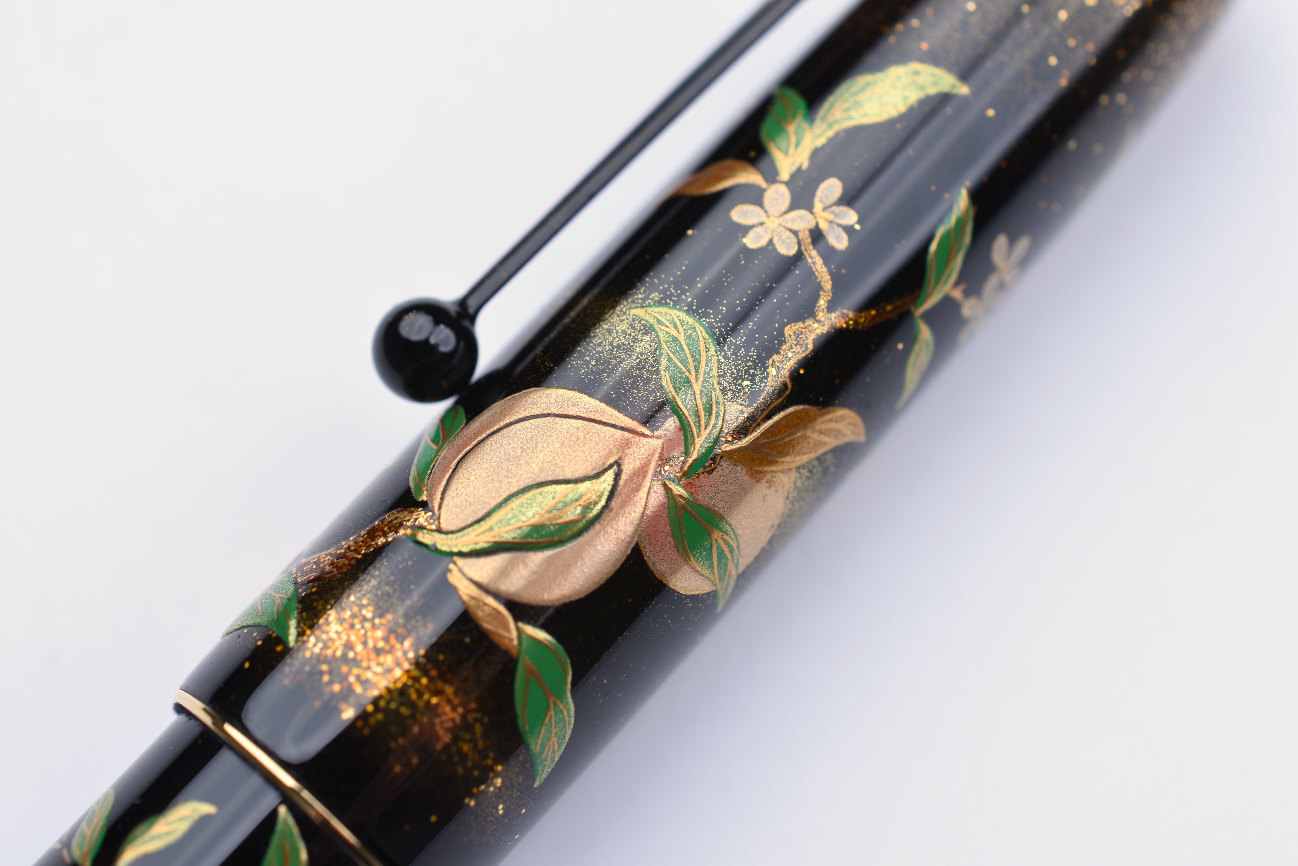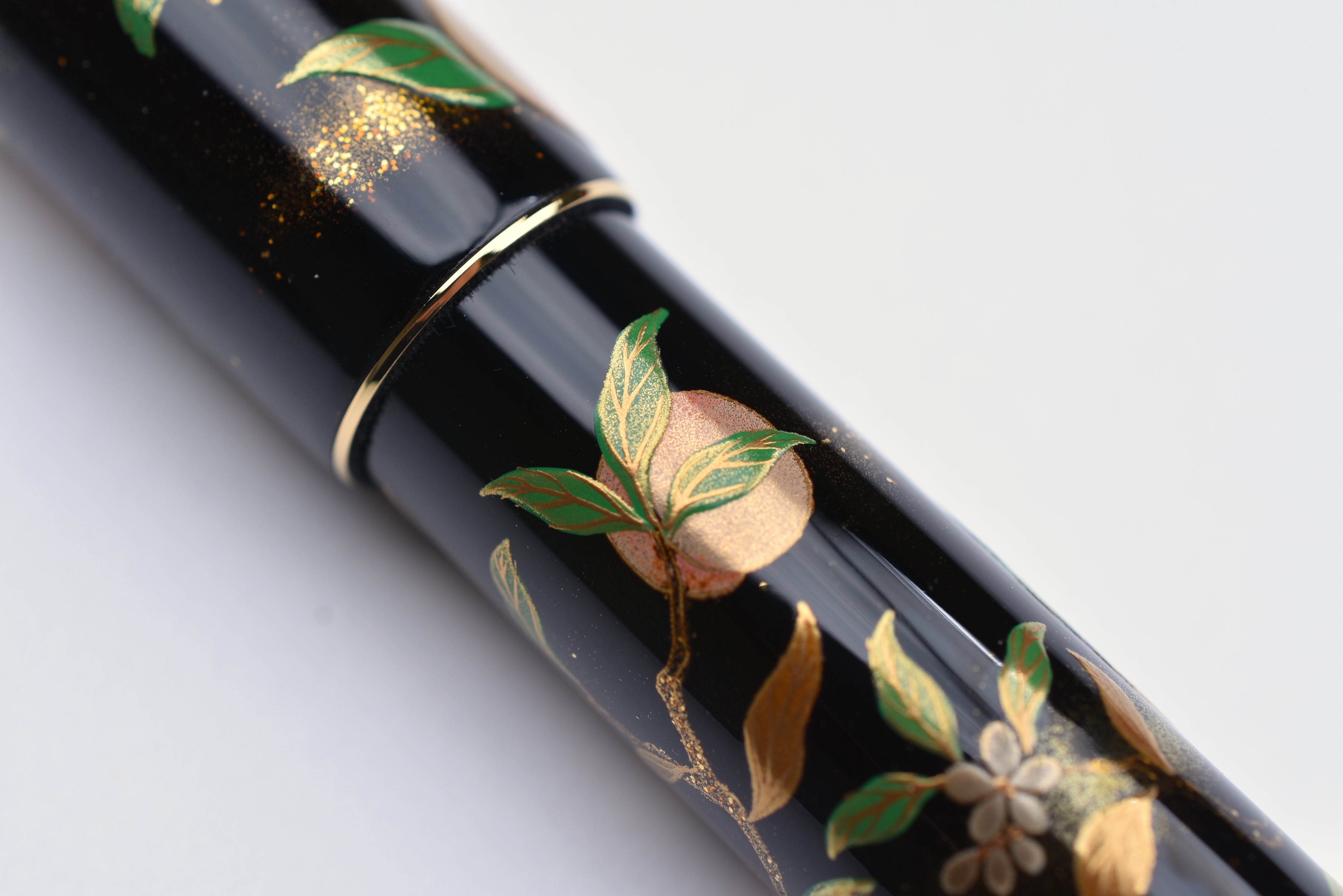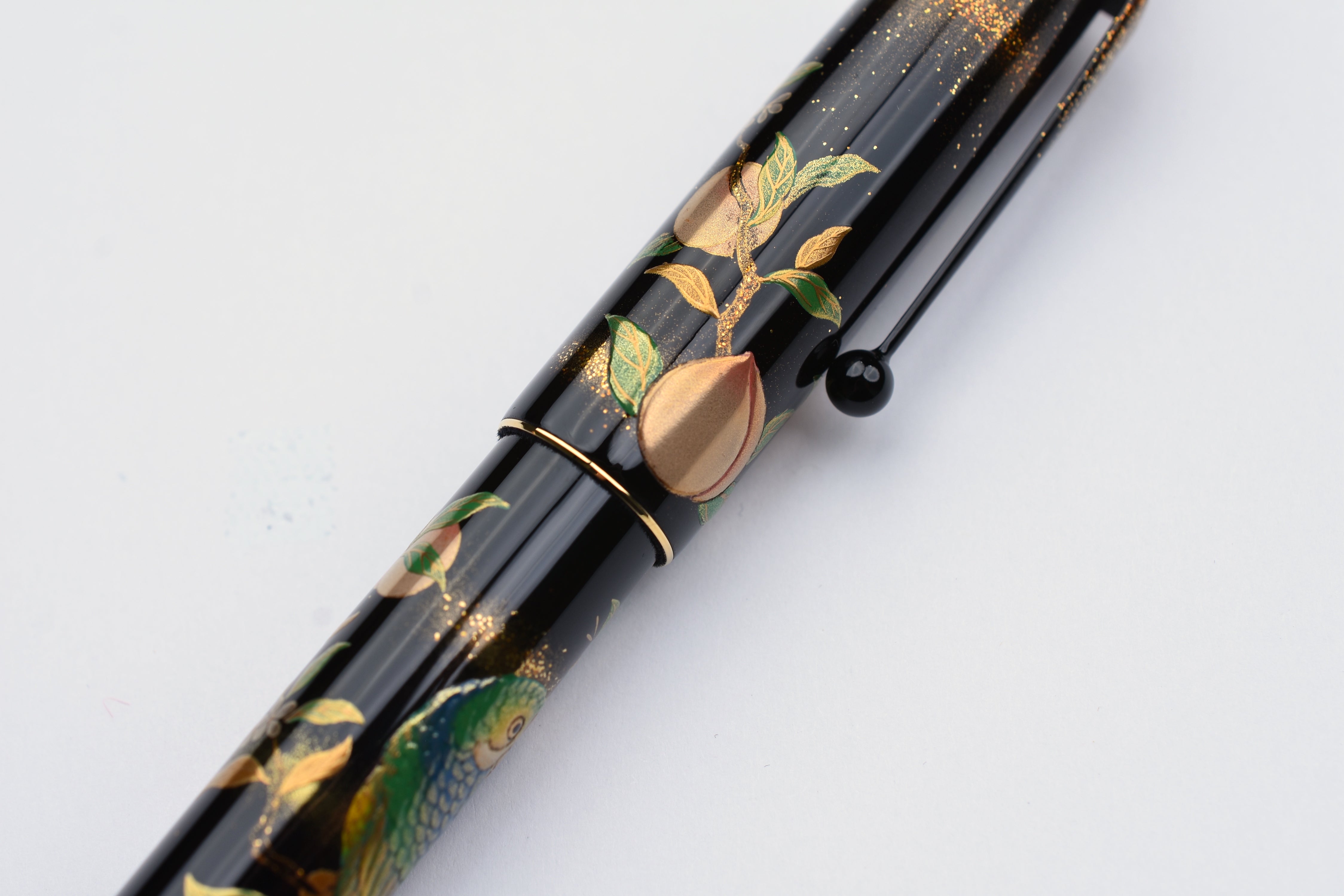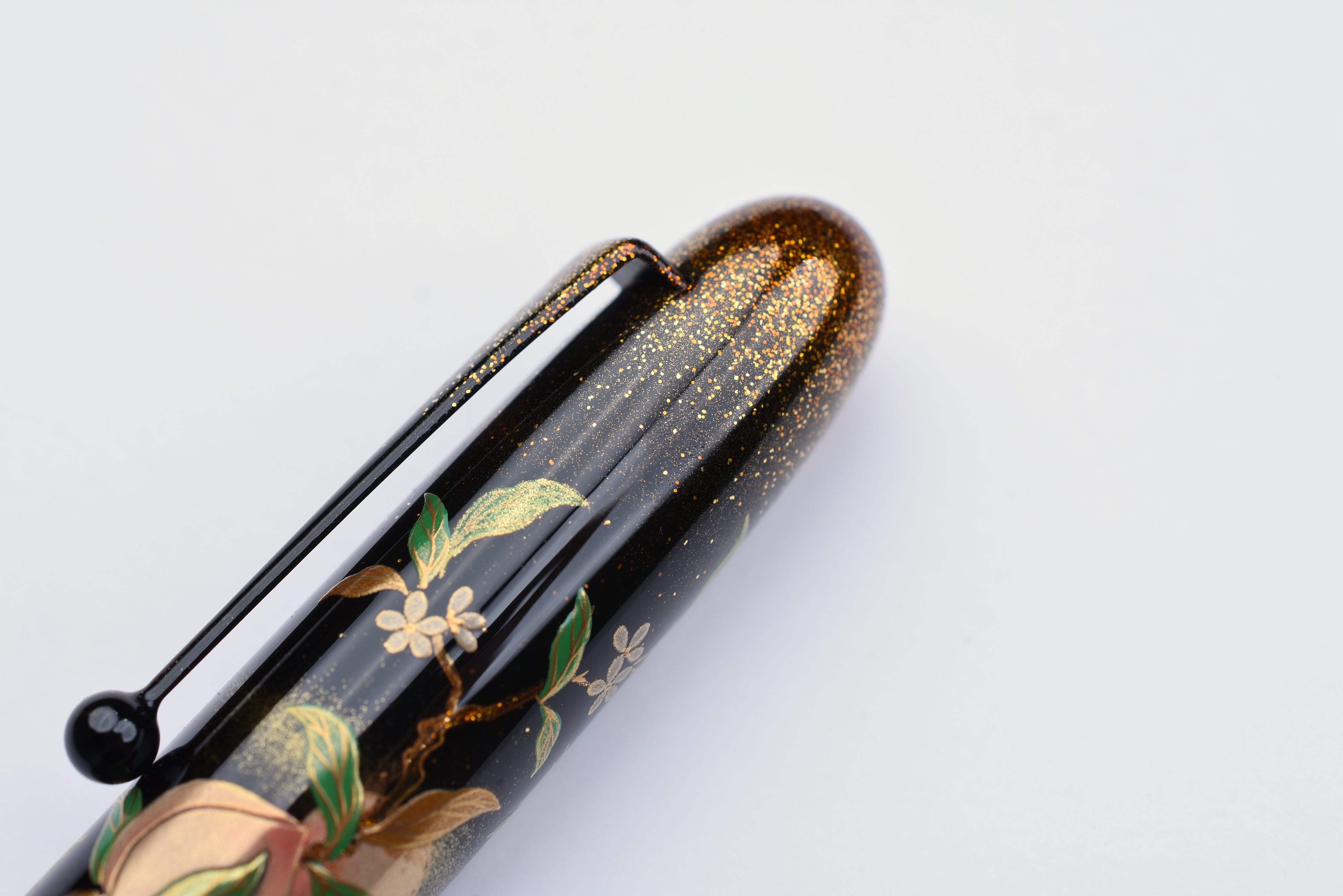 The pens in Namiki's Yukari Royale Collection feature elegant designs on a large ebonite body and size #20 18k gold nib. The motifs are created through the highly advanced Togidashi-Taka Maki-e technique (Burnished-Raised Maki-e), also applied in the creation of pens in Namiki's Emperor collection. First, Togidashi Maki-e (Burnished Maki-e) is used; the background and scenery are painted with lacquer, which are then sprinkled with gold or silver powder and sealed with Urushi lacquer. After drying, the surface is lightly burnished with charcoal, revealing the design underneath. Then, the main design is further rendered through additional use of materials like lacquer and charcoal powder. Finally, Hira-Maki-e (Flat Maki-e) is used to create the last details with layers of metal powder and lacquer. (The Pilot-Namiki website also provides a fascinating peek into the steps of the process here.)