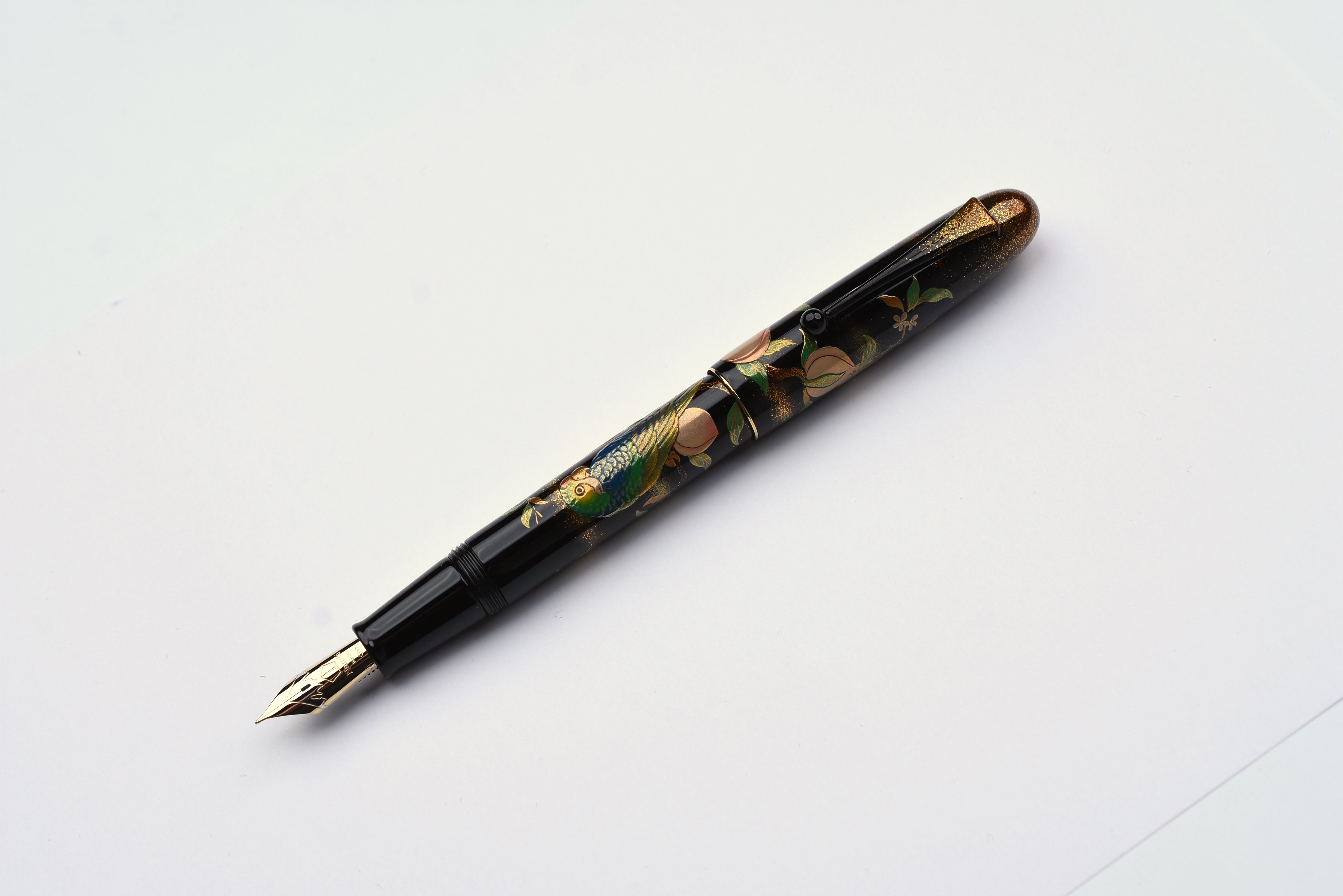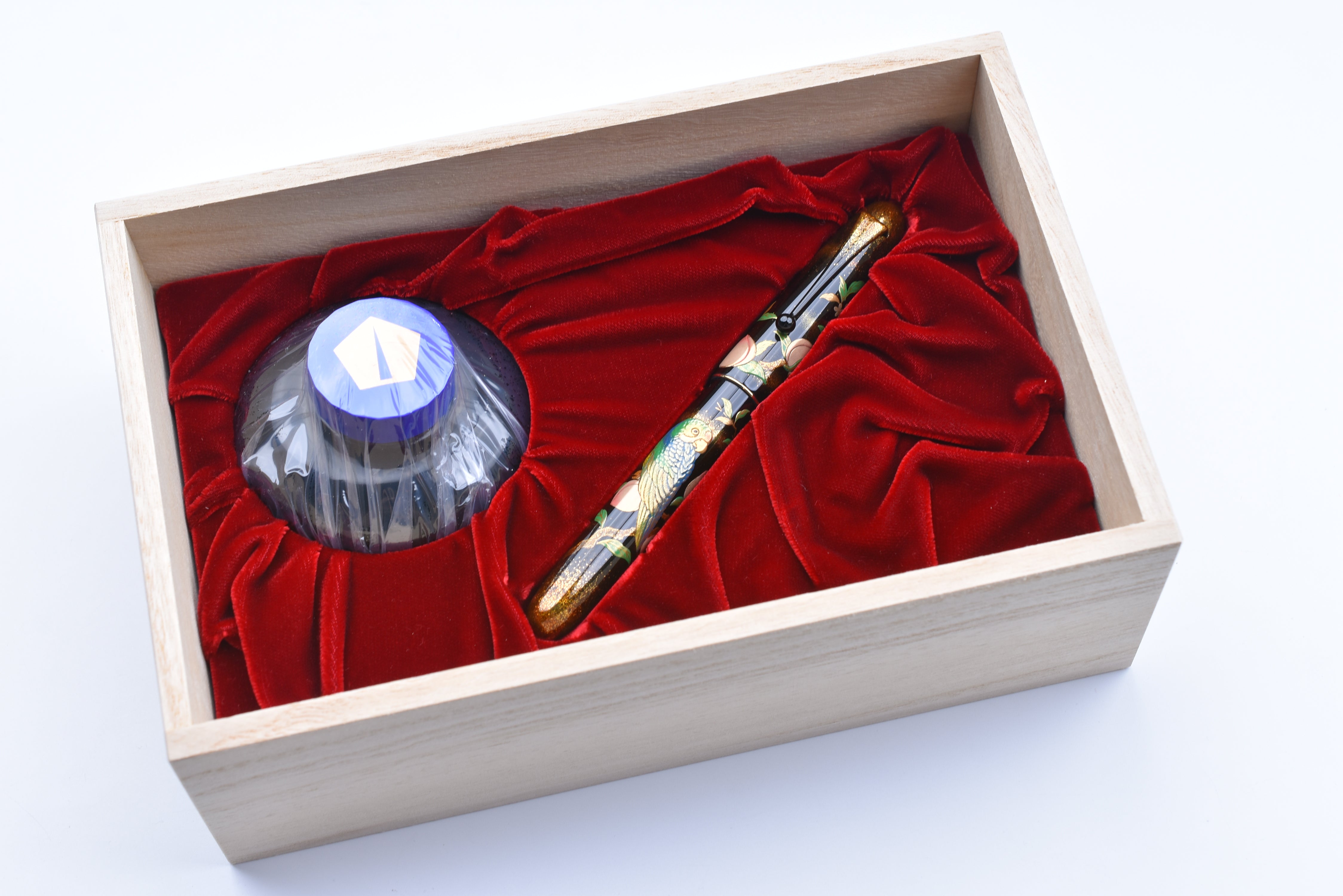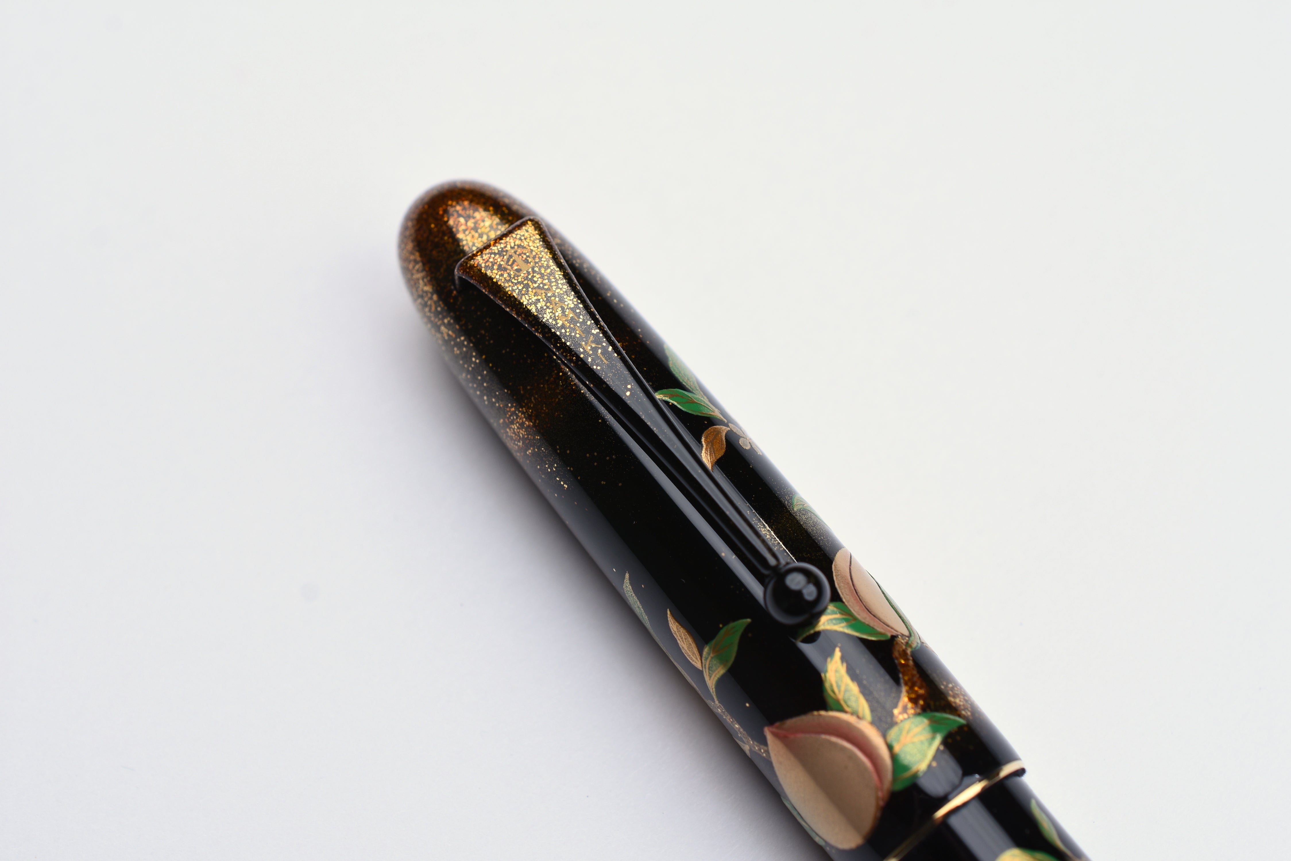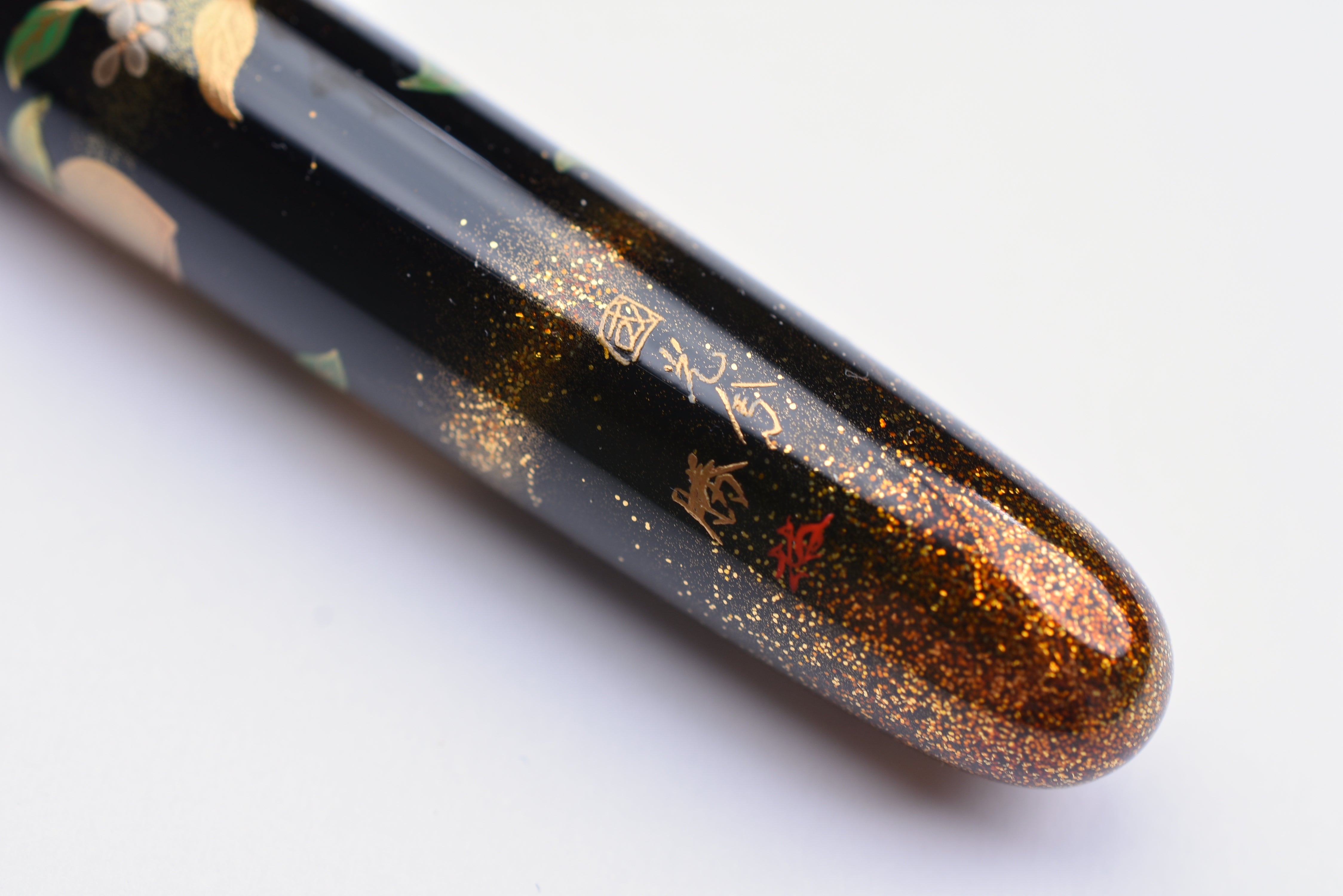 The pens in Namiki's Yukari Royale Collection feature elegant designs on a large ebonite body and size #20 18k gold nib. The motifs are created through the highly advanced Togidashi-Taka Maki-e technique (Burnished-Raised Maki-e), also applied in the creation of pens in Namiki's Emperor collection. First, Togidashi Maki-e (Burnished Maki-e) is used; the background and scenery are painted with lacquer, which are then sprinkled with gold or silver powder and sealed with Urushi lacquer. After drying, the surface is lightly burnished with charcoal, revealing the design underneath. Then, the main design is further rendered through additional use of materials like lacquer and charcoal powder. Finally, Hira-Maki-e (Flat Maki-e) is used to create the last details with layers of metal powder and lacquer. (The Pilot-Namiki website also provides a fascinating peek into the steps of the process here.)