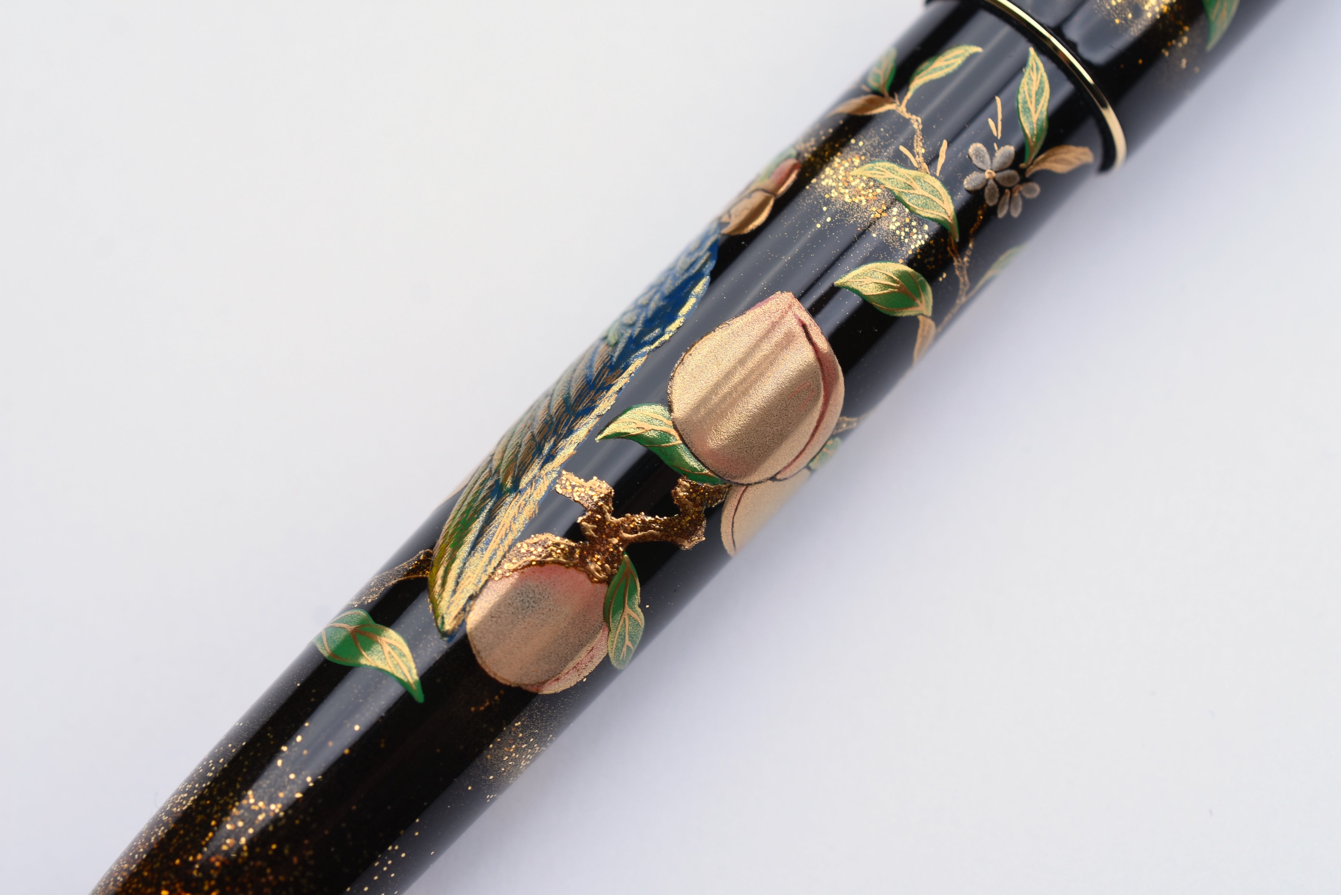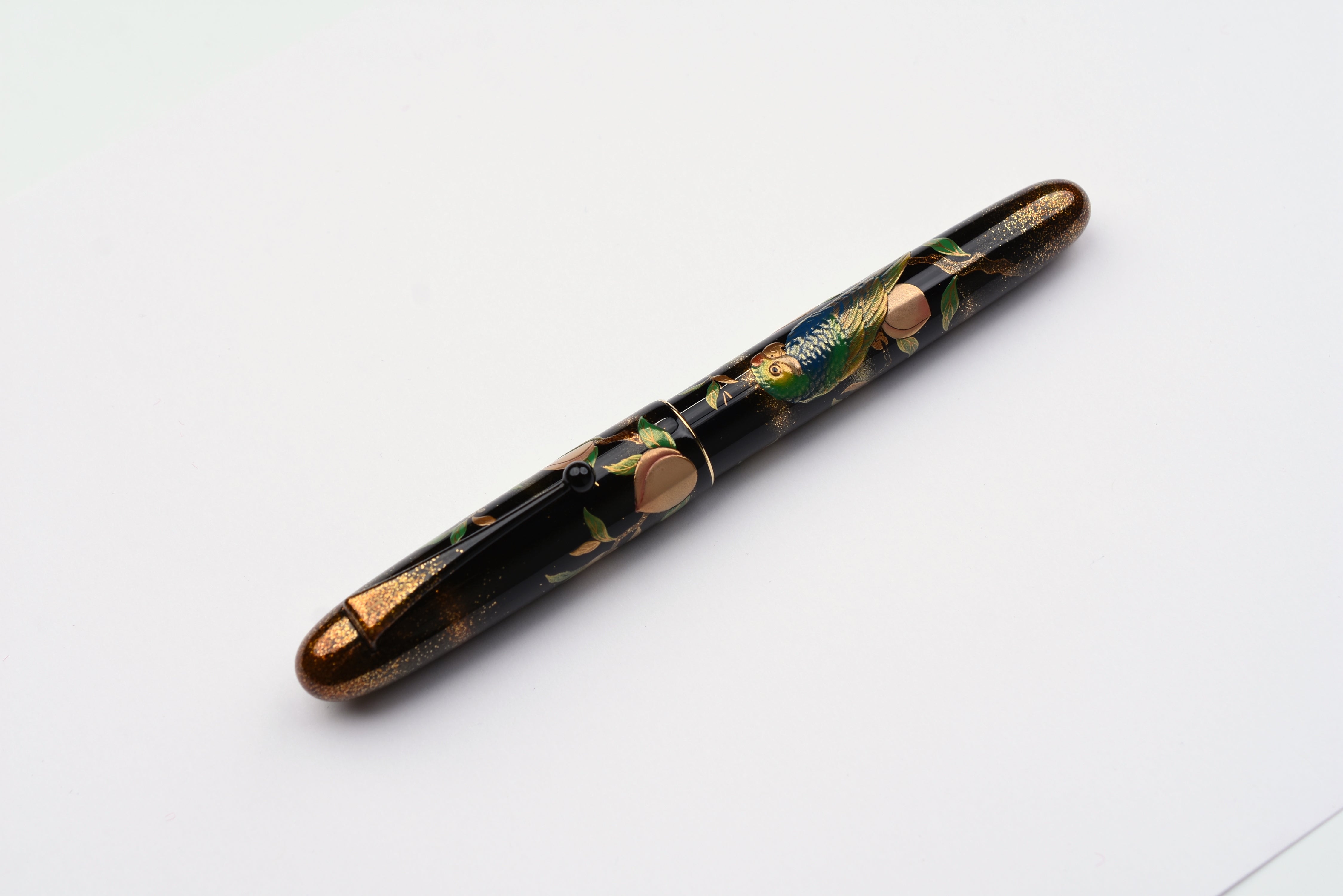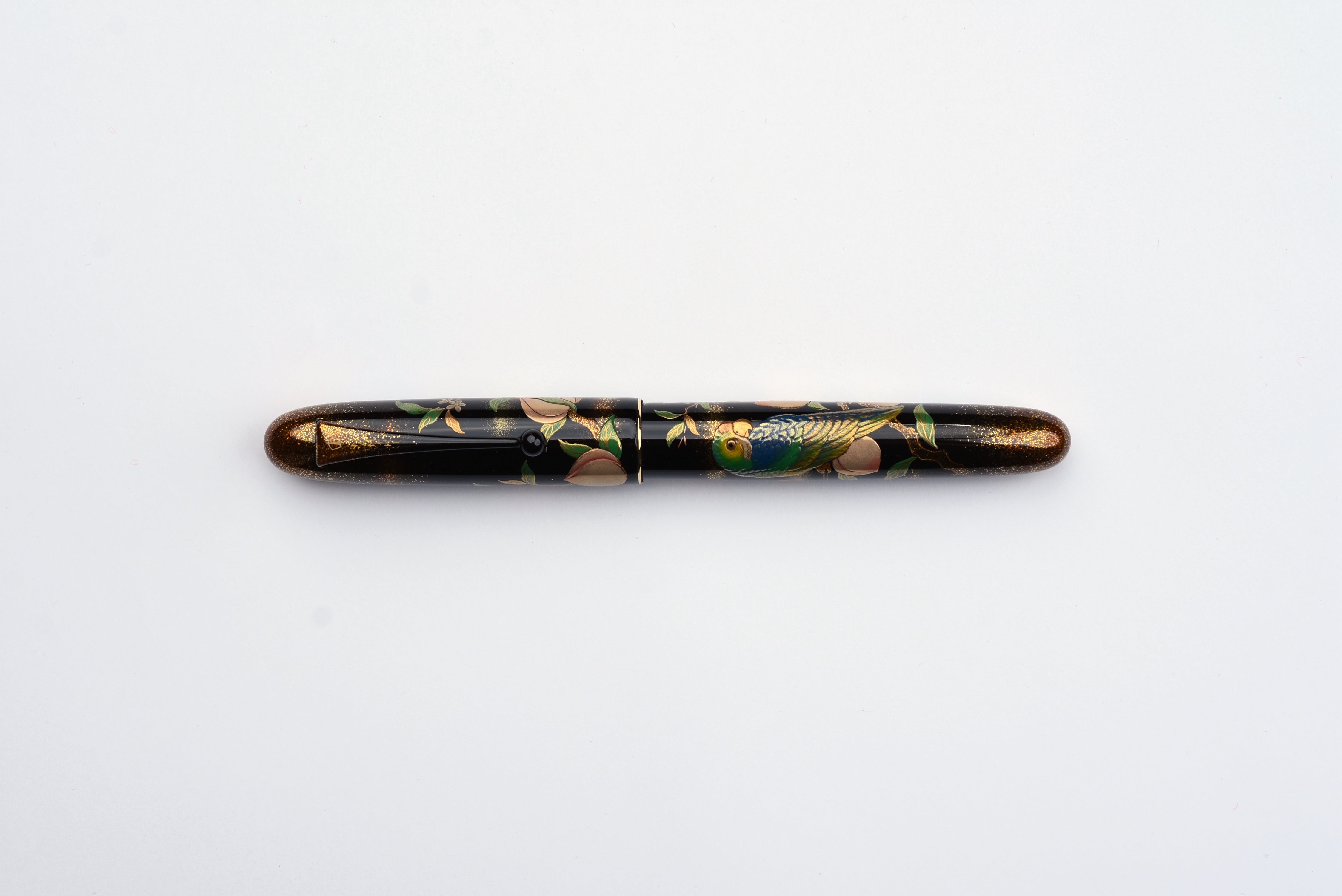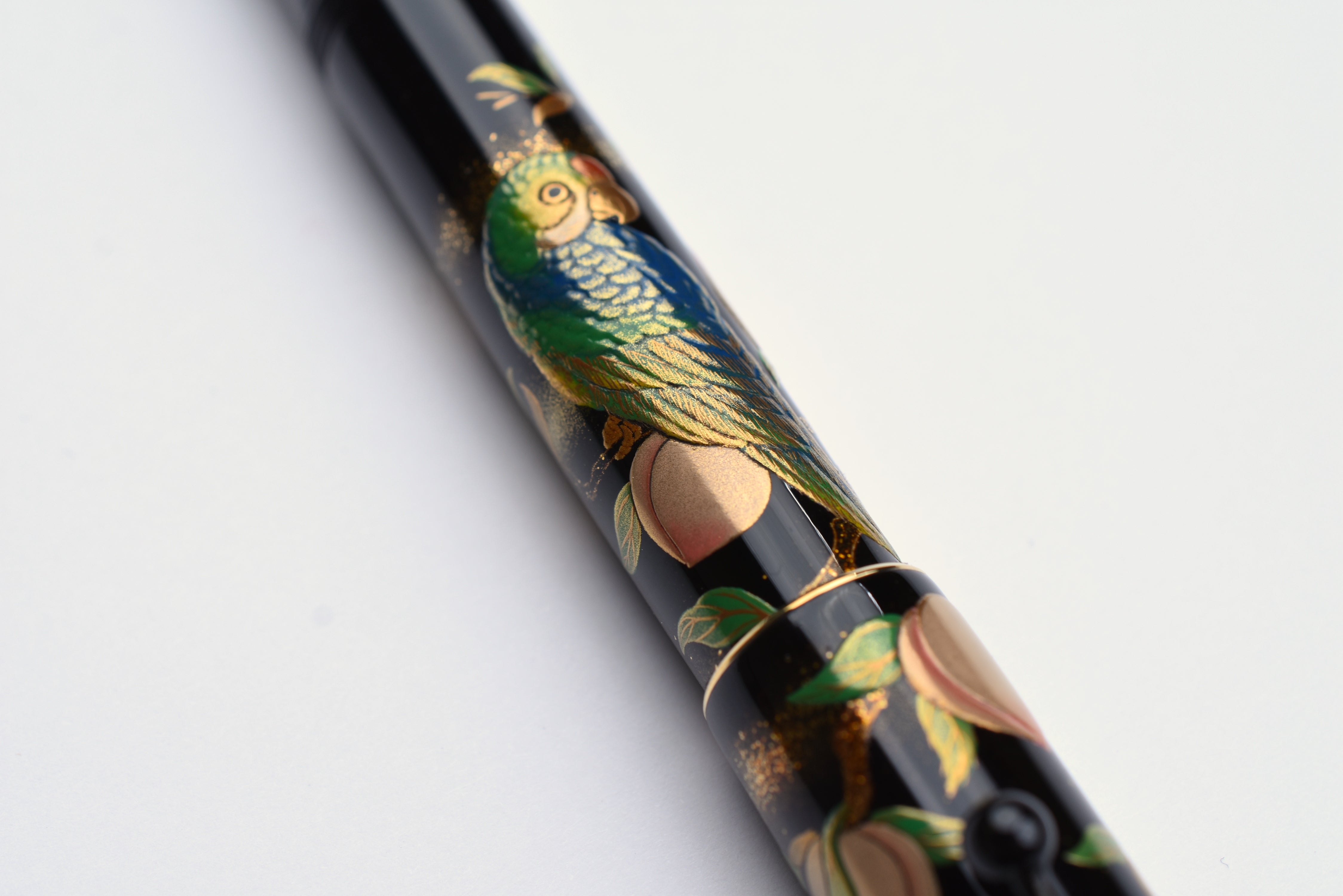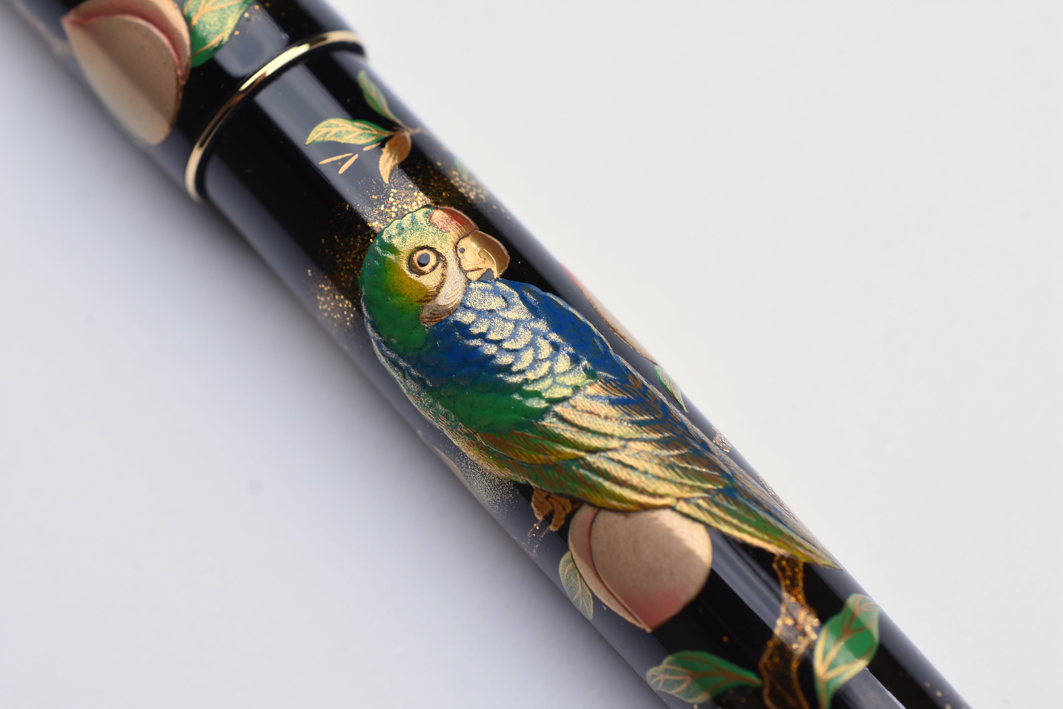 This pen displays a colorful parrot comfortably nestled among peach branches. The parrot's feathers are beautifully detailed with delicate gold lines, and the peaches seem to glow with a dusting of fine gold powder. Namiki Yukari Royale - Parrot with Peach was made by master maki-e artist Masaru Hayashi.