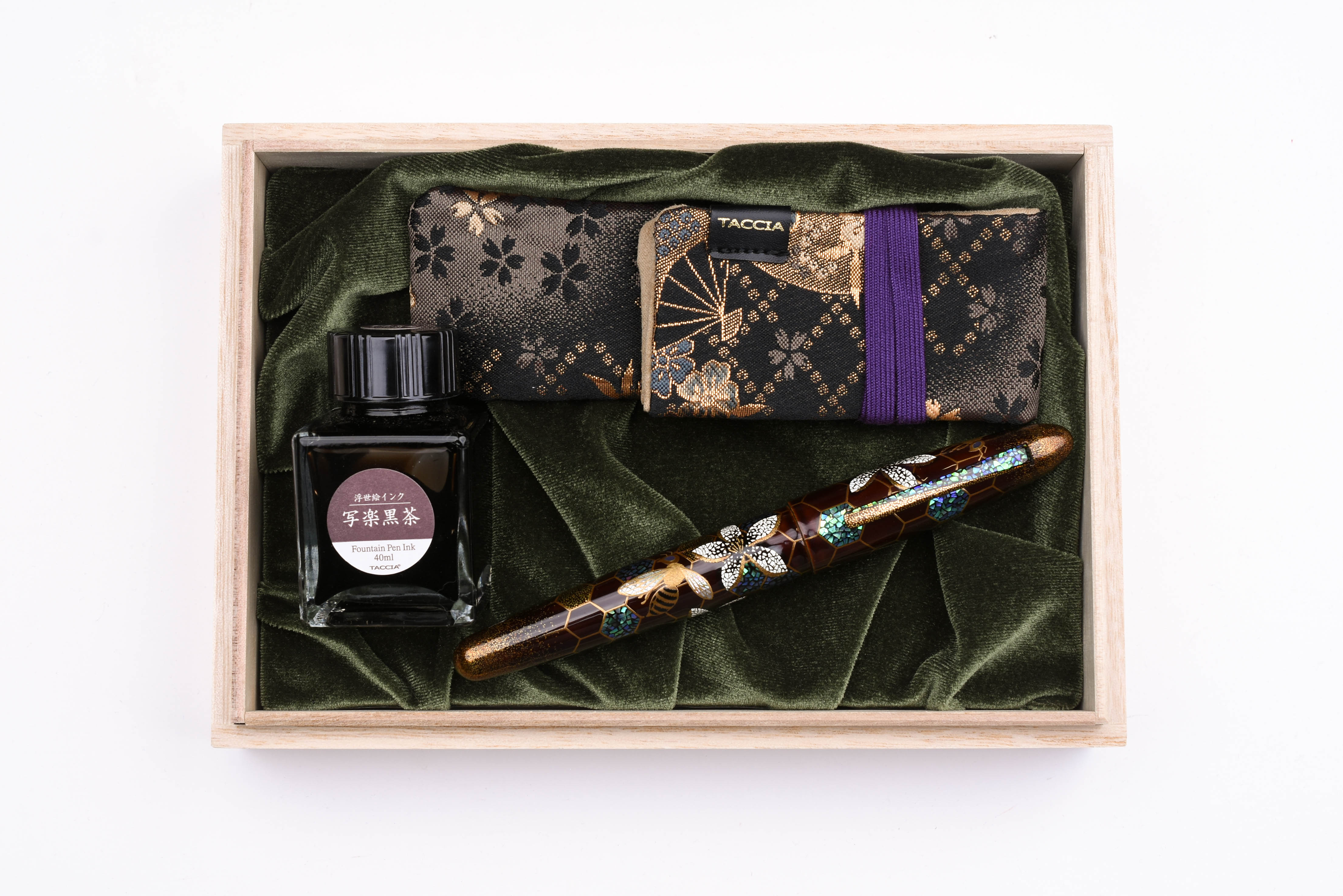 - Sailor converter, two ink cartridges, and a 40ml bottle of Taccia Ukiyo-e Kurocha (Dark Brown) included