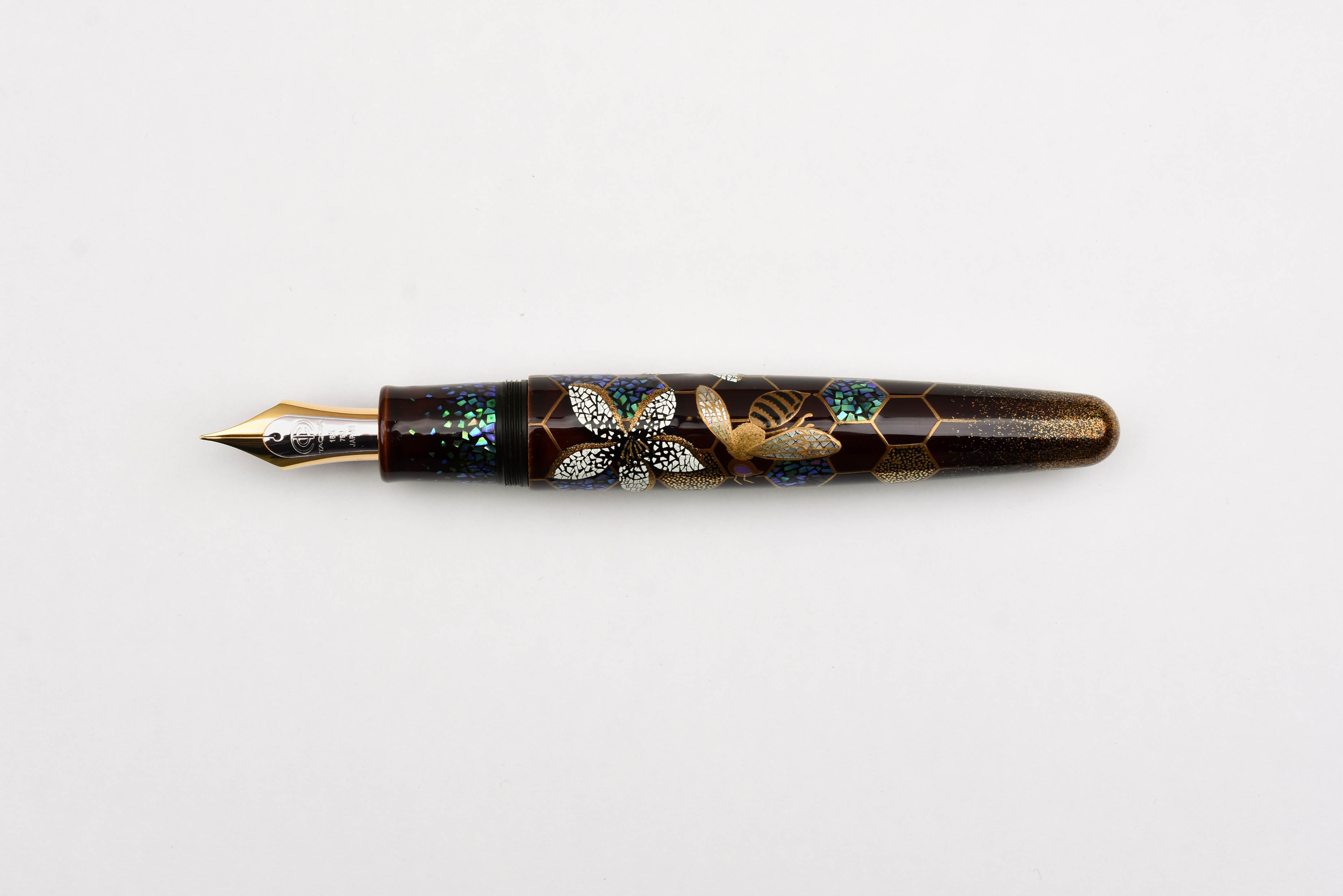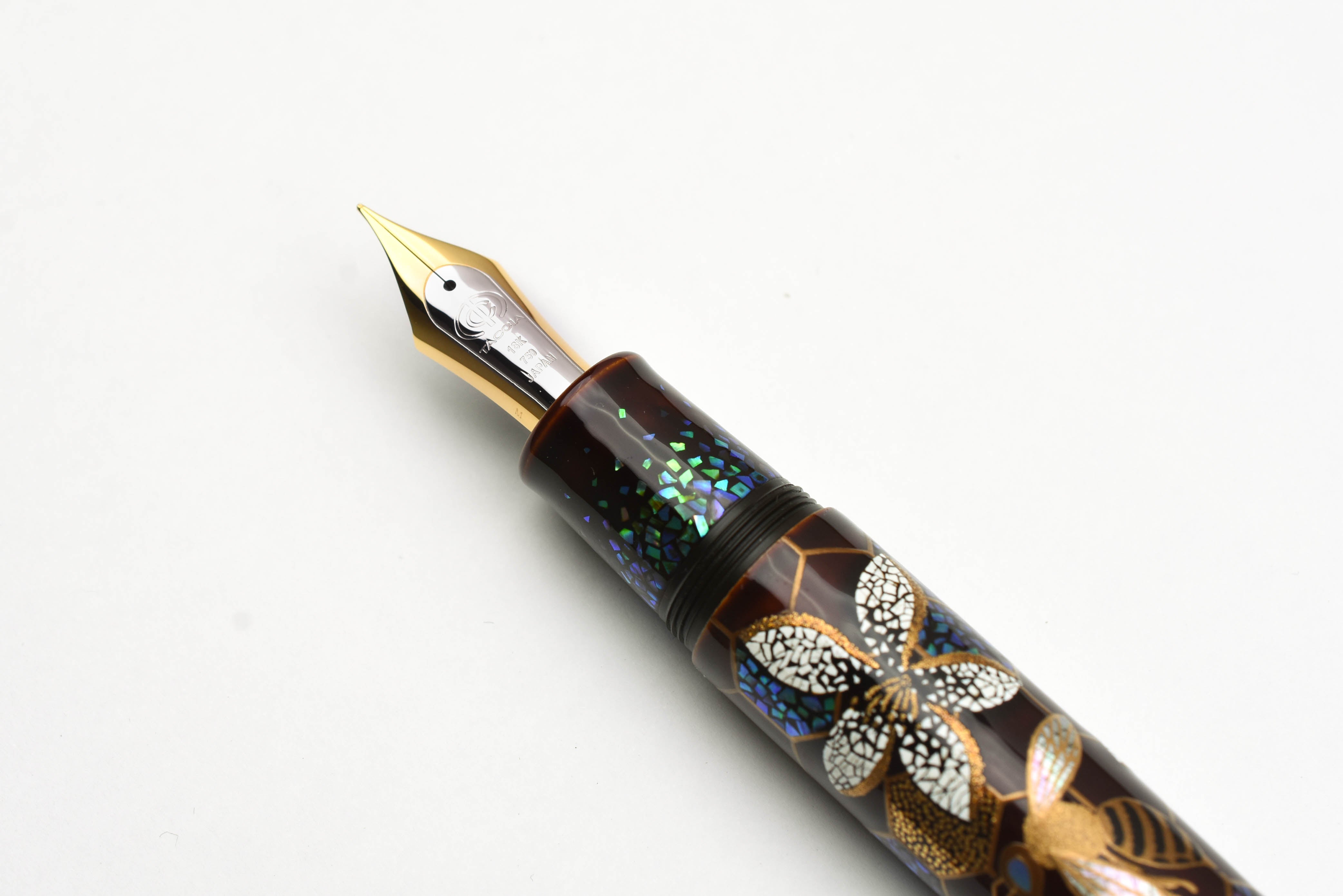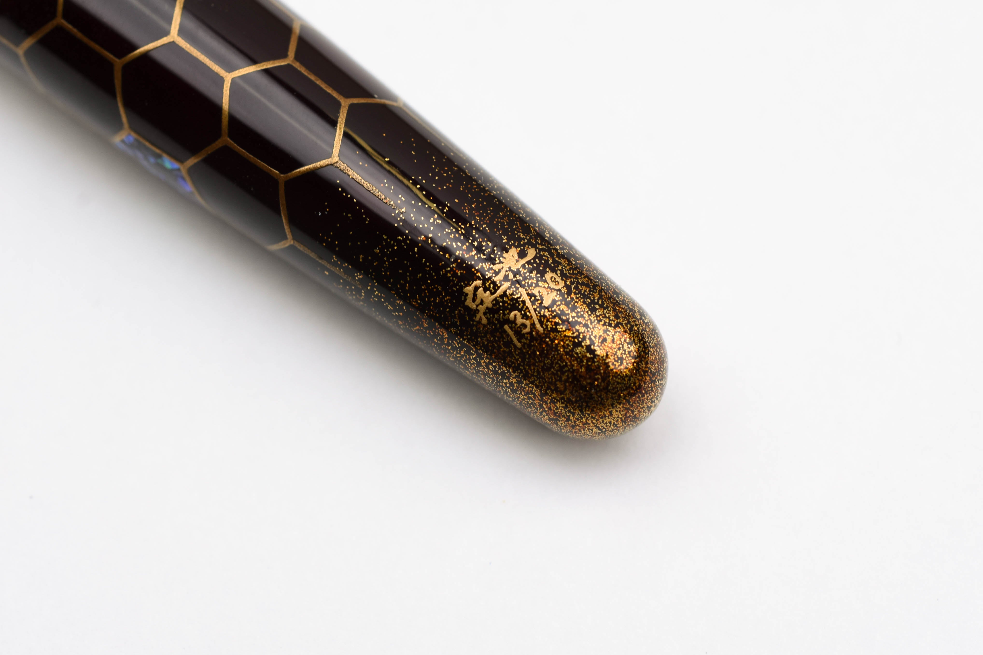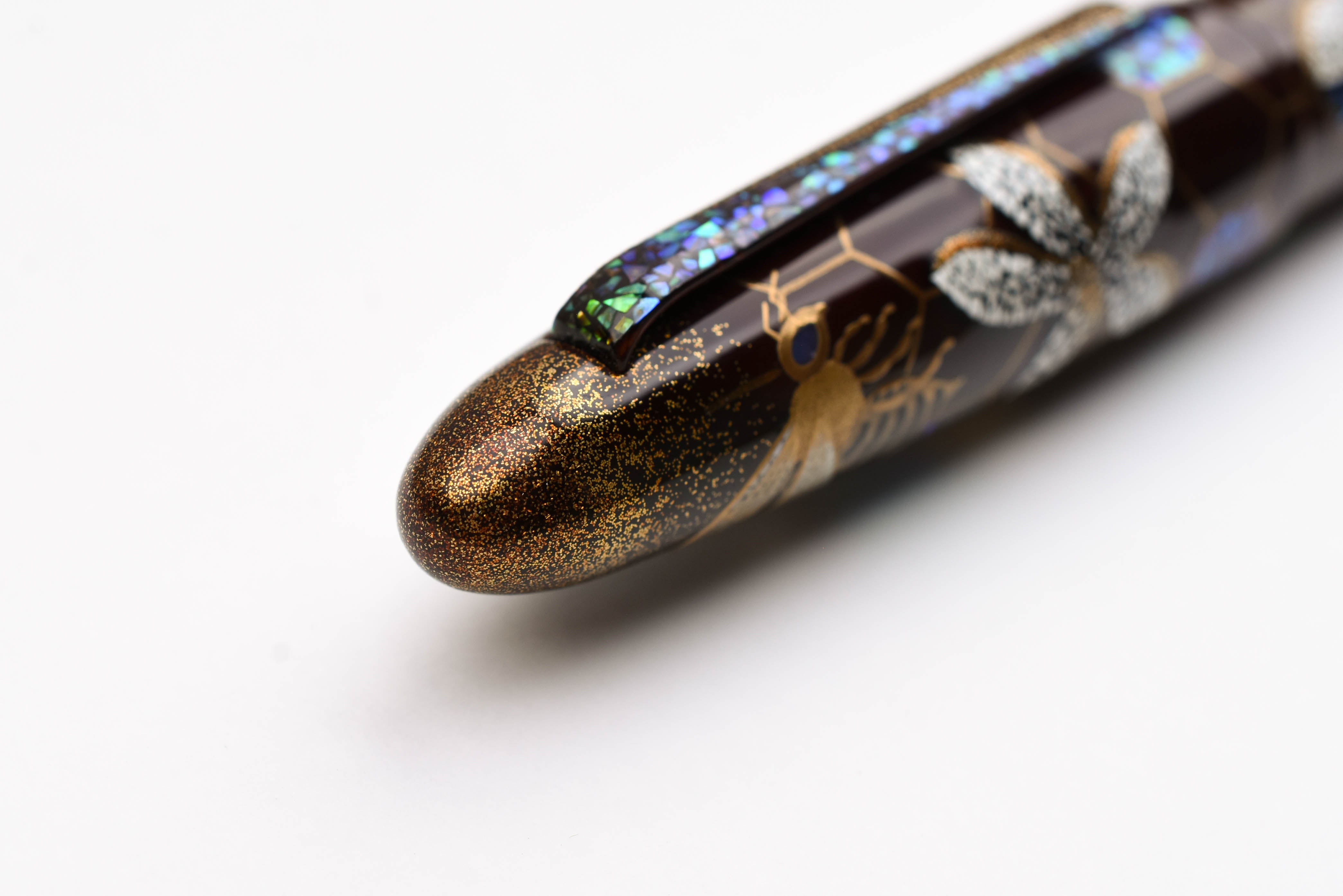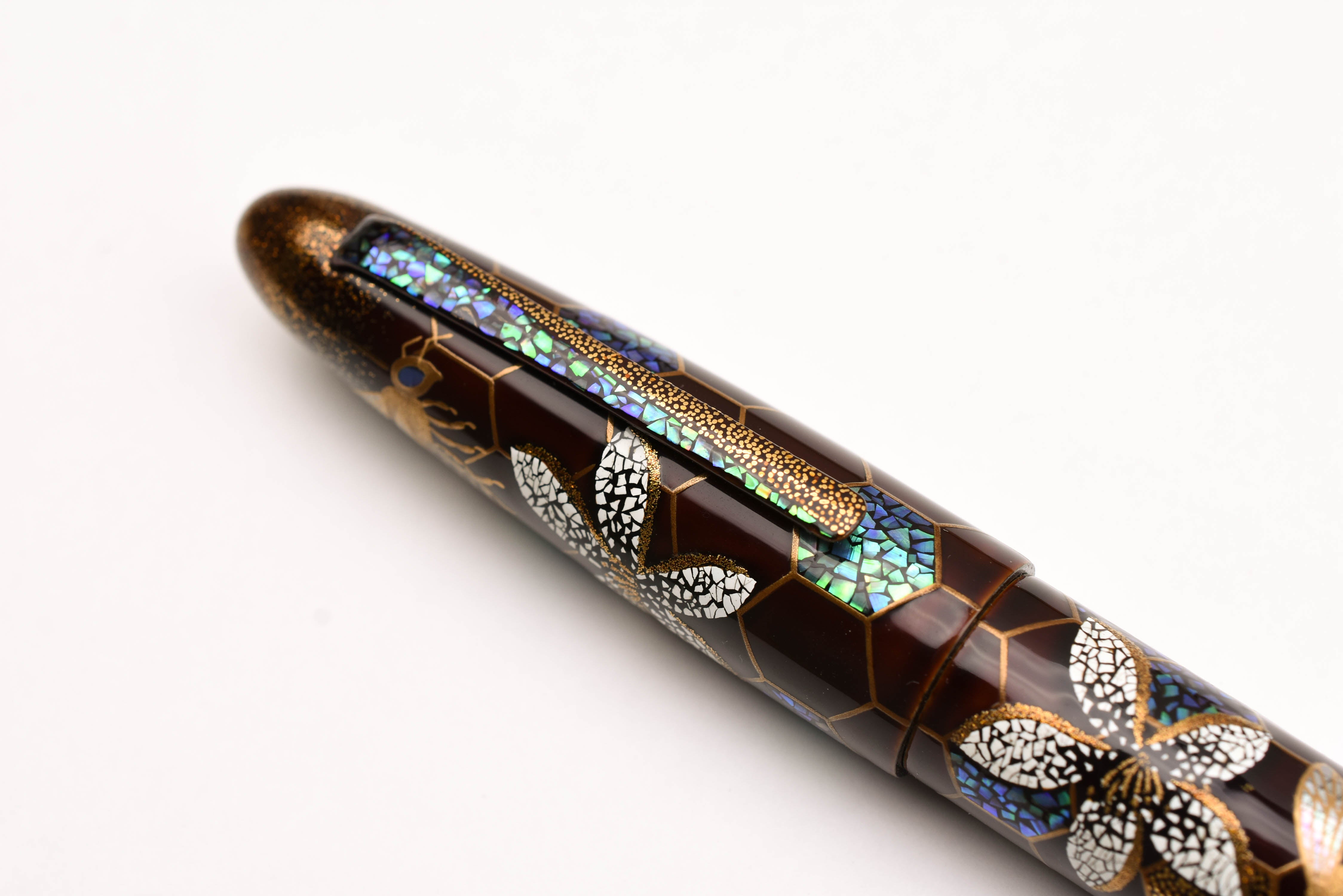 The fountain pens in Taccia's Empress Collection pair Taccia's oversized Empress body with a Sailor King of Pen (KOP) 18k gold nib. These pens feature the Rankaku and Raden Maki-e techniques (the inlaying of quail eggshells and abalone shells) combined with expert application of urushi lacquer to create stunning and unique works of art. Golden Nectar is a second version of the popular Empress Honeybee that has been updated with design modifications, and is limited to 20 pens worldwide. It is the second edition of its popular 20th Anniversary fountain pens and features delicate Rankaku and Hirame-ji orange blossoms on a Shiro-Tamenuri background.