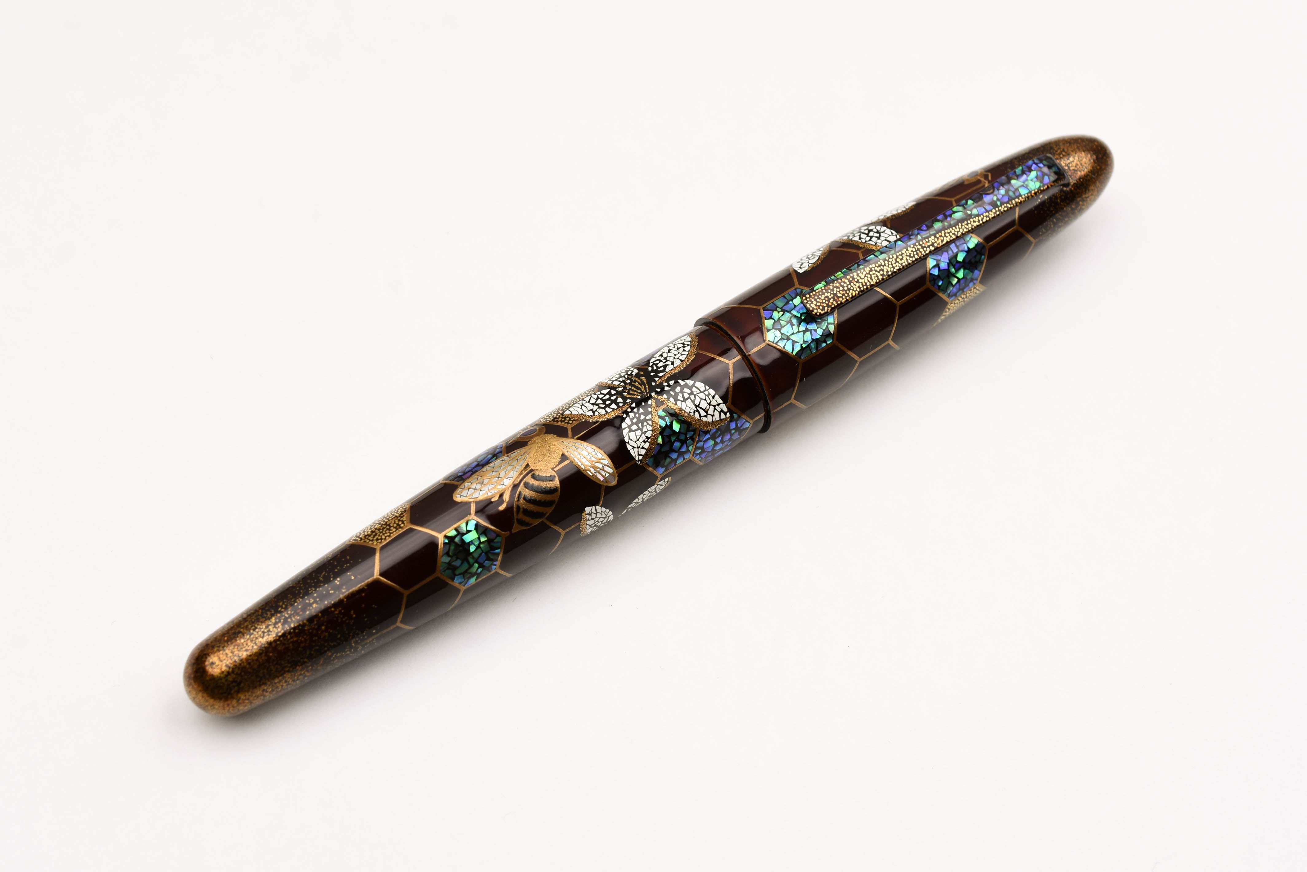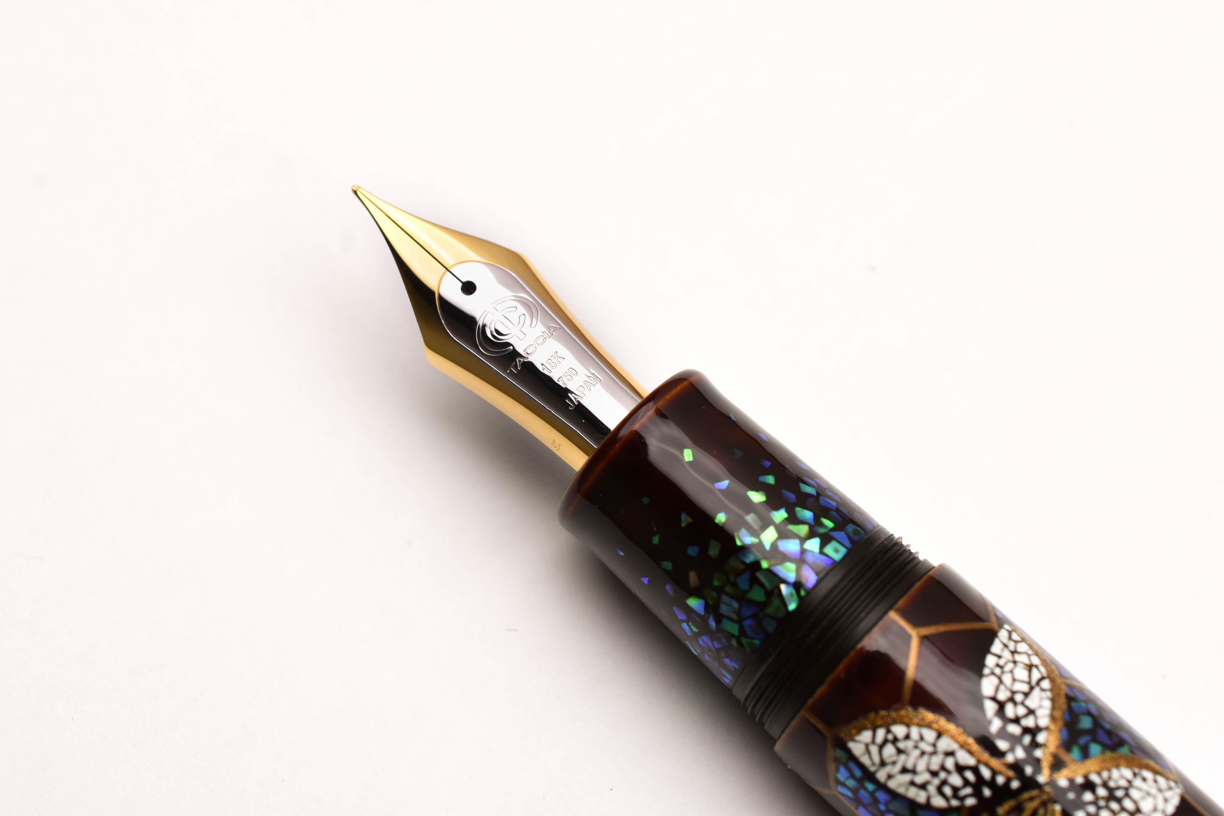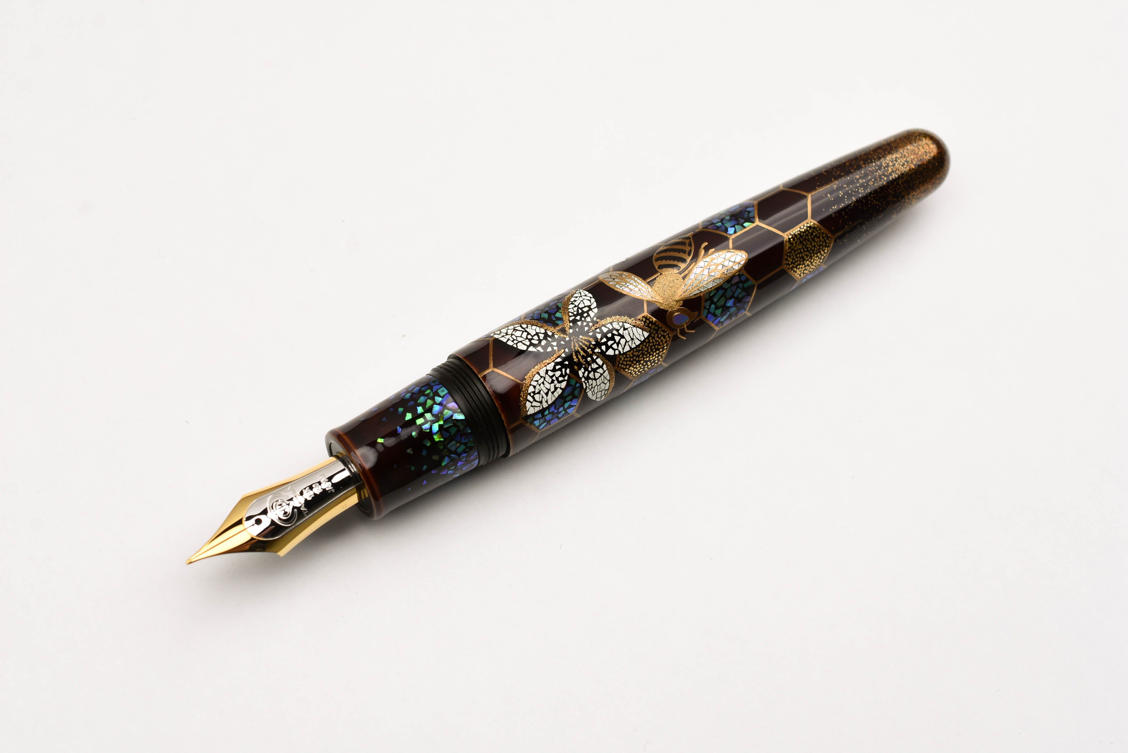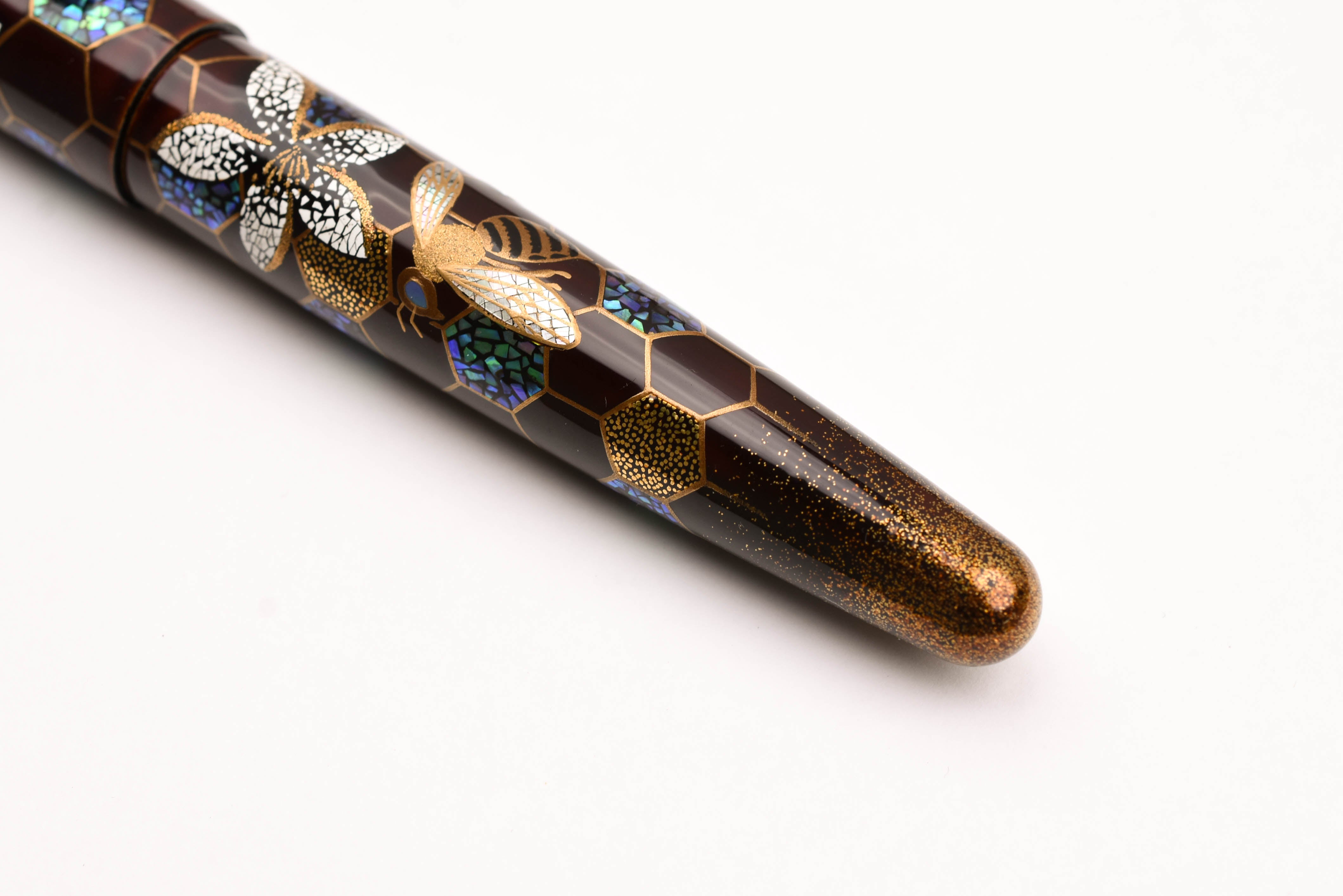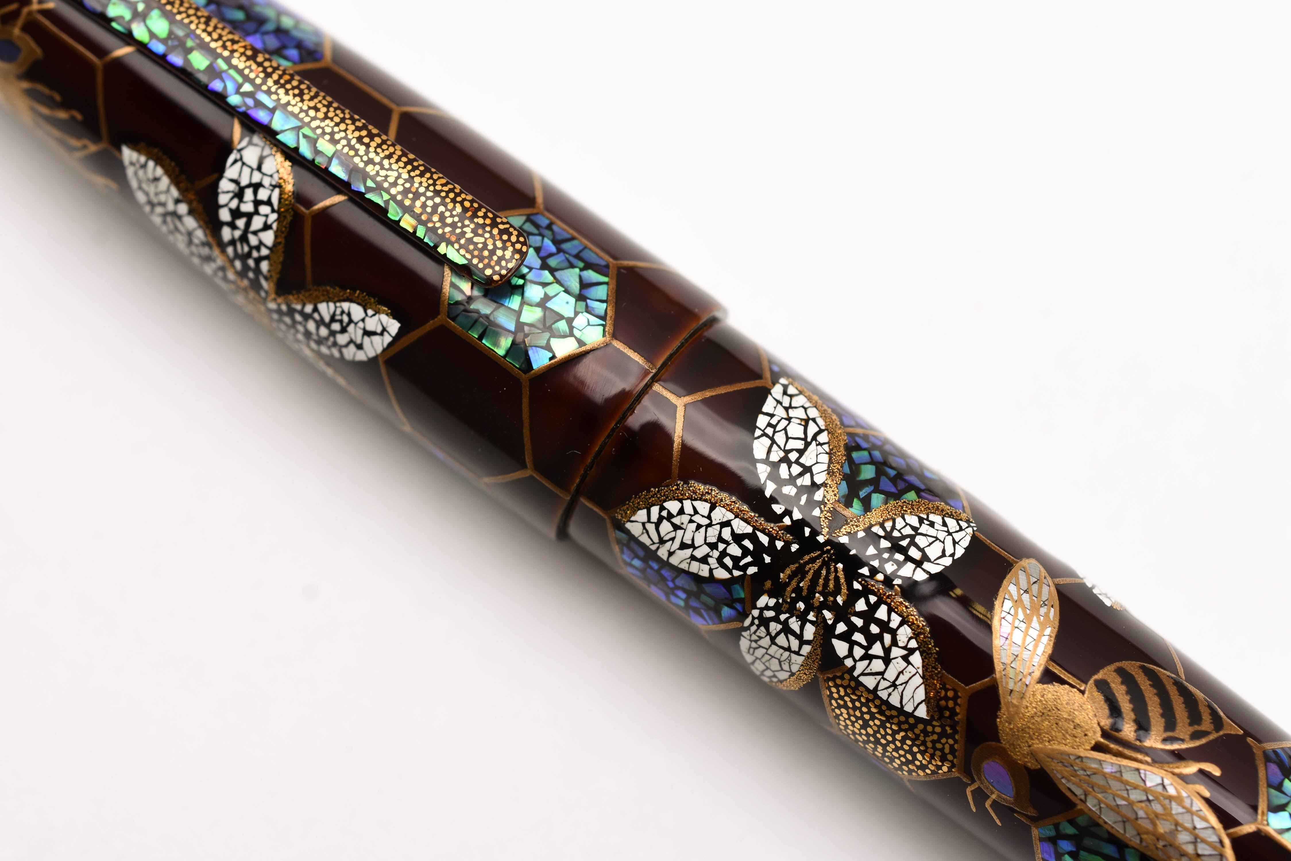 The fountain pens in Taccia's Empress Collection pair Taccia's oversized Empress body with a Sailor King of Pen (KOP) 18k gold nib. These pens feature the Rankaku and Raden Maki-e techniques (the inlaying of quail eggshells and abalone shells) combined with expert application of urushi lacquer to create stunning and unique works of art. Golden Nectar is a second version of the popular Empress Honeybee that has been updated with design modifications, and is limited to 20 pens worldwide. It is the second edition of its popular 20th Anniversary fountain pens and features delicate Rankaku and Hirame-ji orange blossoms on a Shiro-Tamenuri background.