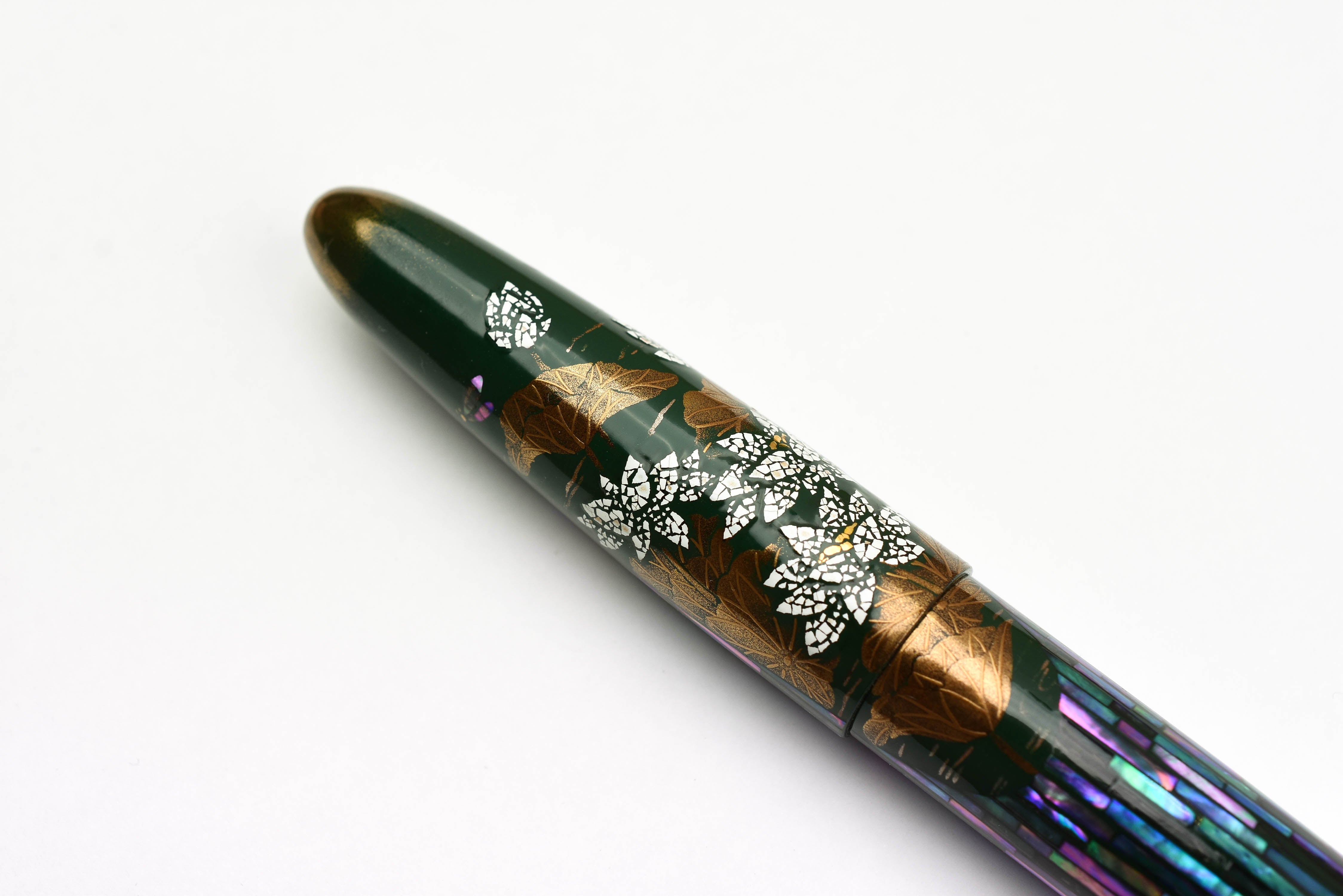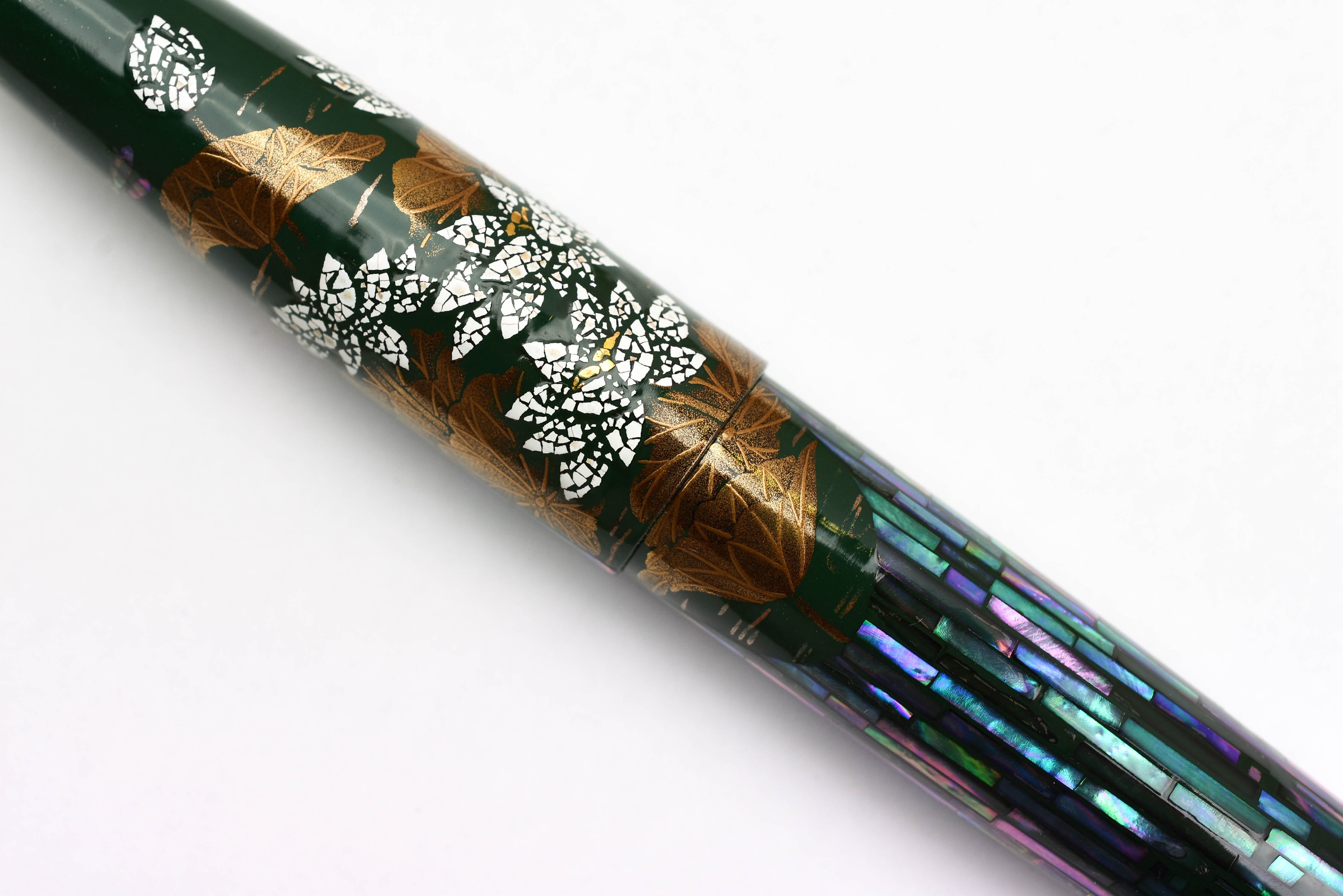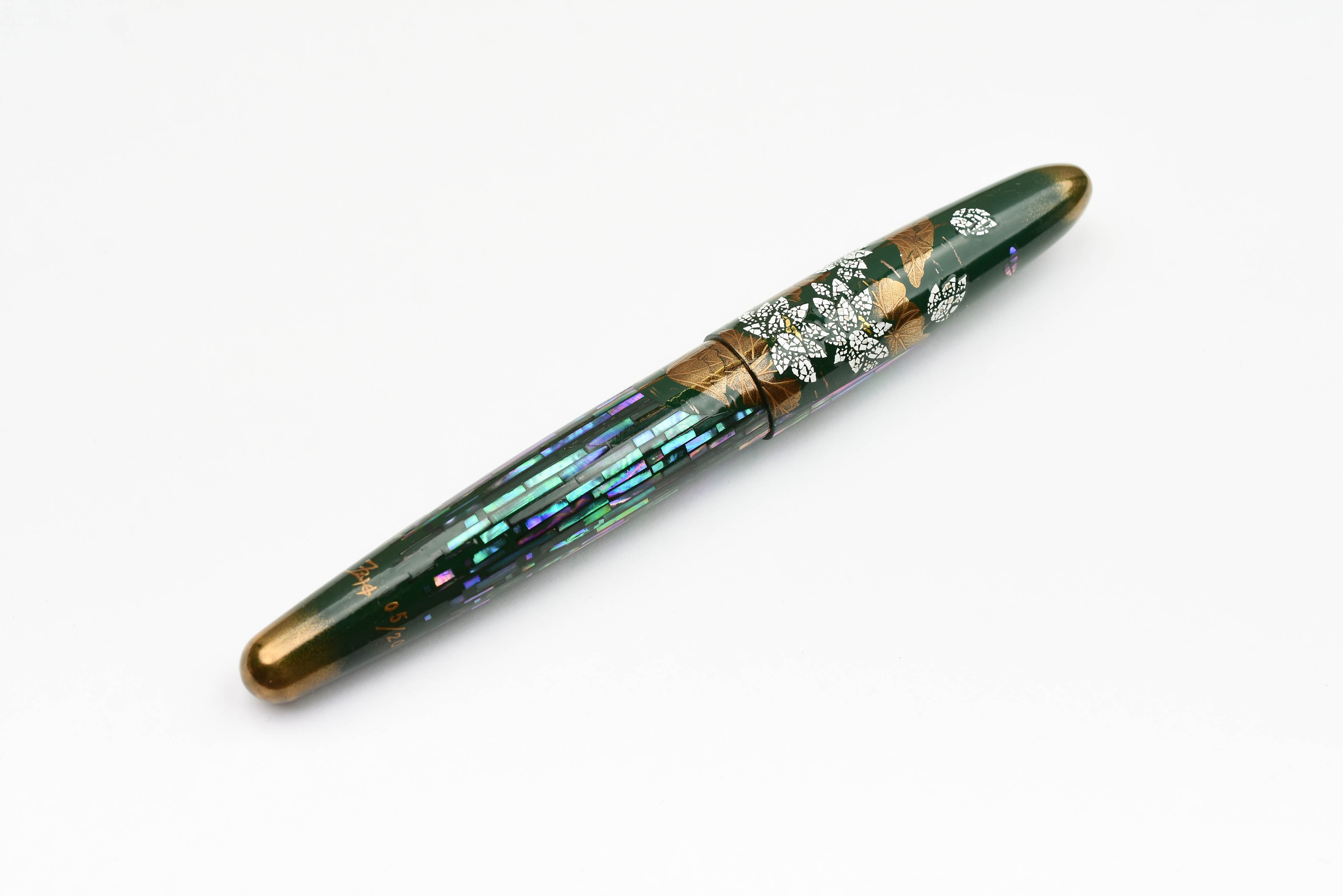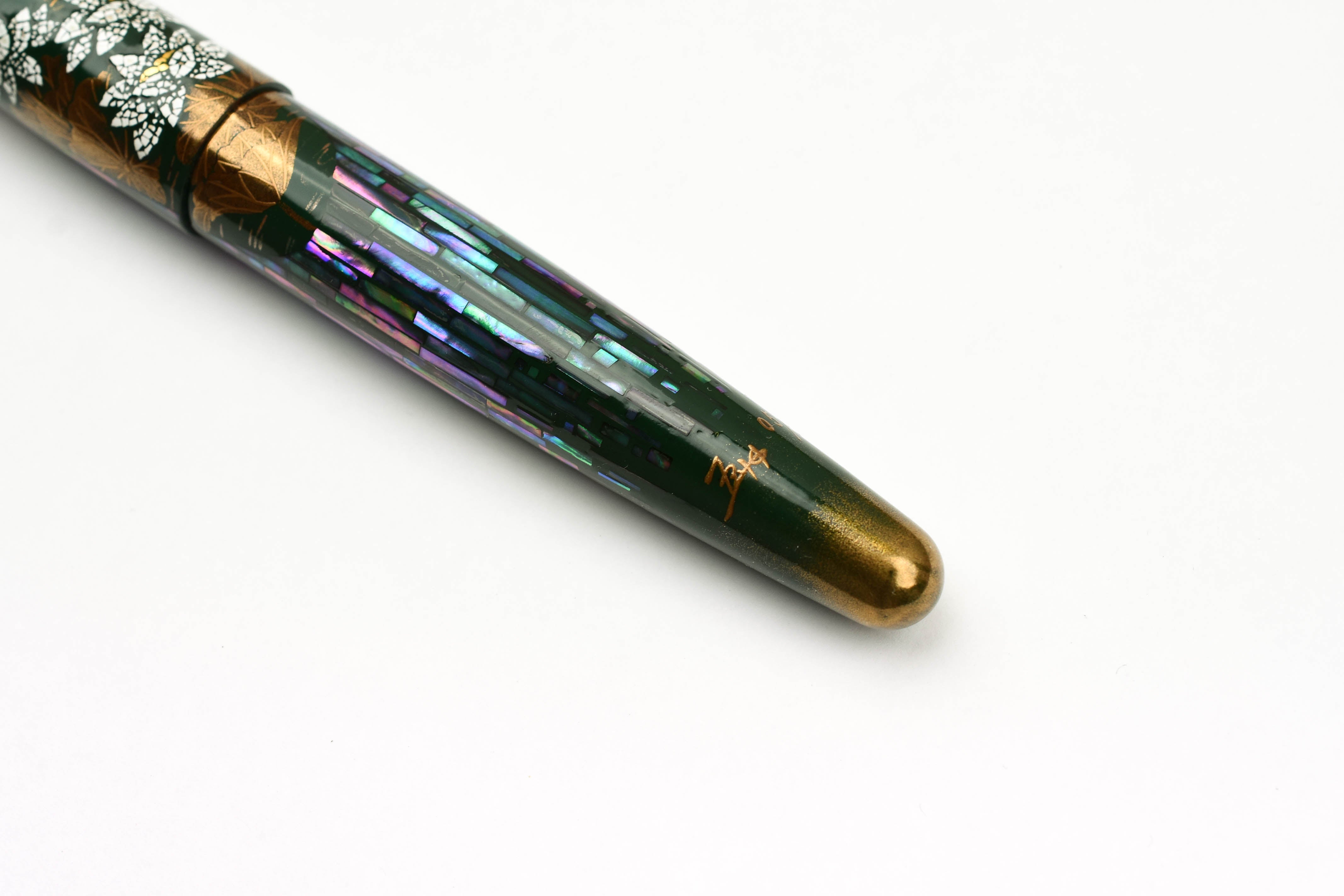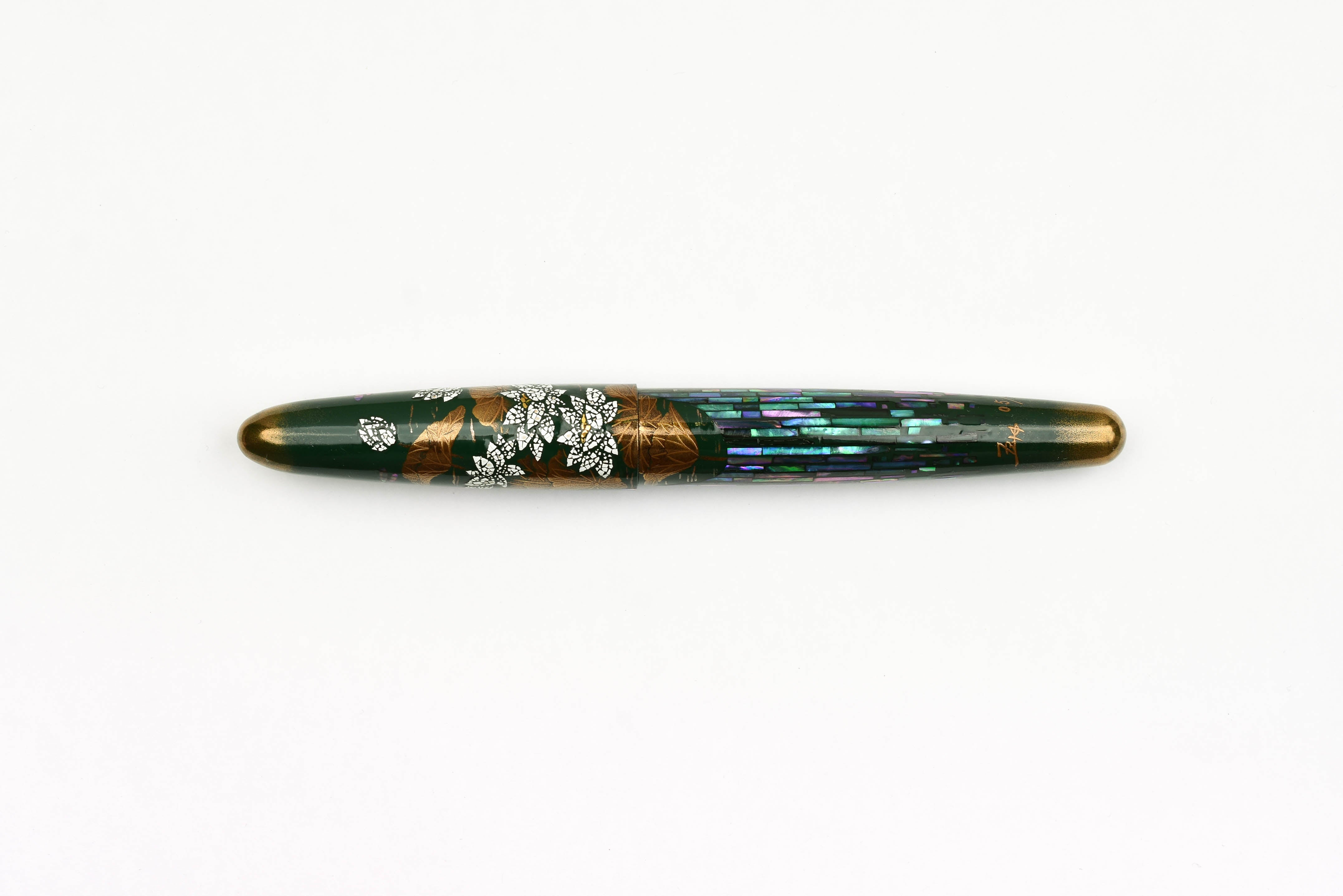 The fountain pens in Taccia's Empress Collection pair Taccia's oversized Empress body with a Sailor King of Pen (KOP) 18k gold nib. These pens feature the Rankaku and Raden Maki-e techniques (the inlaying of quail eggshells and abalone shells) combined with expert application of urushi lacquer to create stunning and unique works of art.
