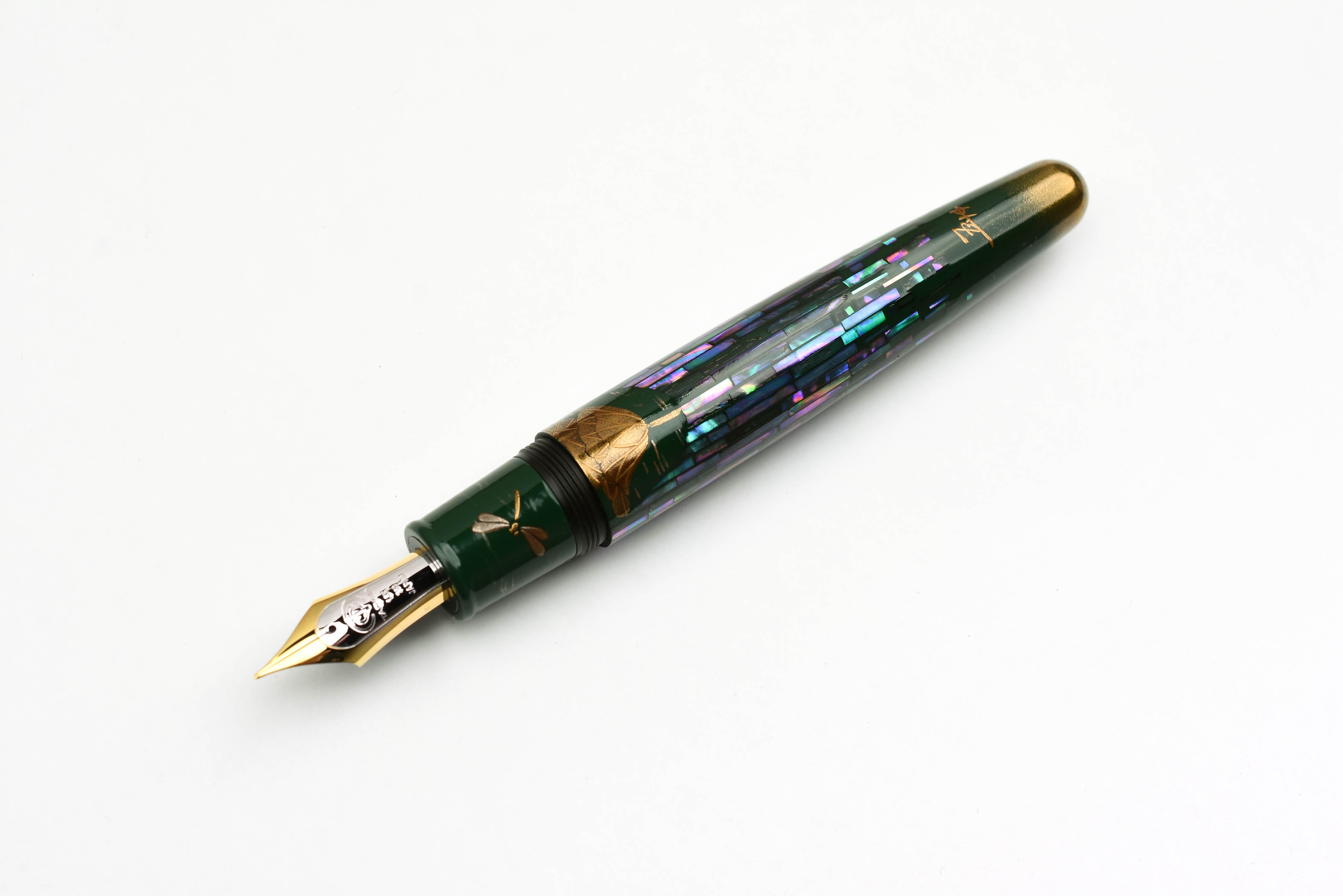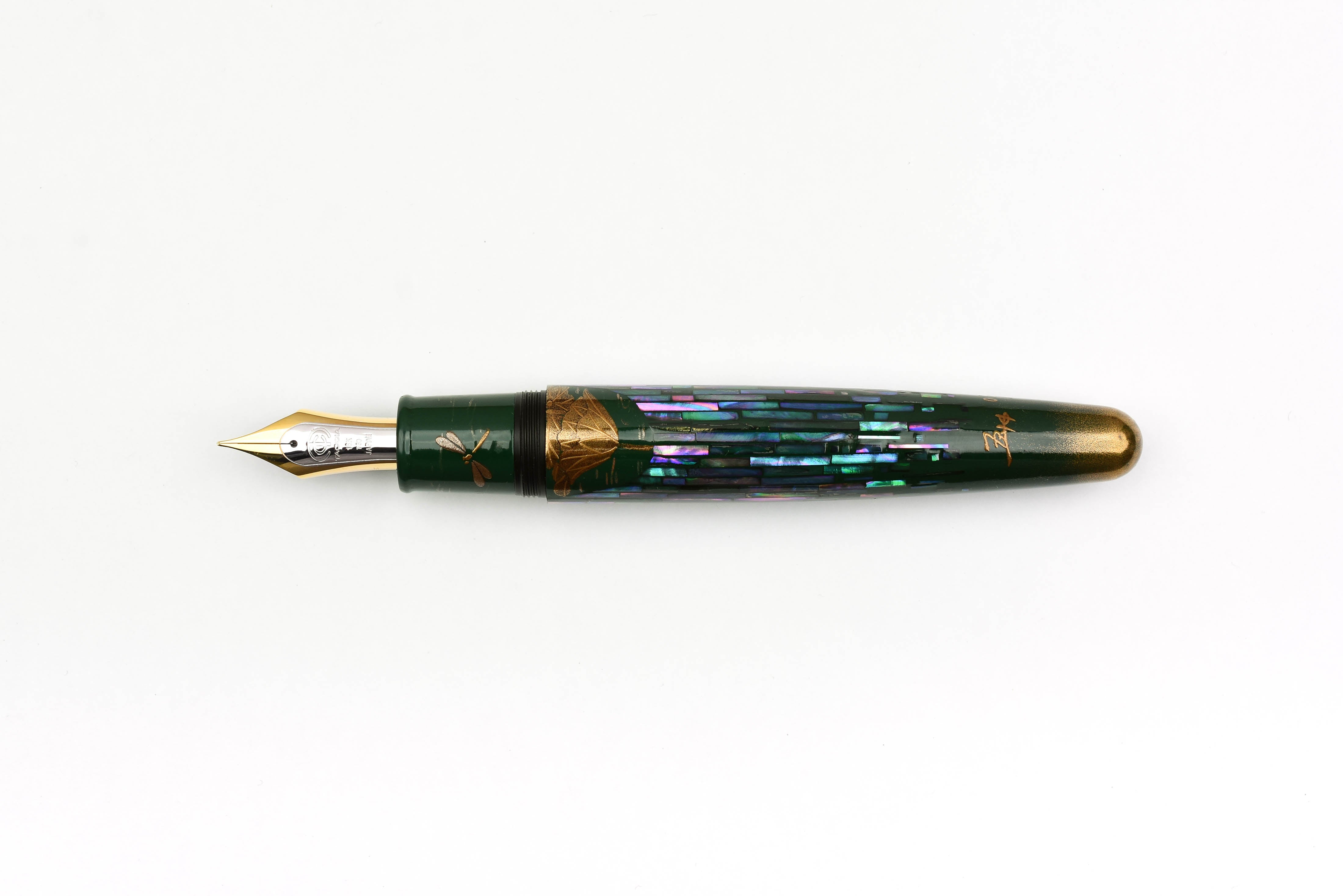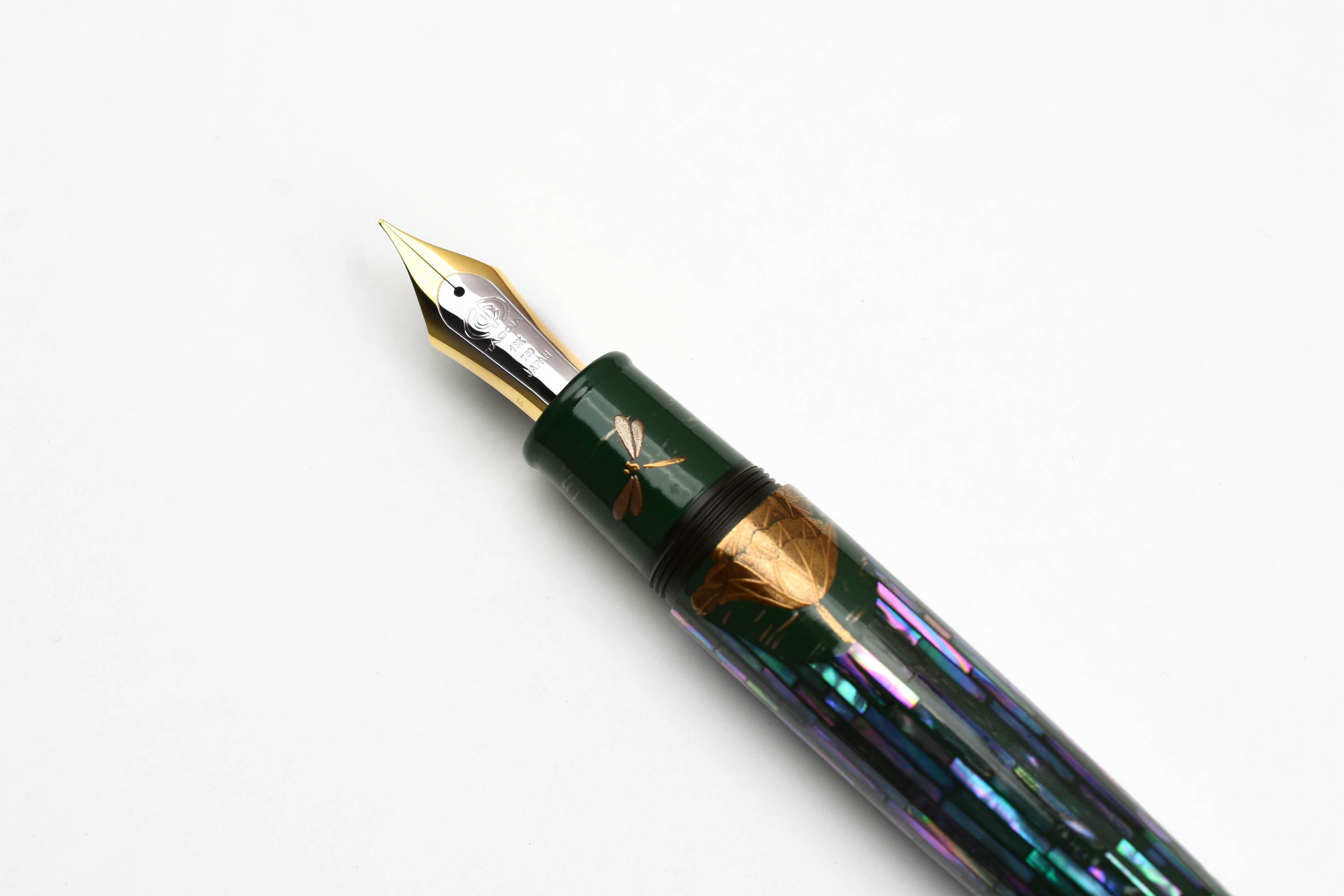 Shangri-La is a second version of Taccia's 20th Anniversary Empress pens with a few design modifications, and is limited to 20 pens worldwide. The Empress Shangri-La features beautiful Rankaku lotus flowers in bloom, cascading Raden water and stunning dragonflies in both mediums - invoking the feeling of warm summers outside near your favorite pond.