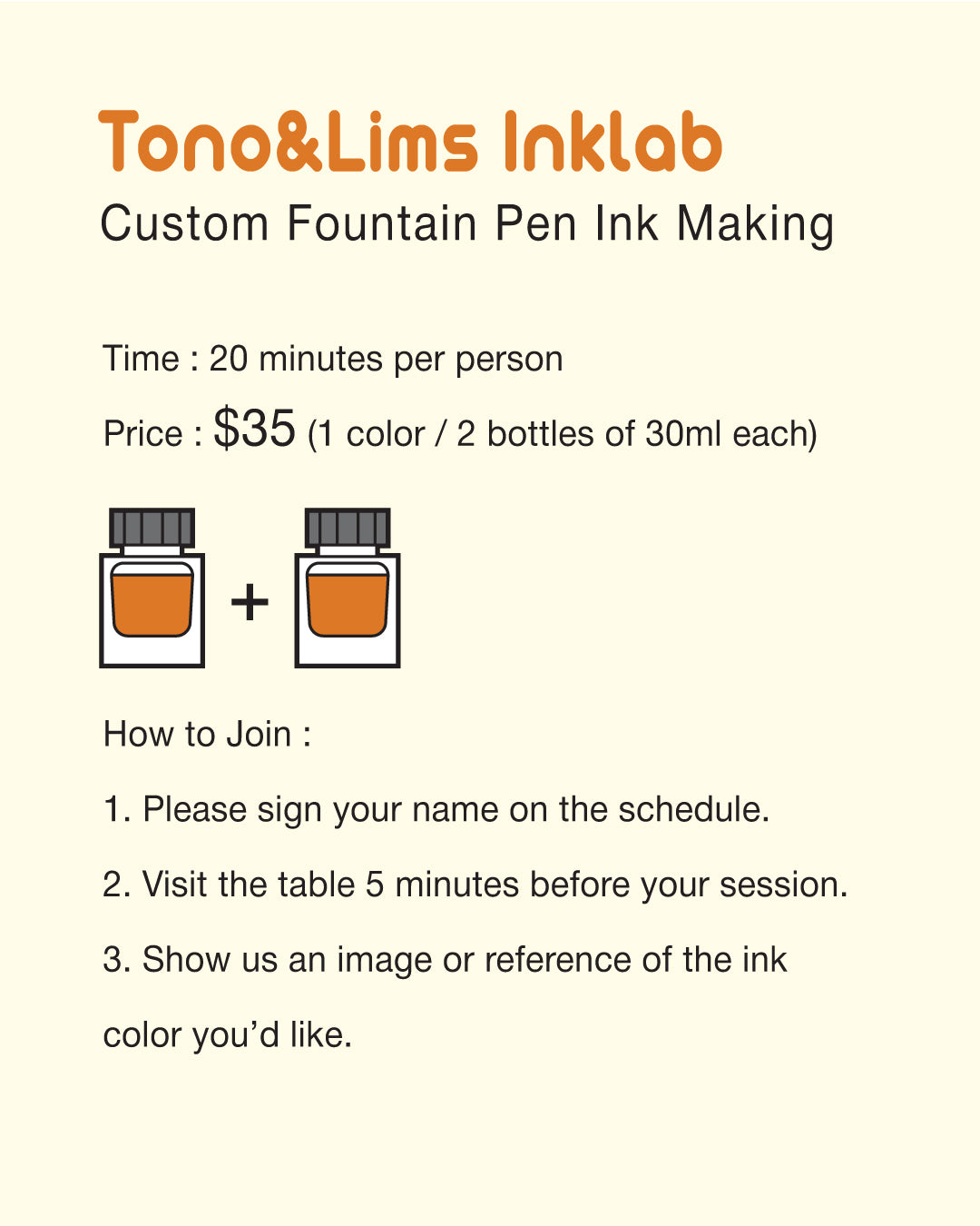 At A Space Walk 2025 Summer New York with Yoseka, Tono & Lims will be bringing their custom Ink Lab services. Book a session with Tono or Lim, the founders of Tono & Lims, and they will help you create the custom ink color of your dreams. If you have a certain multi-color or shading property in mind, feel free to share with them and they will also do their best to capture this property in your ink! With their years of experience making thousands of ink colors released over the years, Tono and Lim bring their ink expertise and knowledge to each Ink Lab session to create the color you wish to match.