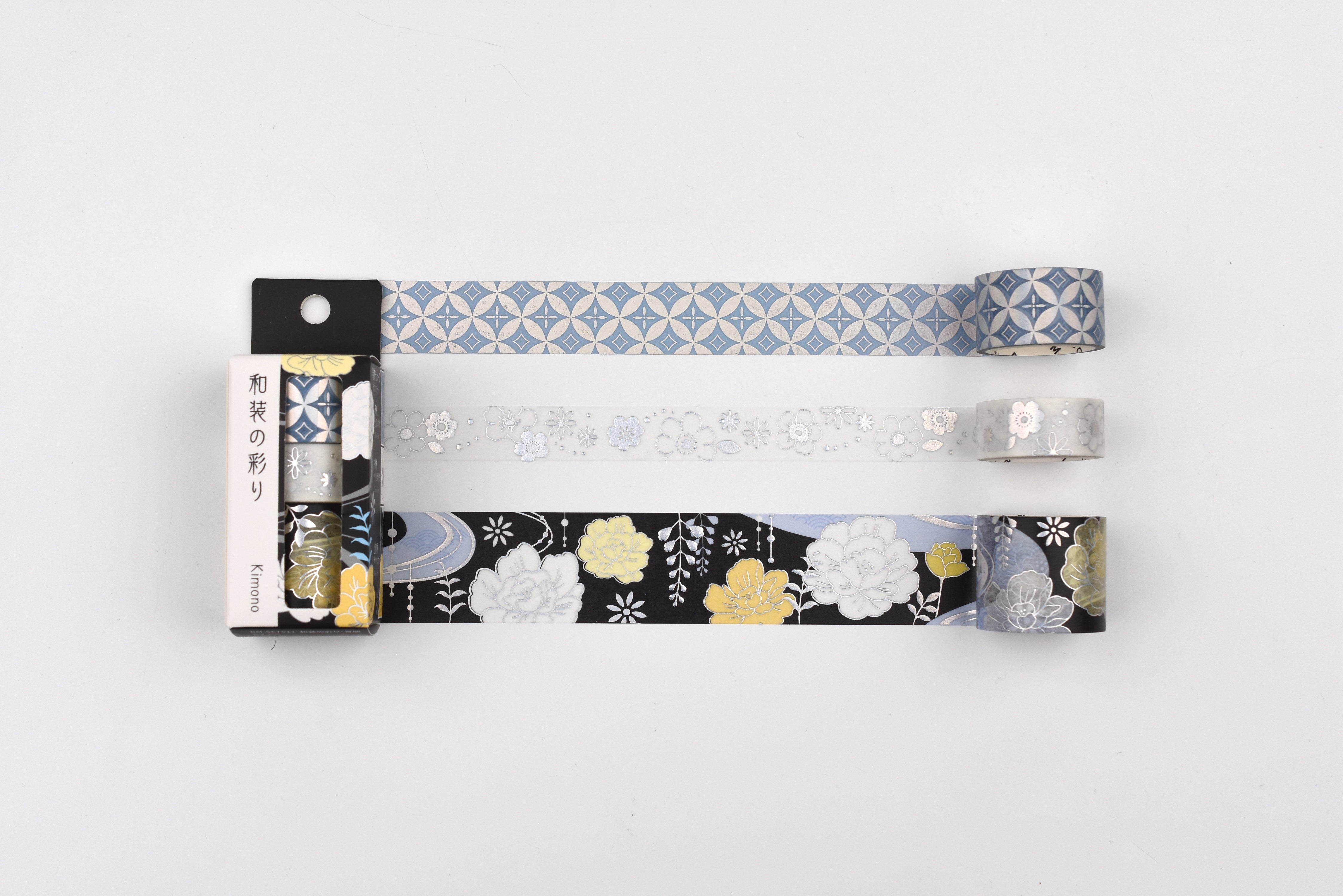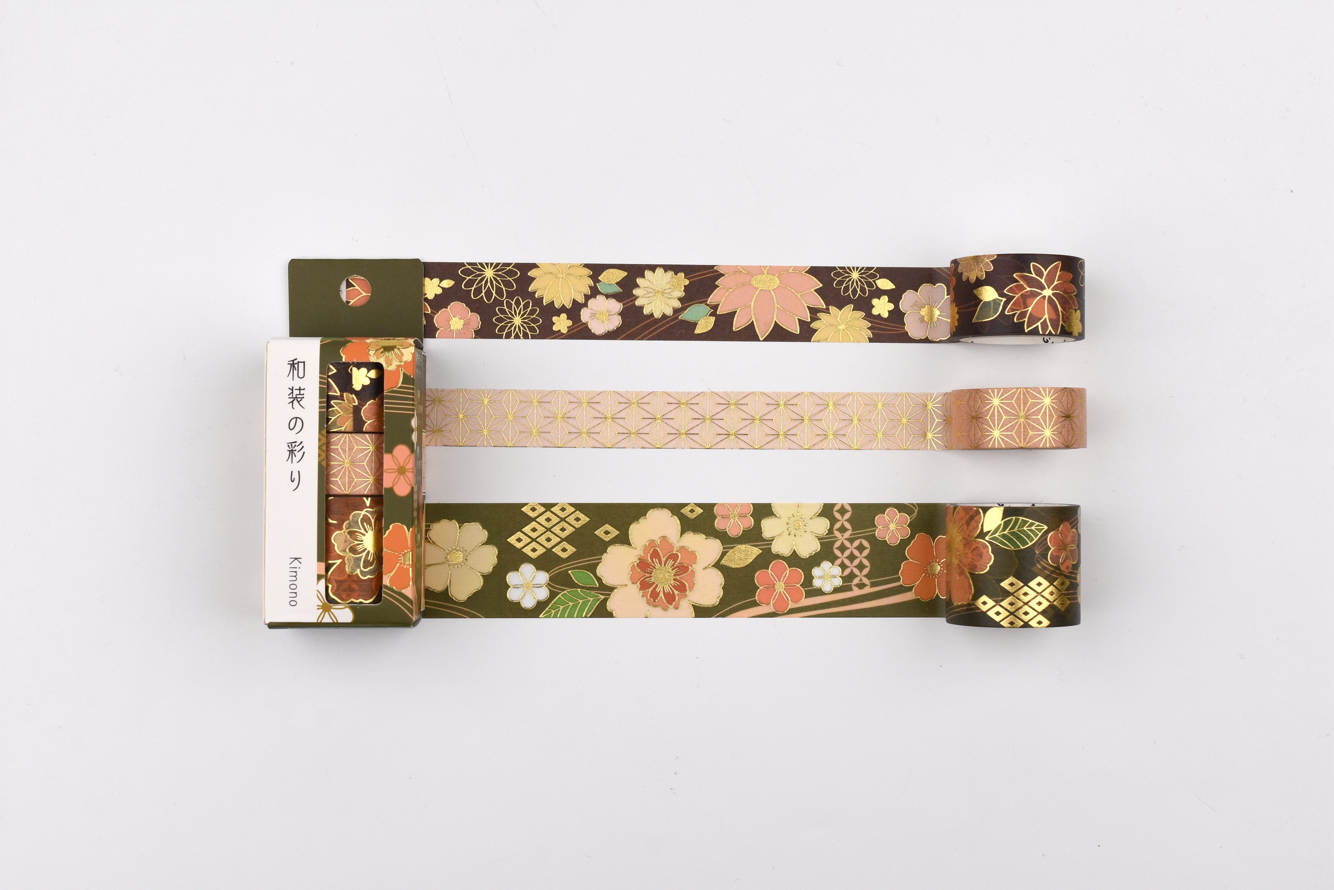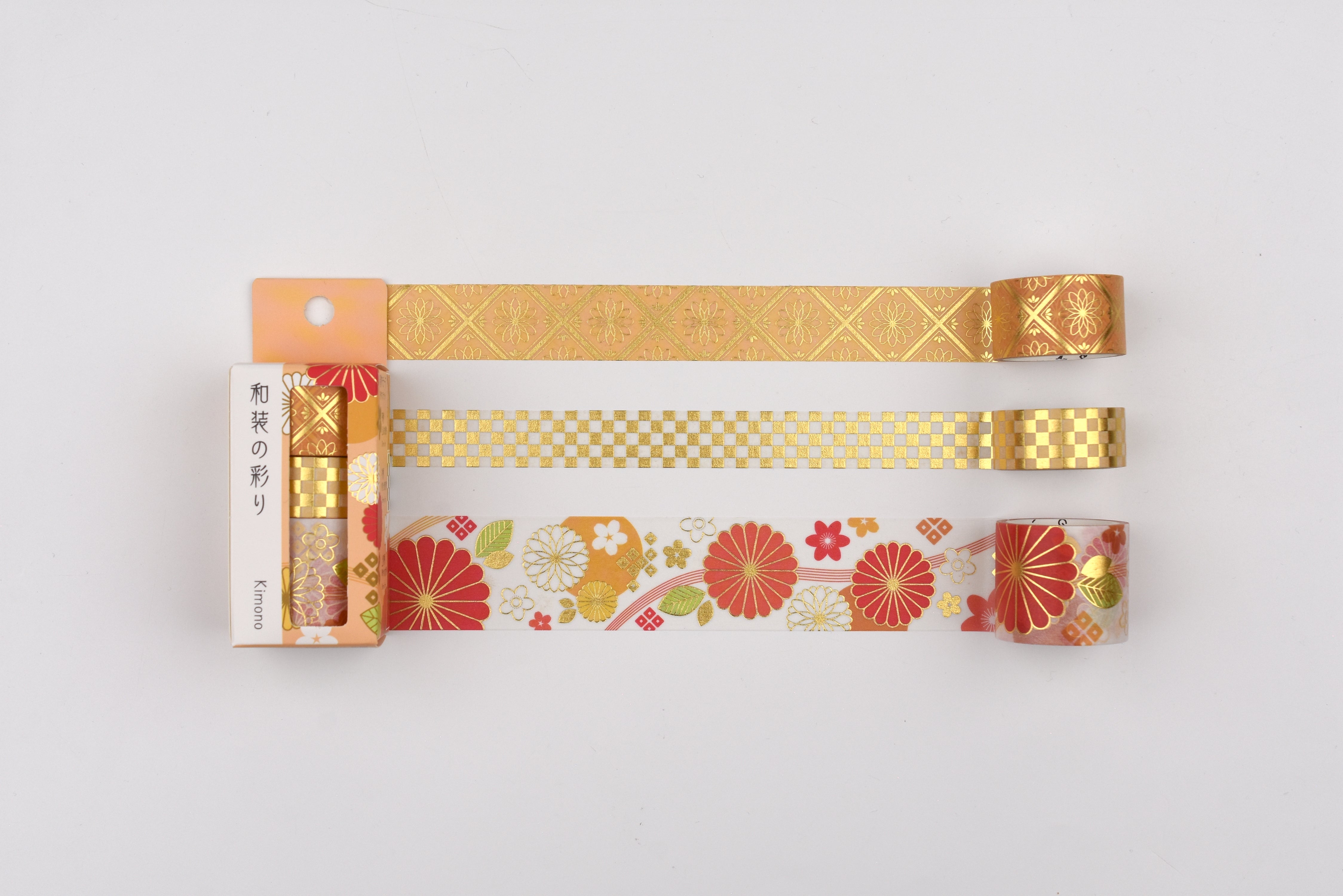 This set of three washi tapes features designs inspired by traditional kimonos, finished with elegant gold foil stamping for a refined shimmer. With widths of 15mm, 20mm, and 30mm, each roll brings a textile-like charm to journals, planners, and decorative projects.