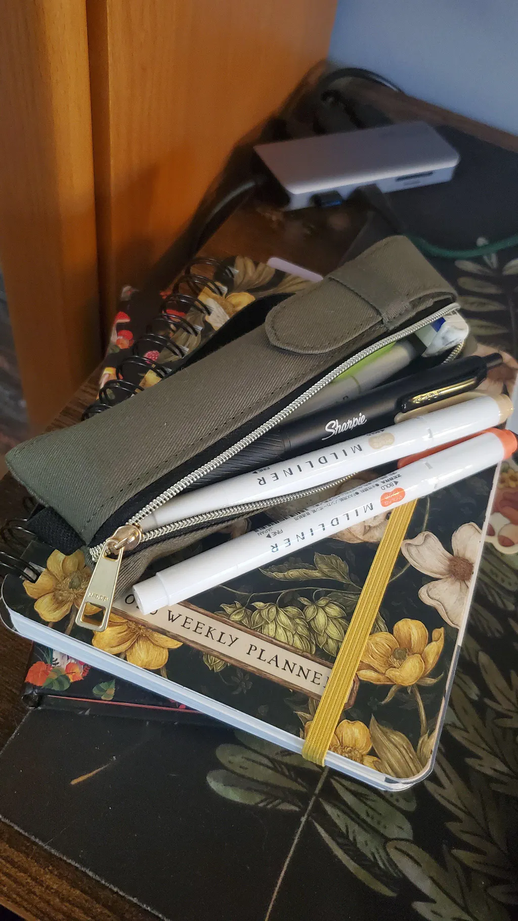 This case is the perfect size for a pencil, pen, mini eraser and 2-3 zebra midliners. The adjustable elastic makes it a versatile option for a bunch of different notebooks. I love it, it's the perfect size for my needs but if you're a maximalist it may be a little small.