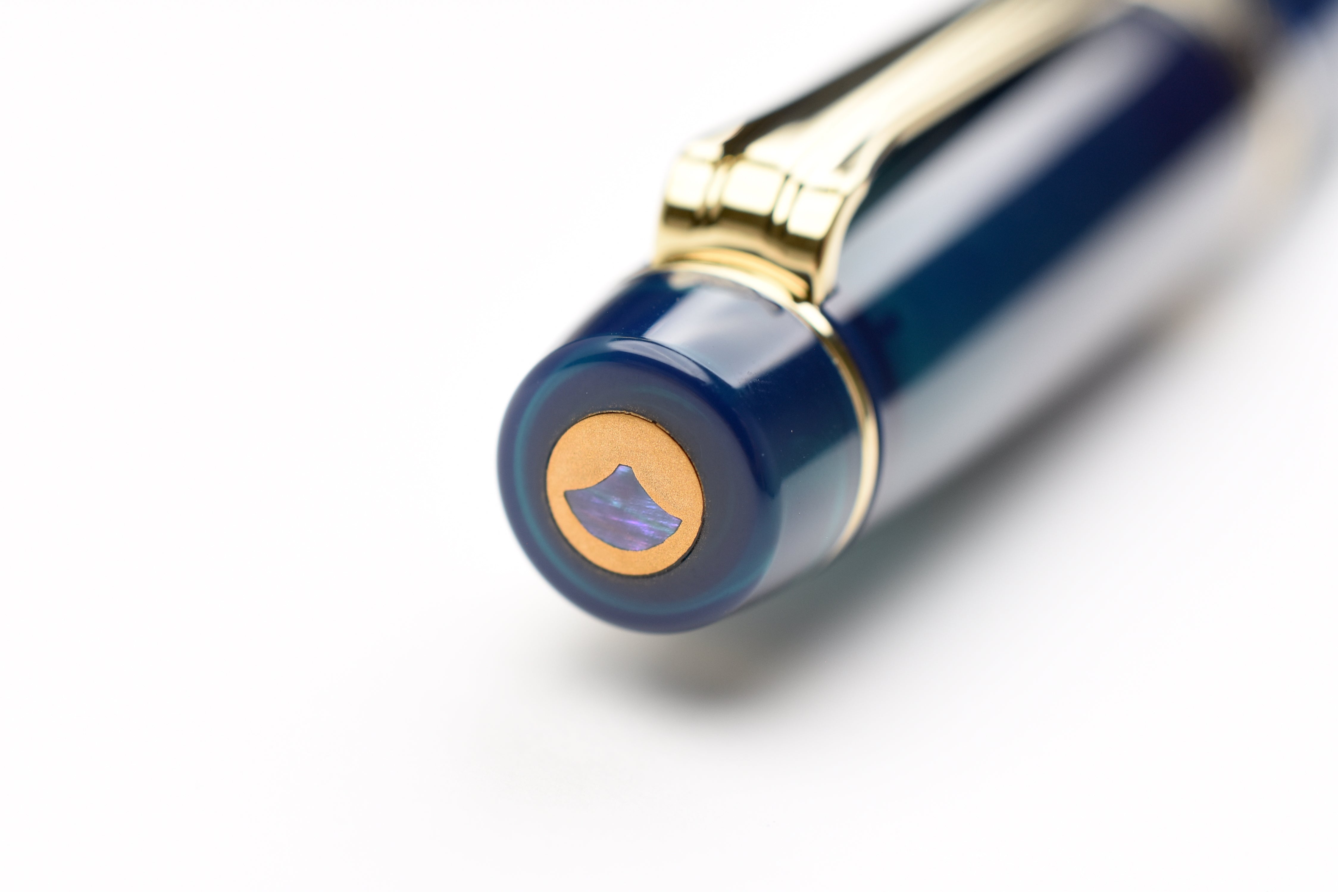 This BUNGUBOX pen is inspired by the majestic slopes of Mt. Fuji, ever-changing with the seasons and light. In this oversized model, the body captures the mountain's most beautiful and iconic shade in a single, subtly transparent blue. The gold nib and metal details contrast beautifully with the deep blue barrel. The finial features a Raden Maki-e finial in the silhouette of Mt. Fuji, crafted by BUNGUBOX artisan Mr. Hino.