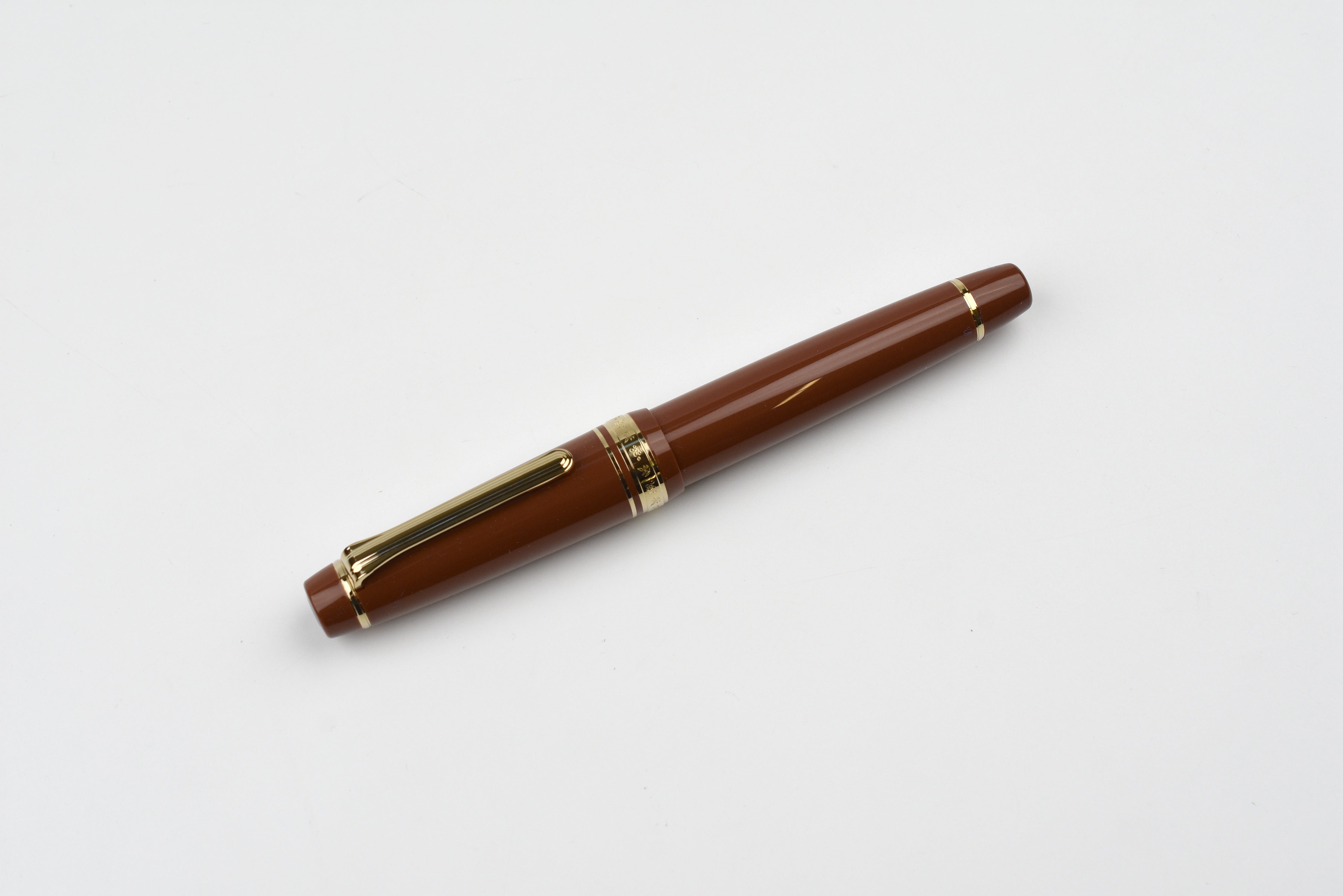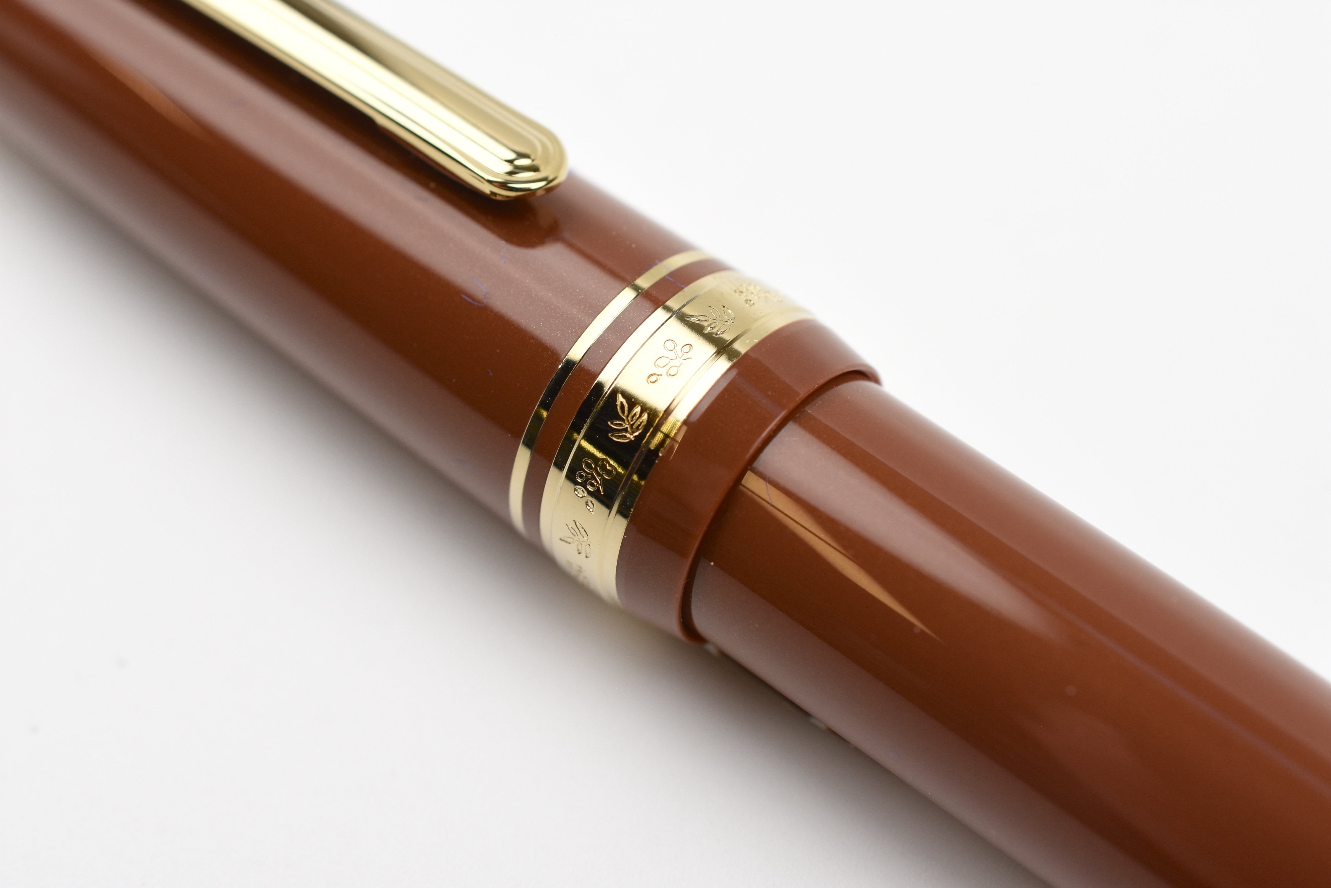 This BUNGUBOX fountain pen draws inspiration from the rich, fragrant color of traditional kabayaki sauce handed down through generations. Its barrel reflects this deep hue and is infused with polarized gold pearl that shimmers with golden highlights depending on the viewing angle, evoking the sizzling allure of eel glazed with sauce. The cap ring is finely engraved with the fruit and leaves of sansho, the essential spice that completes kabayaki, while the crown features a mother-of-pearl inlay shaped like the Japanese Hiragana character “u” for “unagi” (eel).