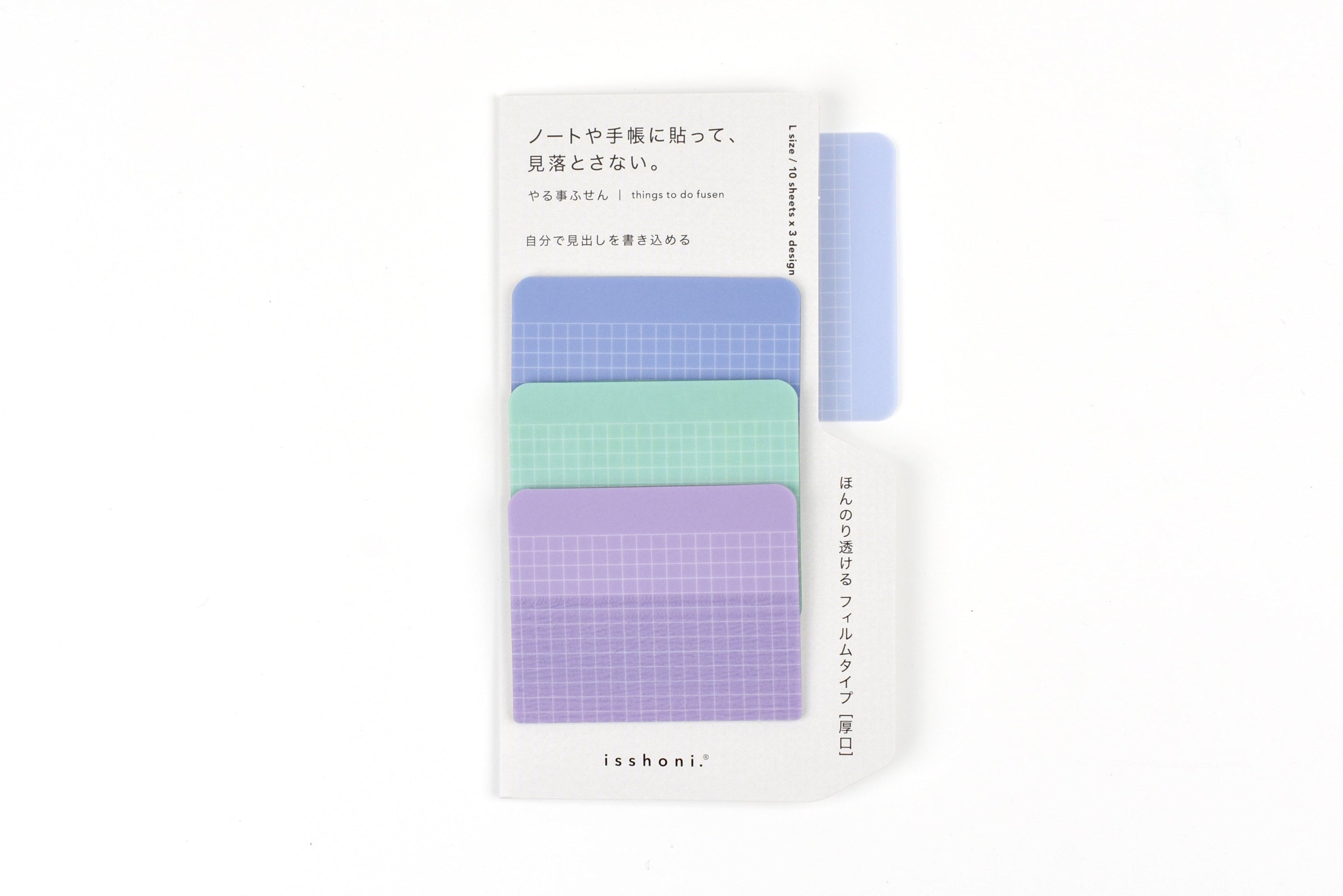 These isshoni. Yarimono Sticky Notes are designed to function as reminders on your desktop, calendar, or planner pages. They come with a blank header area that allows you to write your own caption to gain extra attention. The translucent texture of these sticky notes allows you to place them anywhere without blocking the important date or content on your calendar. Due to the vellum paper material, it is best recommended to write on these sticky notes with pencil or ballpoint pen.