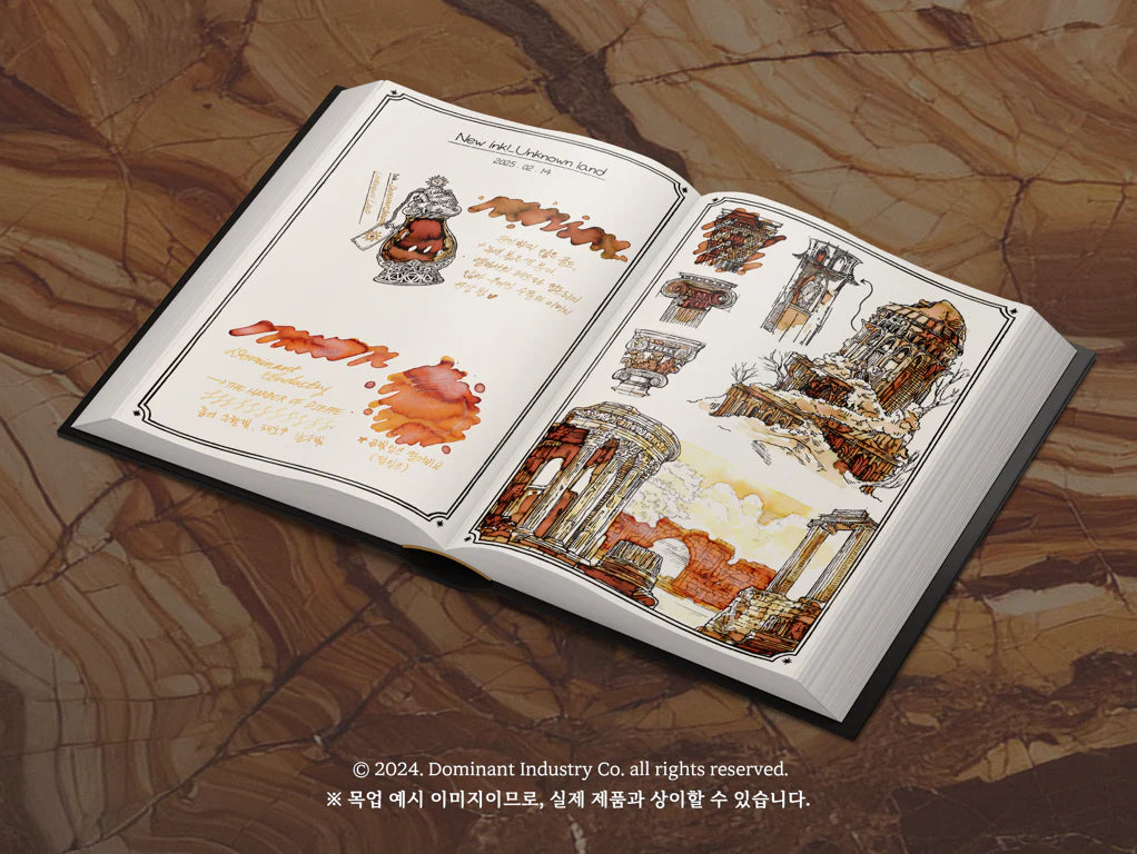 The "A Log of Elixir" collection takes inspiration from alchemy, blending vintage style with practical design. This second edition in Dominant Industry’s Ink Archiving series features a black faux leather hardcover and organized sections for swatches, descriptions, and personal notes. The acid-free pages ensure your ink samples and writing stay preserved over time. In collaboration with artist Sing Ink Swatch, the A Log of Elixir ink archiving book is is filled with detailed illustrations of magical elixirs and alchemical tools that create an engaging and immersive experience.