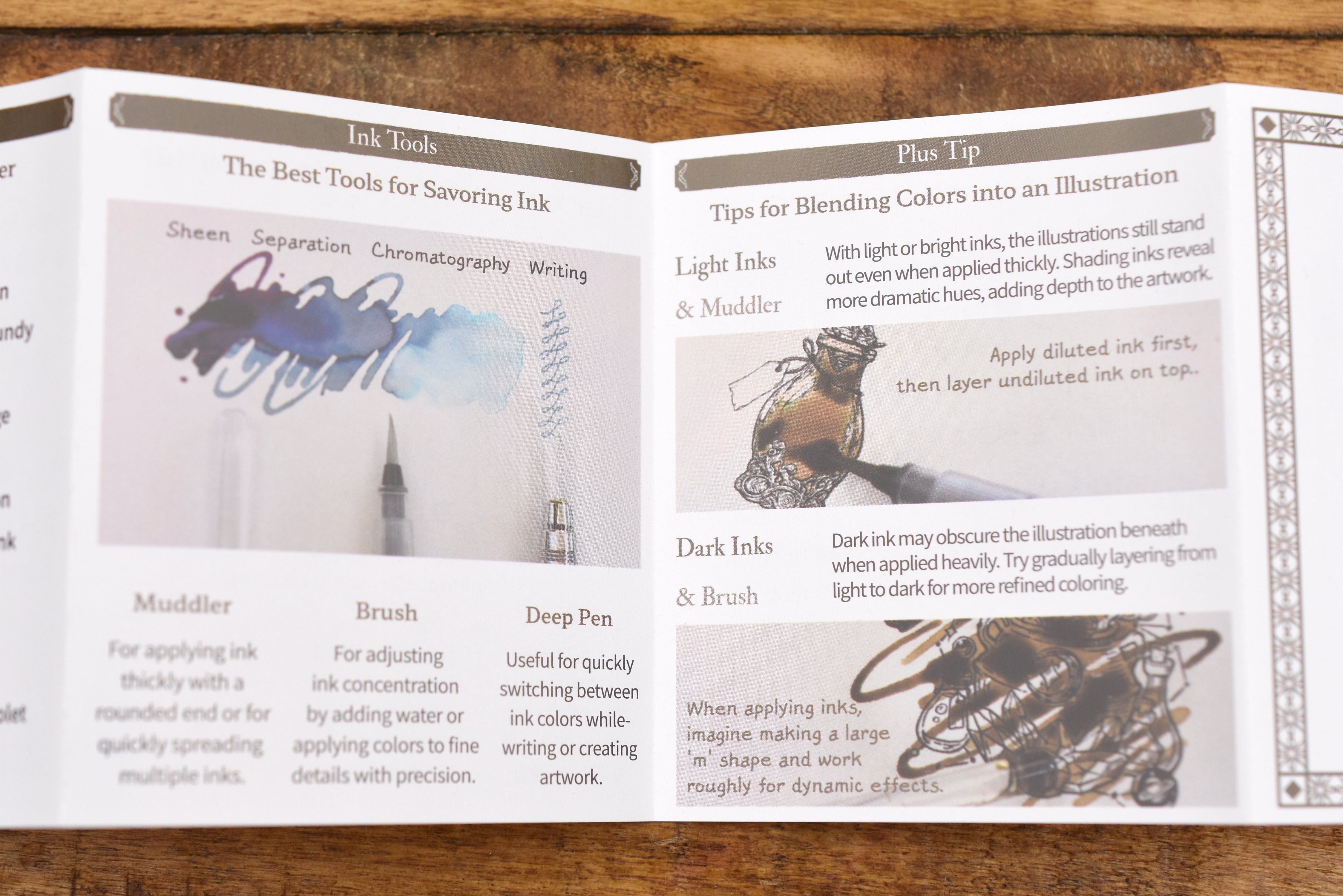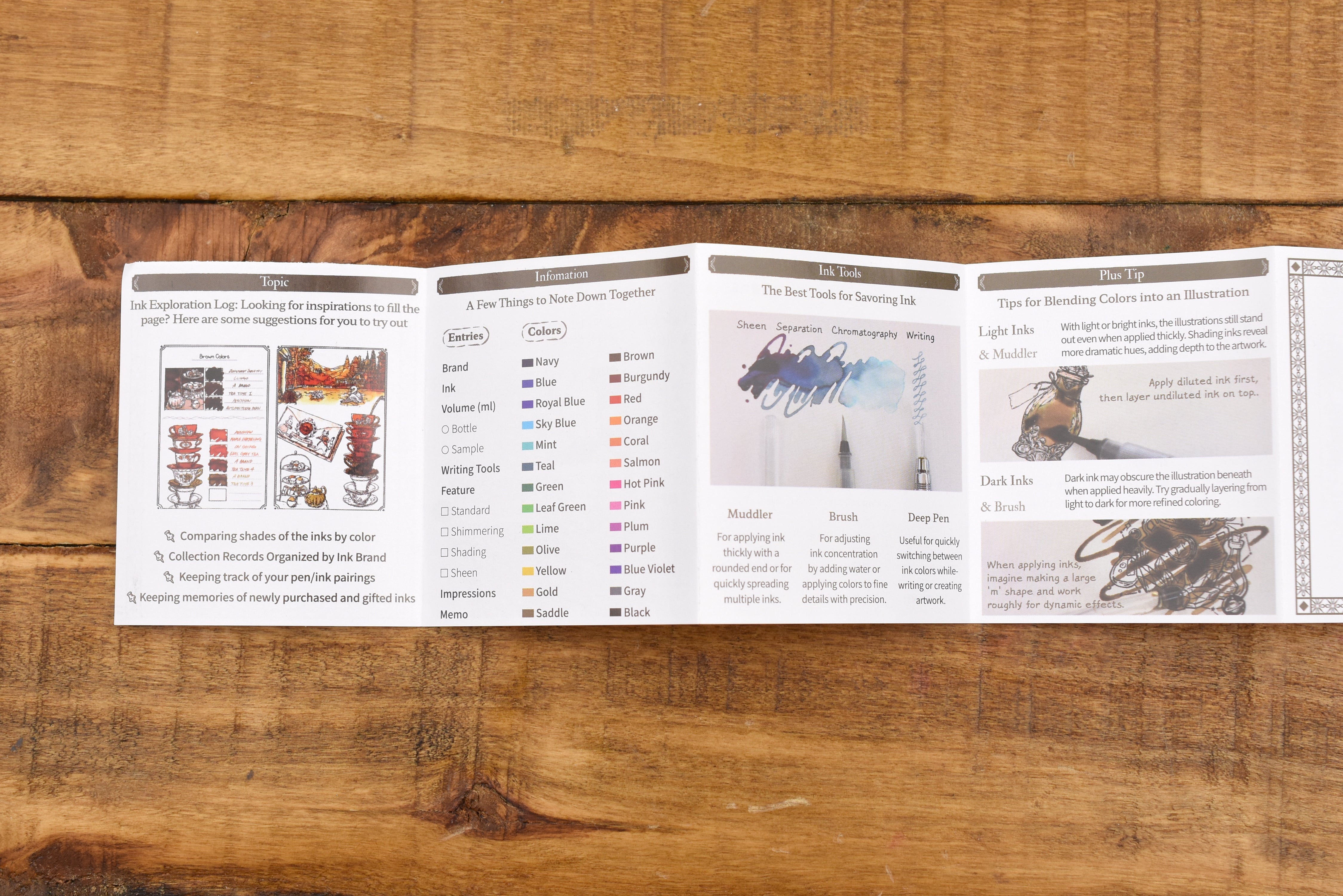 Perfect for collectors, calligraphers, and writers alike, A Log of Elixir offers a beautiful way to explore fountain pen inks. The collection includes an ink swatch book, a handcrafted wood stamp, and two standard inks—Unknown Land and Allegory—completing the set.