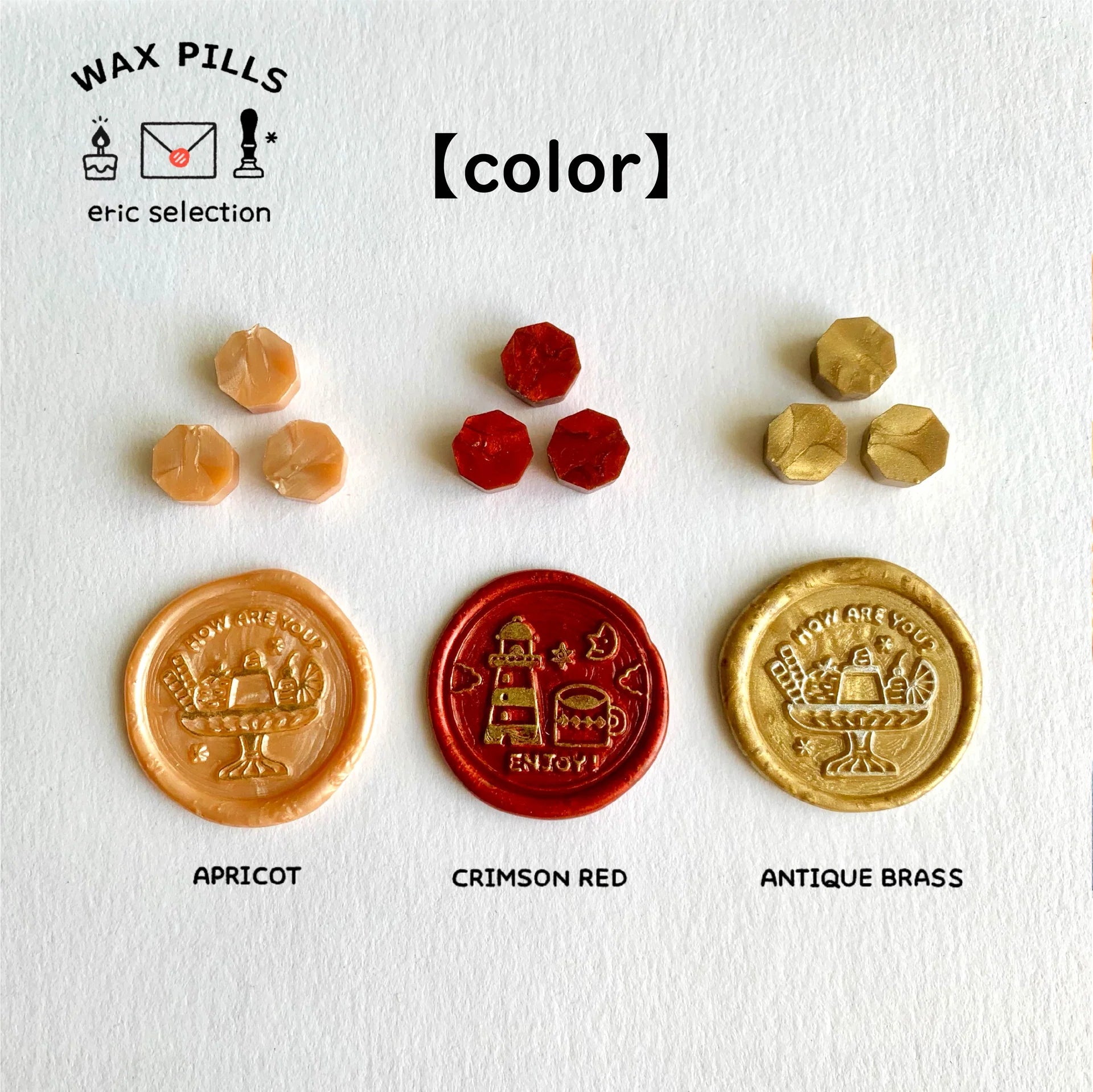 Colored in hues chosen by eraser-stamp artist Eric, these wax pills are easy to use with 3–4 pills per seal. Use three for a crisp edge or four for a plump, rounded look.