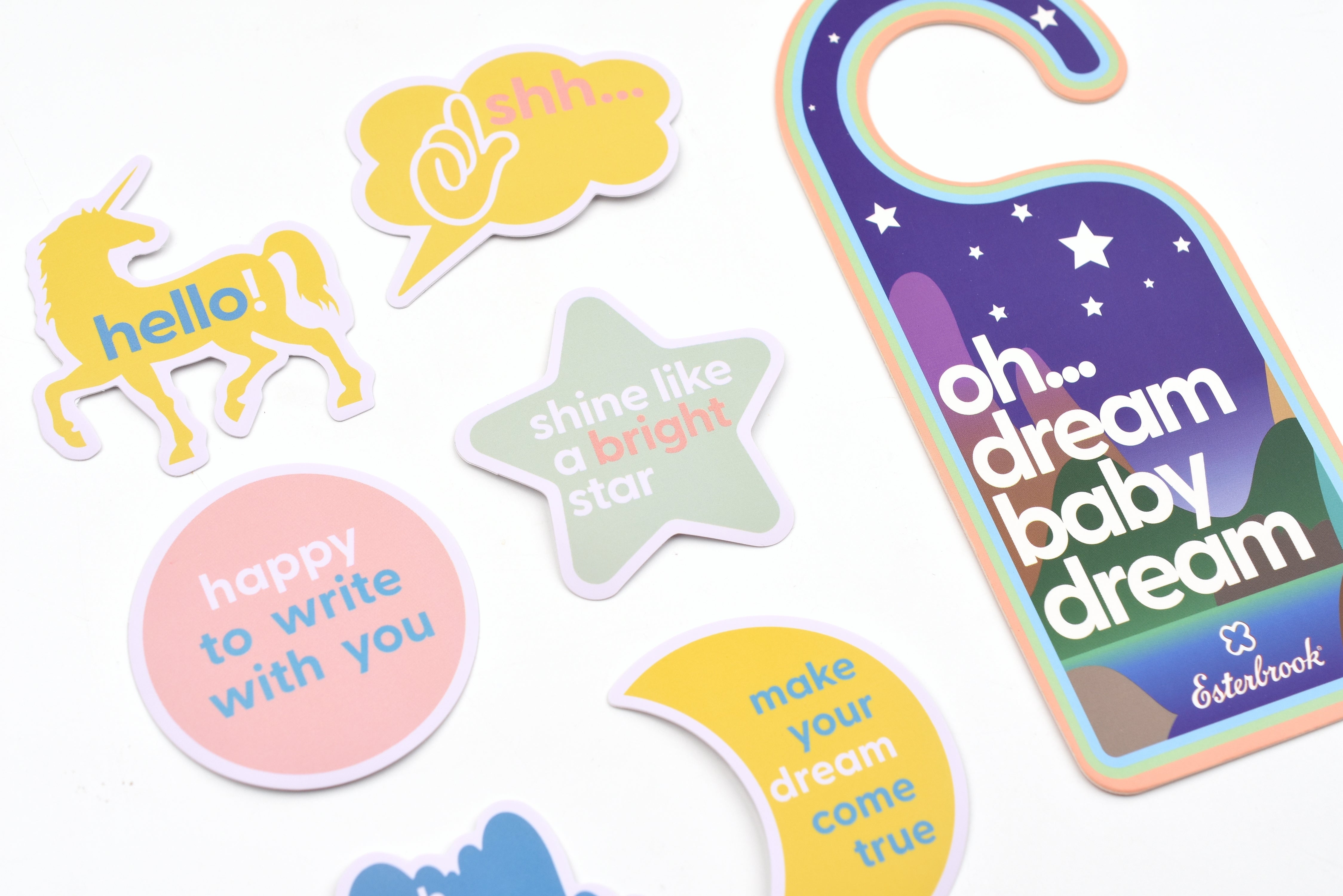 Tucked inside a whimsical box, you'll find charming accessories that complement the pen's sweet aesthetic. The pen is tucked into an adorable pink satin cushioned eye mask, paired with a cute door tag and matching stickers.