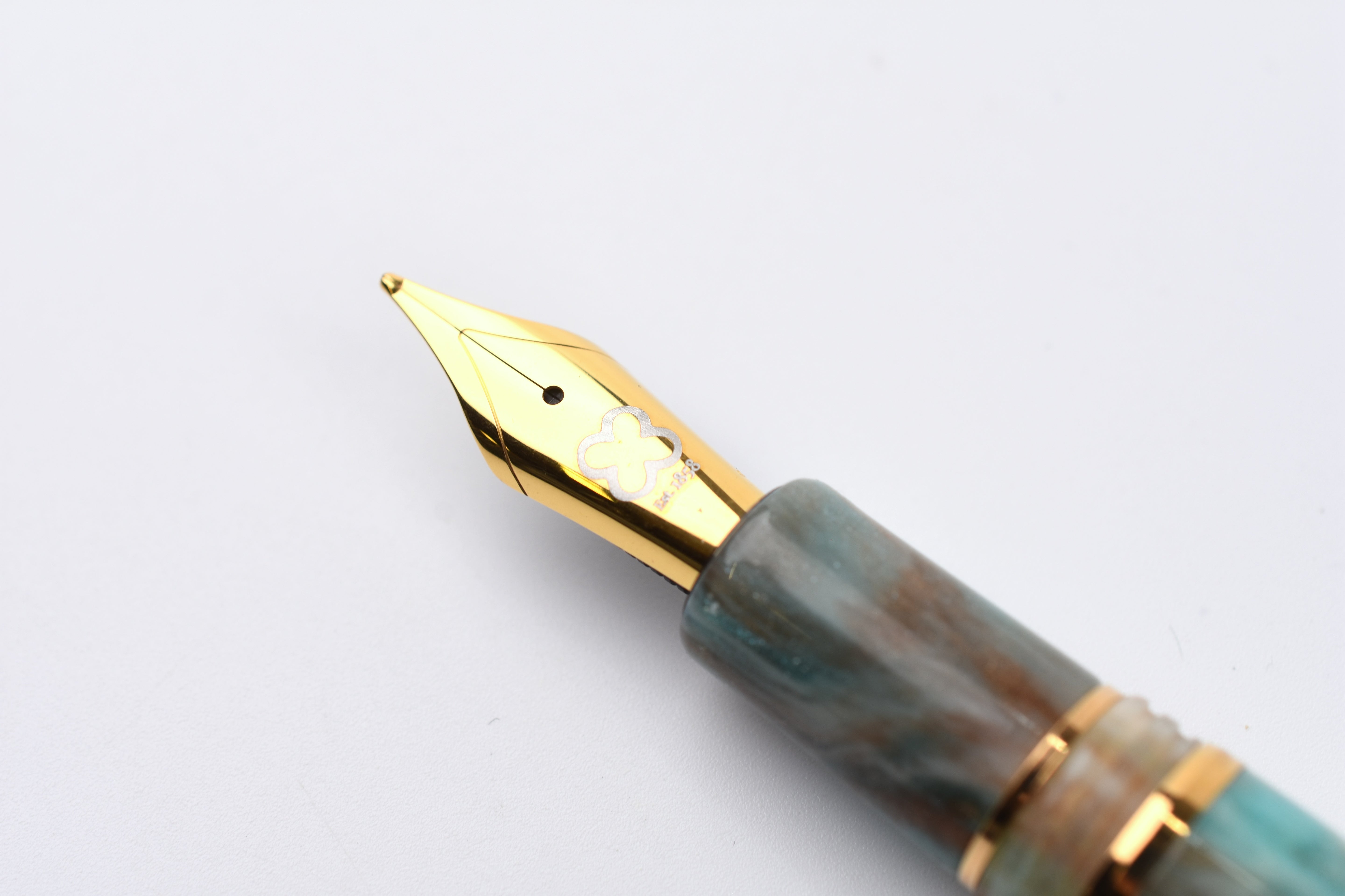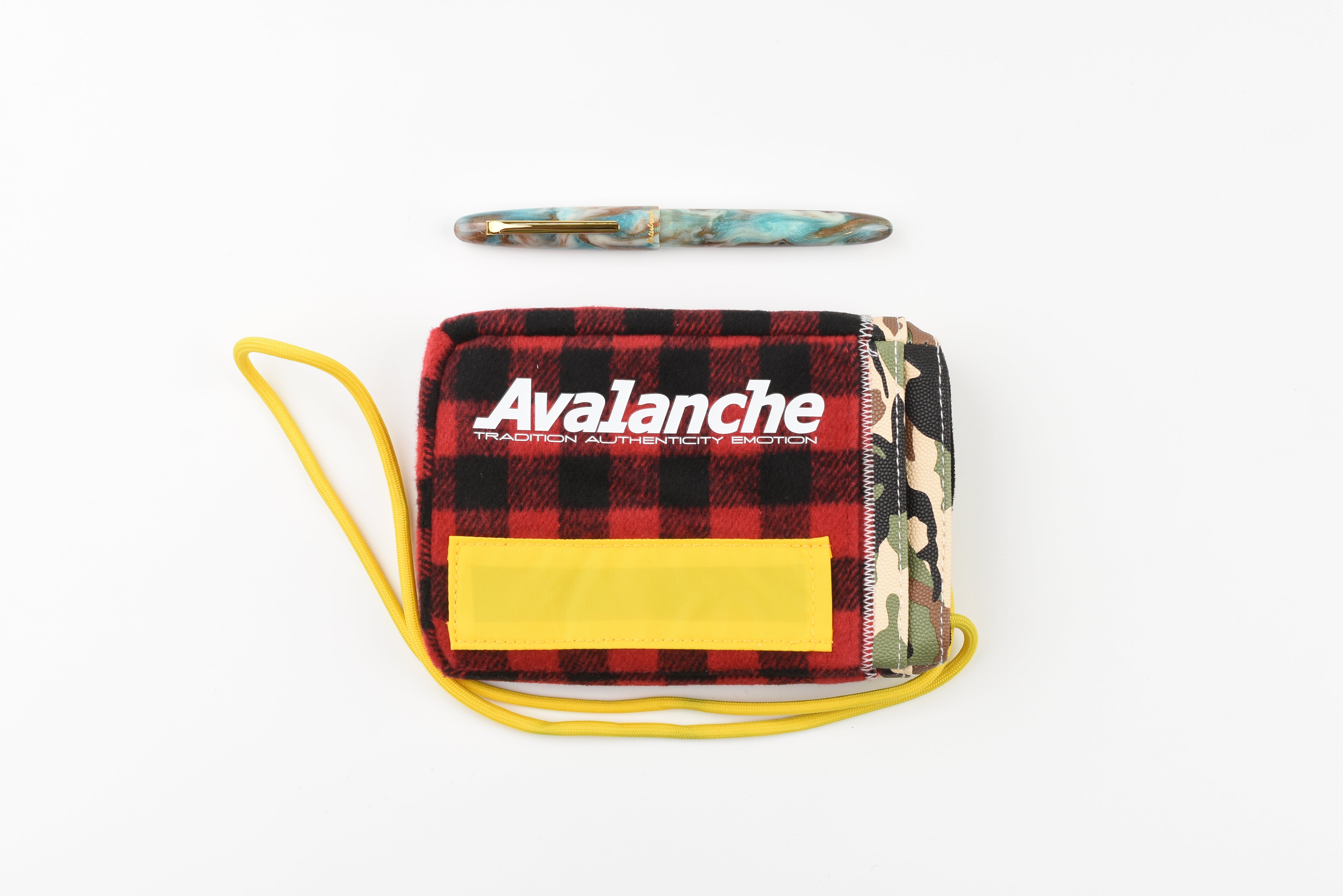 The Avalanche Estie is a striking mix of white frost, silver, turquoise, and copper, evoking the spirit of winter and alpine adventure. The special edition carrying case for this pen features multiple pockets, including a full lining to protect any pens and tools that might be carried in the pouch.