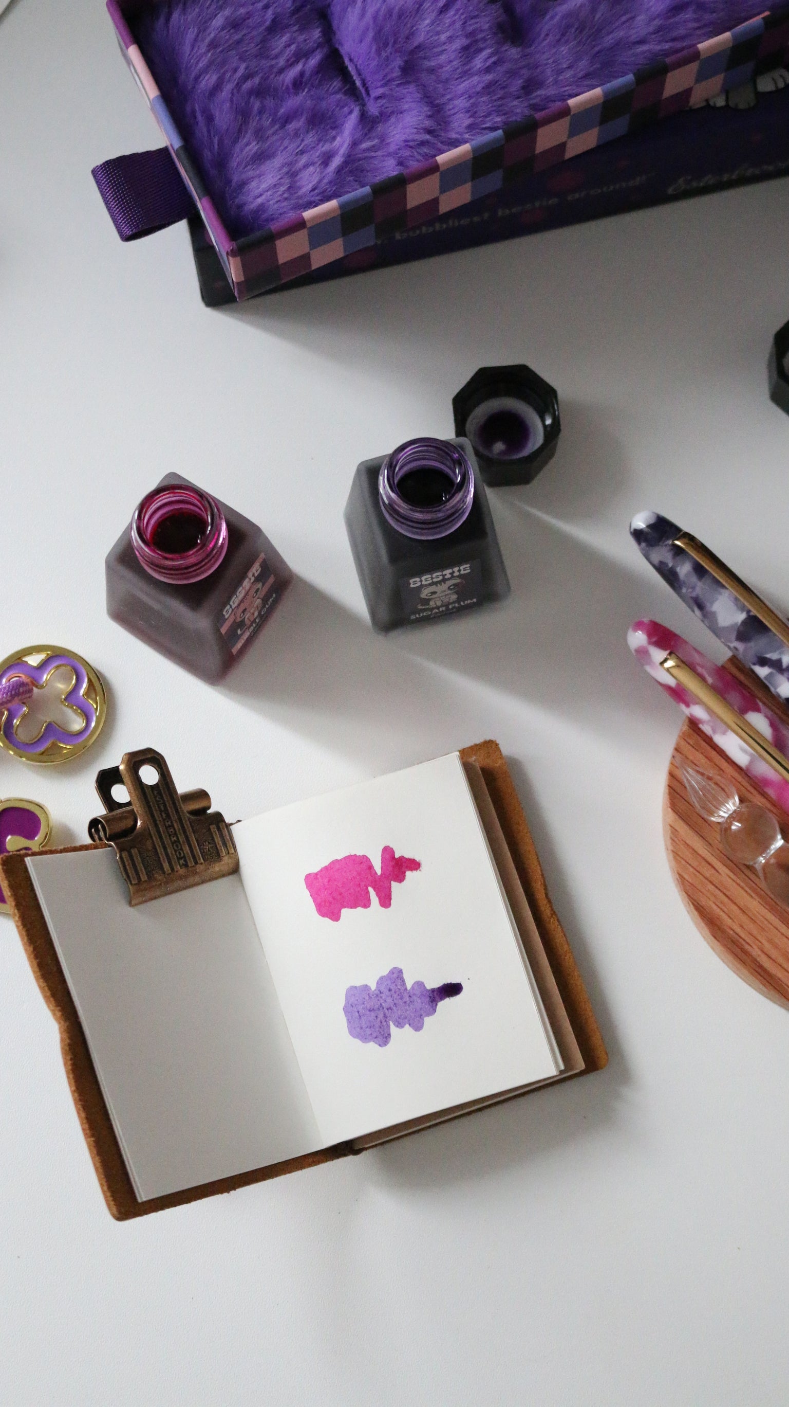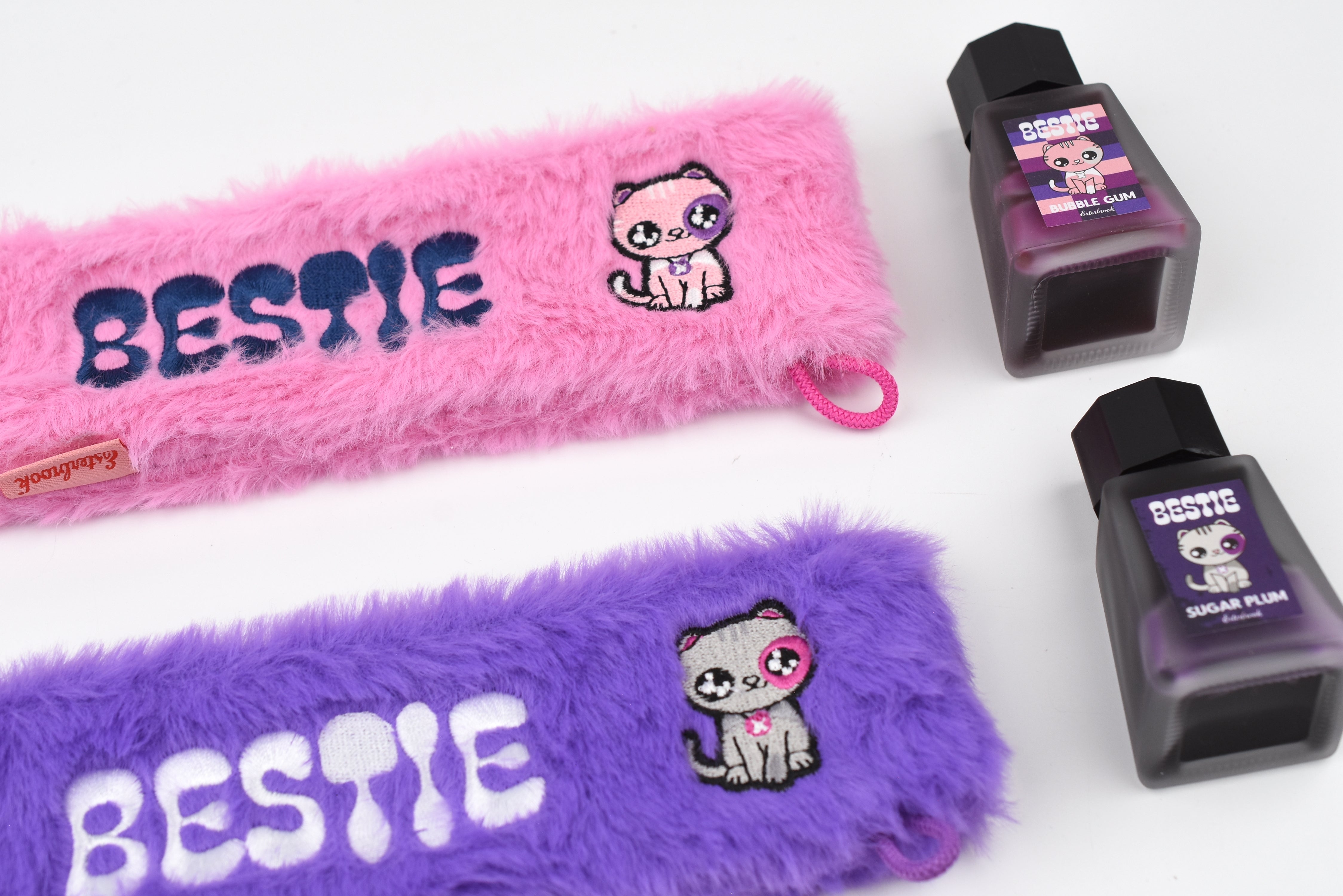 Purchase both Bestie fountain pens and receive the Bestie accessory collectibles (while supplies last) as a special gift—a perfect way to share one pen with your Bestie or enjoy the full Bestie experience together. The accessory set includes fountain pen inks in grape purple and fuchsia pink, a coordinated washi tape set (four rolls in one tube), embroidered pencil pouches in pink and purple, a Bestie key chain, and a fun sticker set.