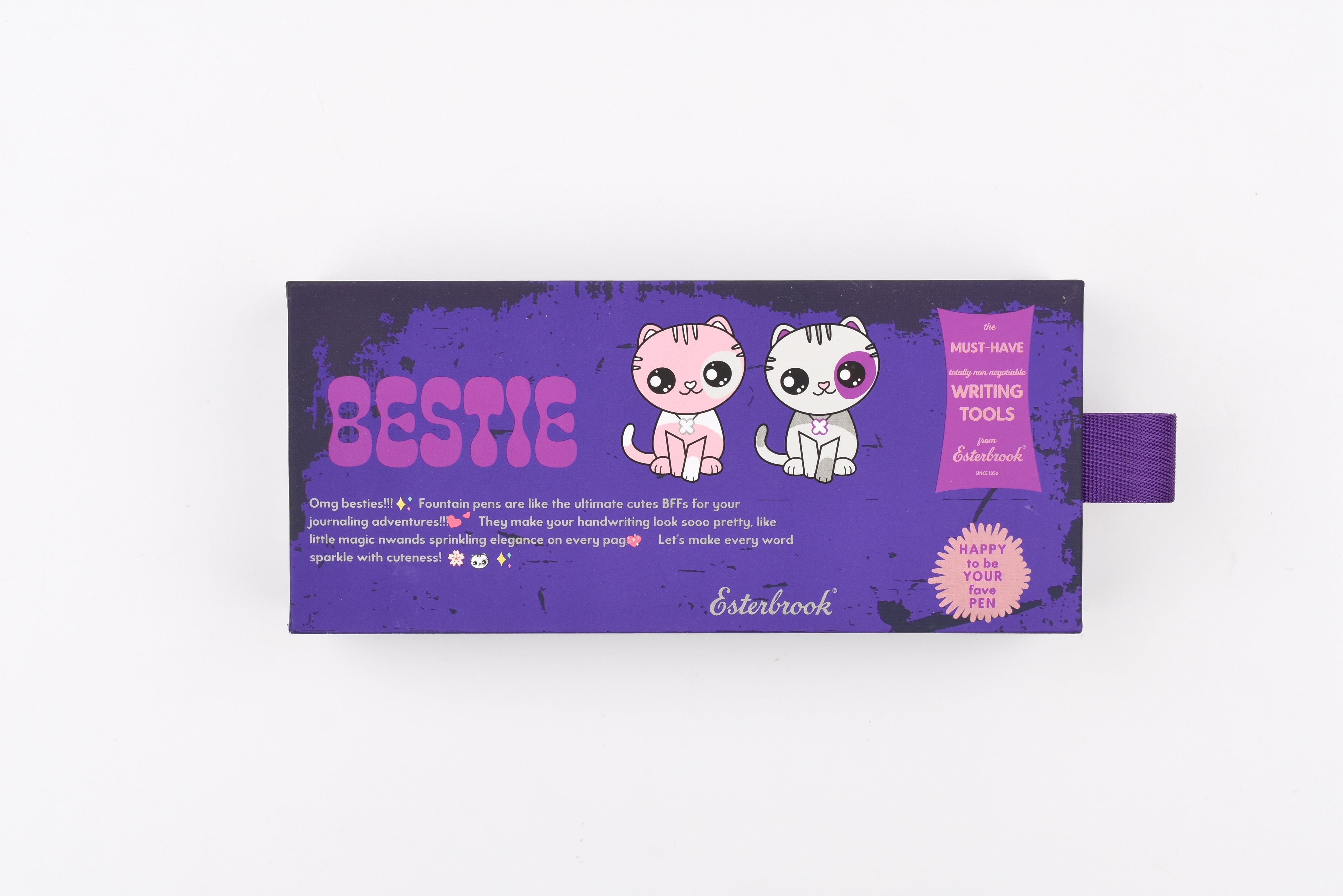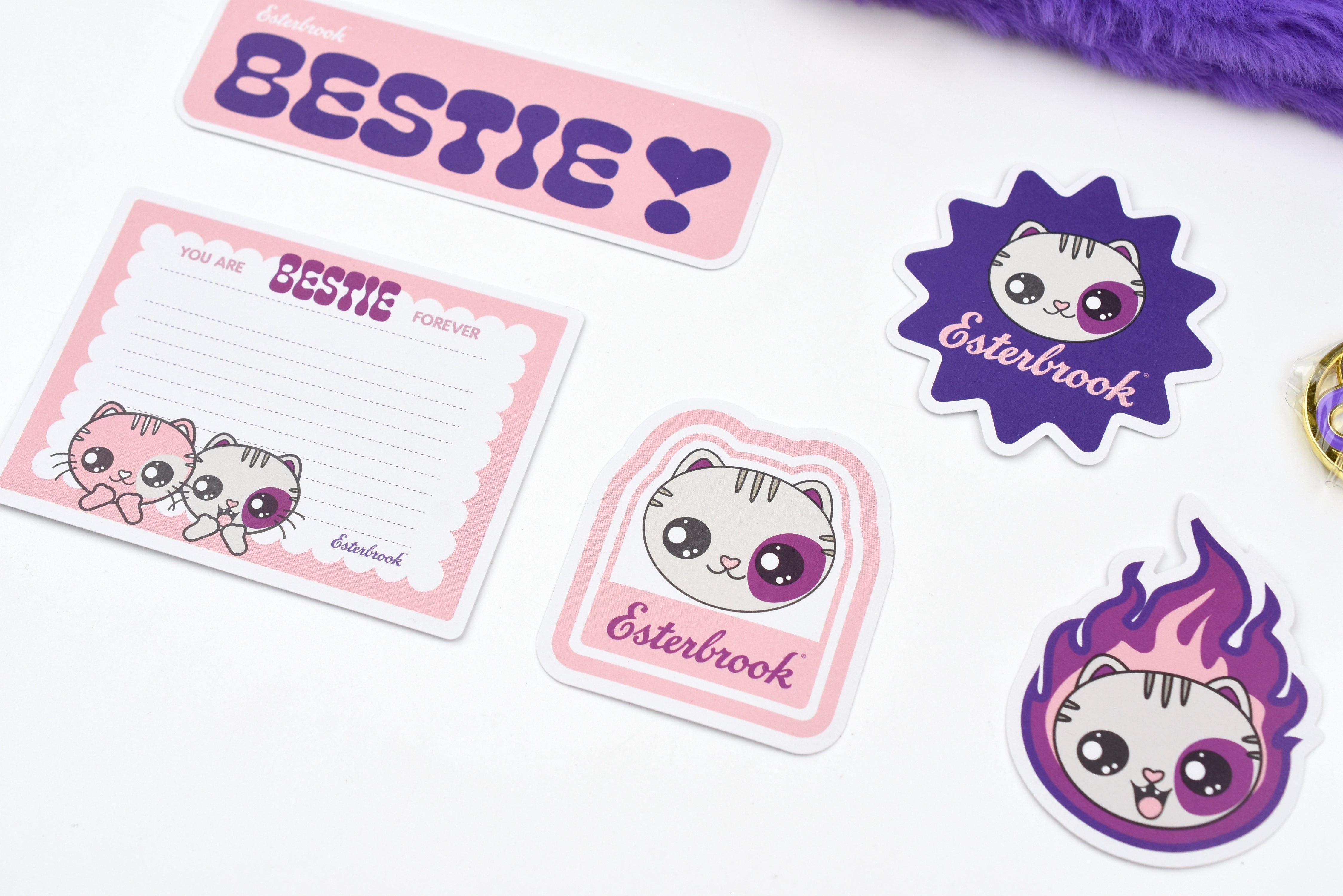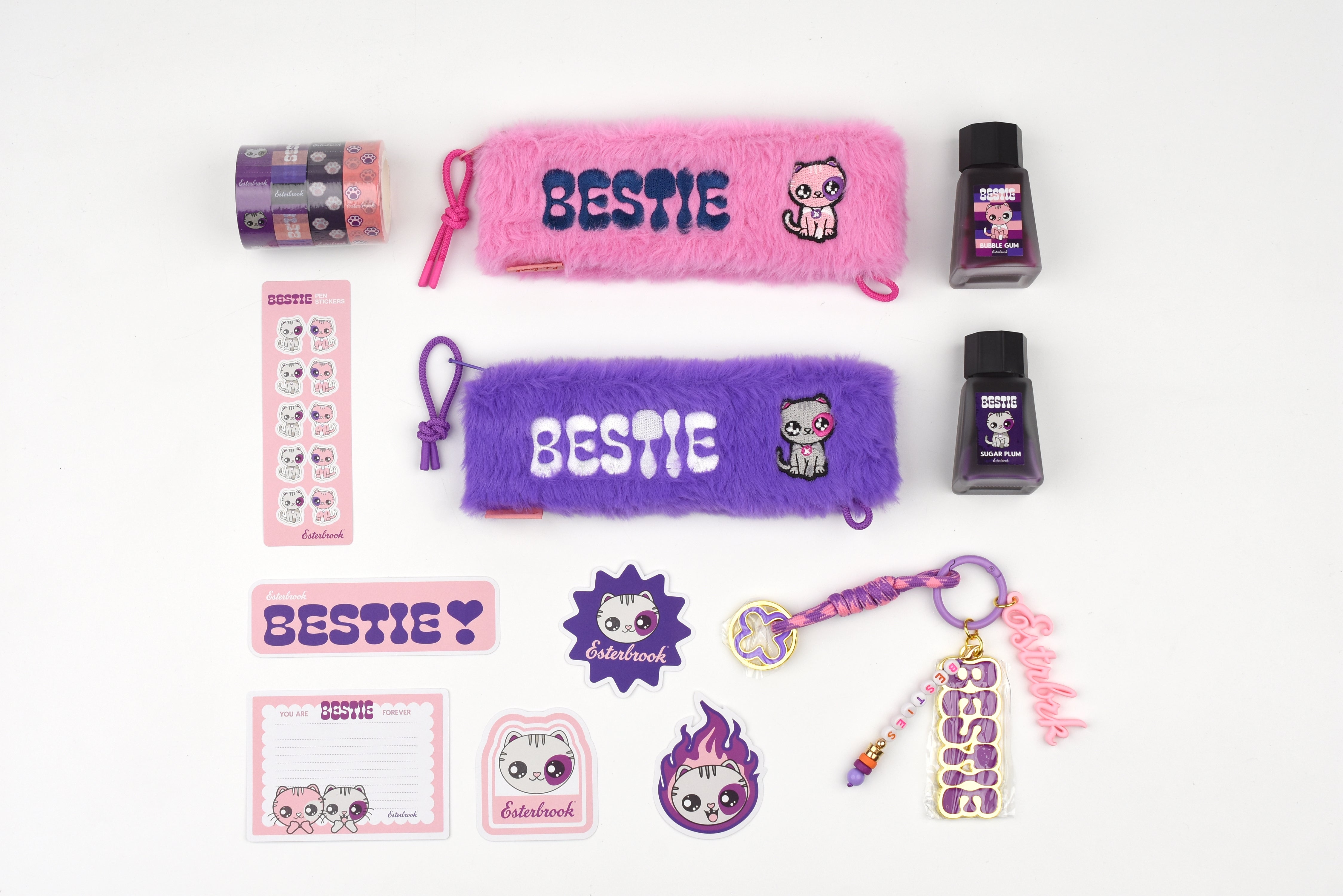 Purchase both Bestie fountain pens and receive the Bestie accessory collectibles (while supplies last) as a special gift—a perfect way to share one pen with your Bestie or enjoy the full Bestie experience together. The accessory set includes fountain pen inks in grape purple and fuchsia pink, a coordinated washi tape set (four rolls in one tube), embroidered pencil pouches in pink and purple, a Bestie key chain, and a fun sticker set.
