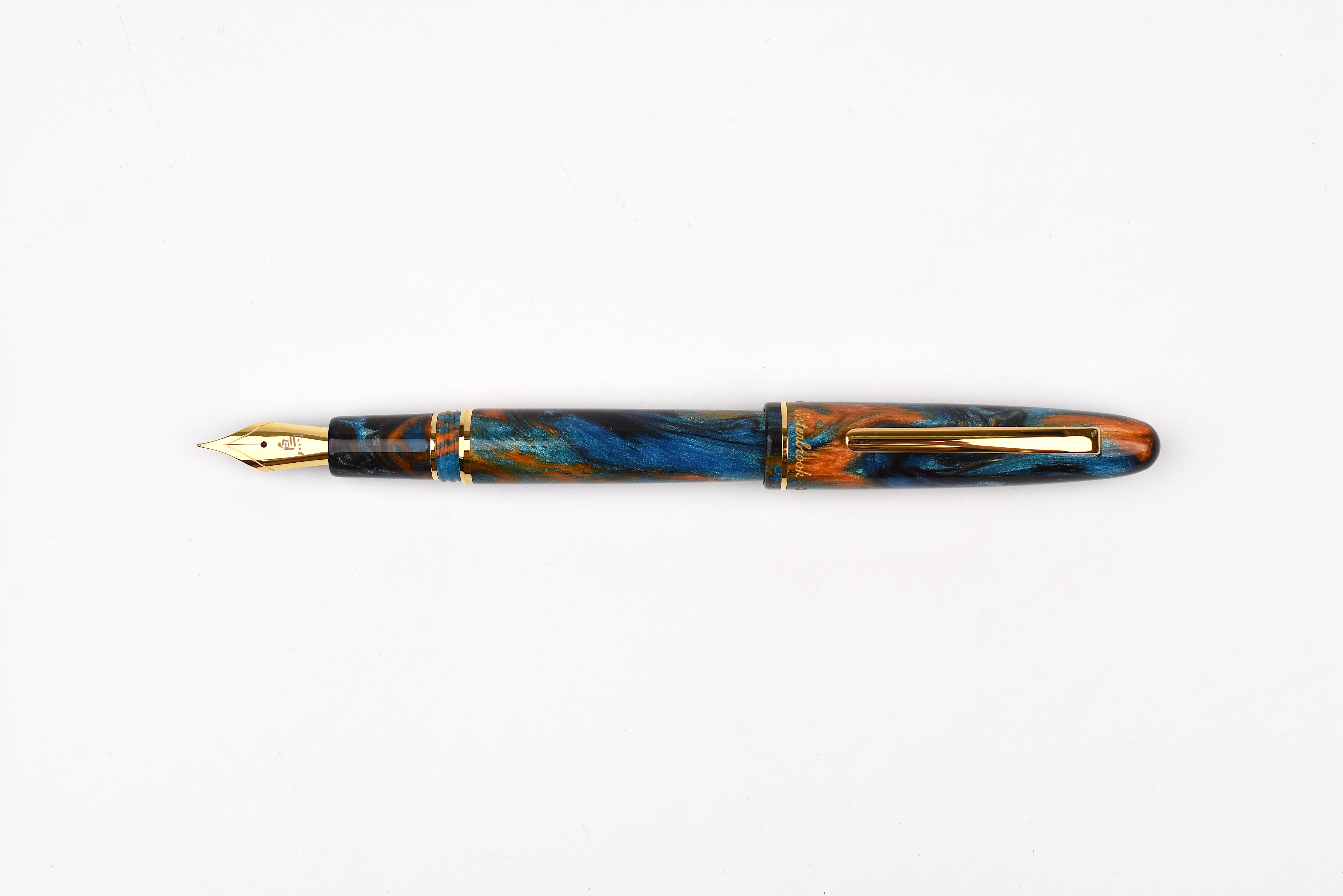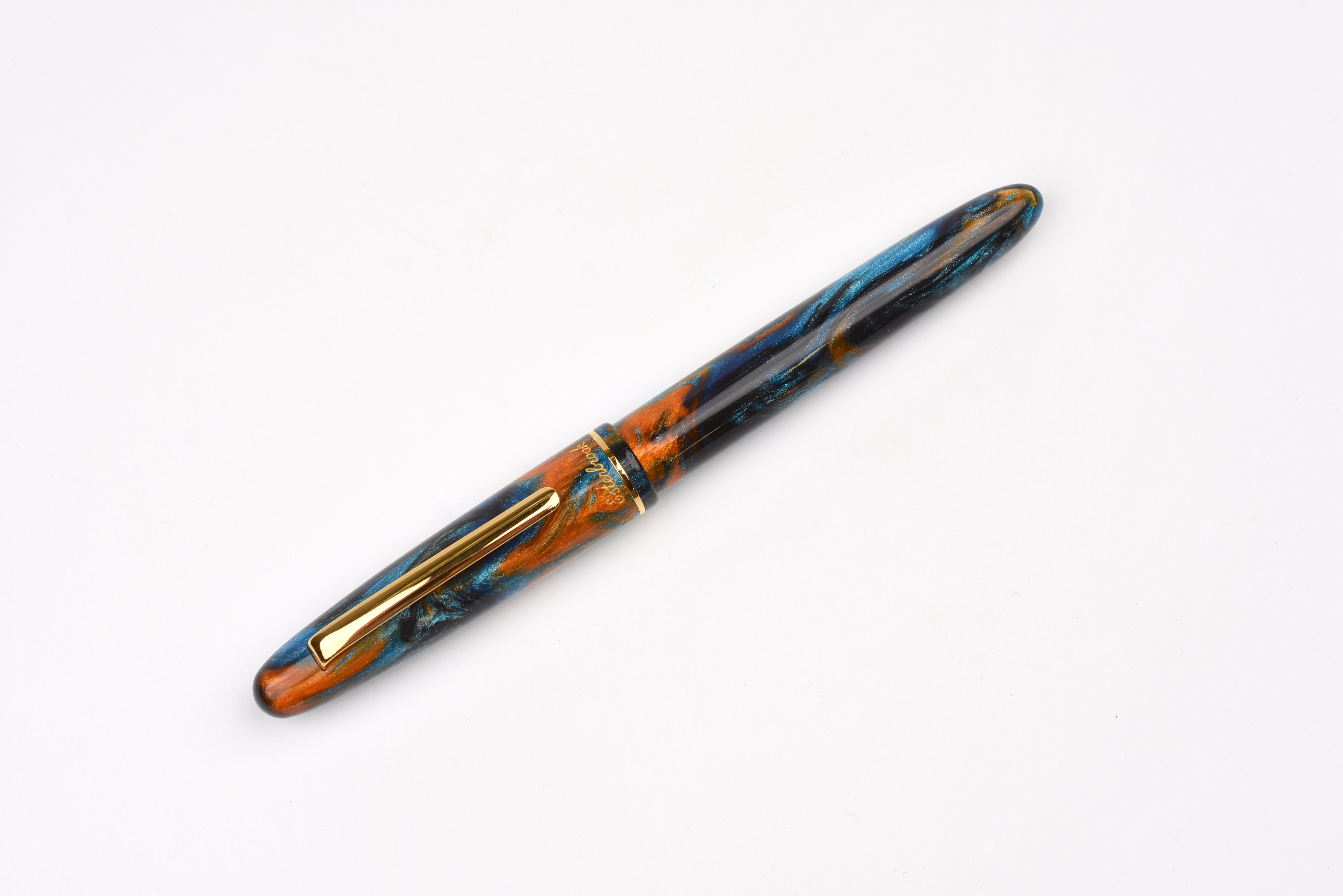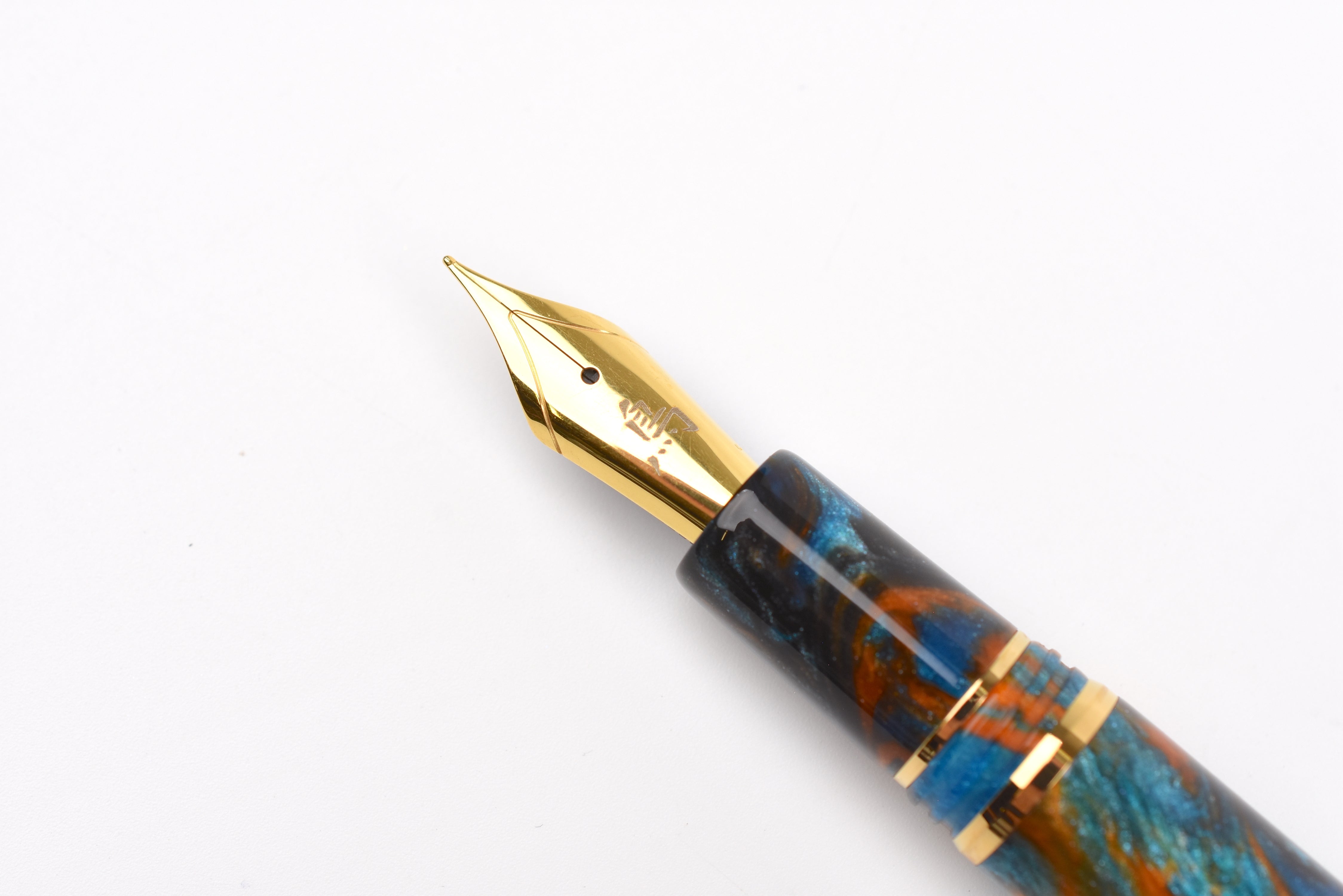 The Kingfisher Estie combines deep teal, warm copper, and soft black DiamondCast resin for a bold, eye-catching look. The pen features gold-plated trim, a specially engraved nib, and the included converter is designed with Kingfisher bird details. The rest of the Kingfisher collection includes an enamel pin, blotter paper, and ink with artwork of the Kignfisher bird which inspired this pen.