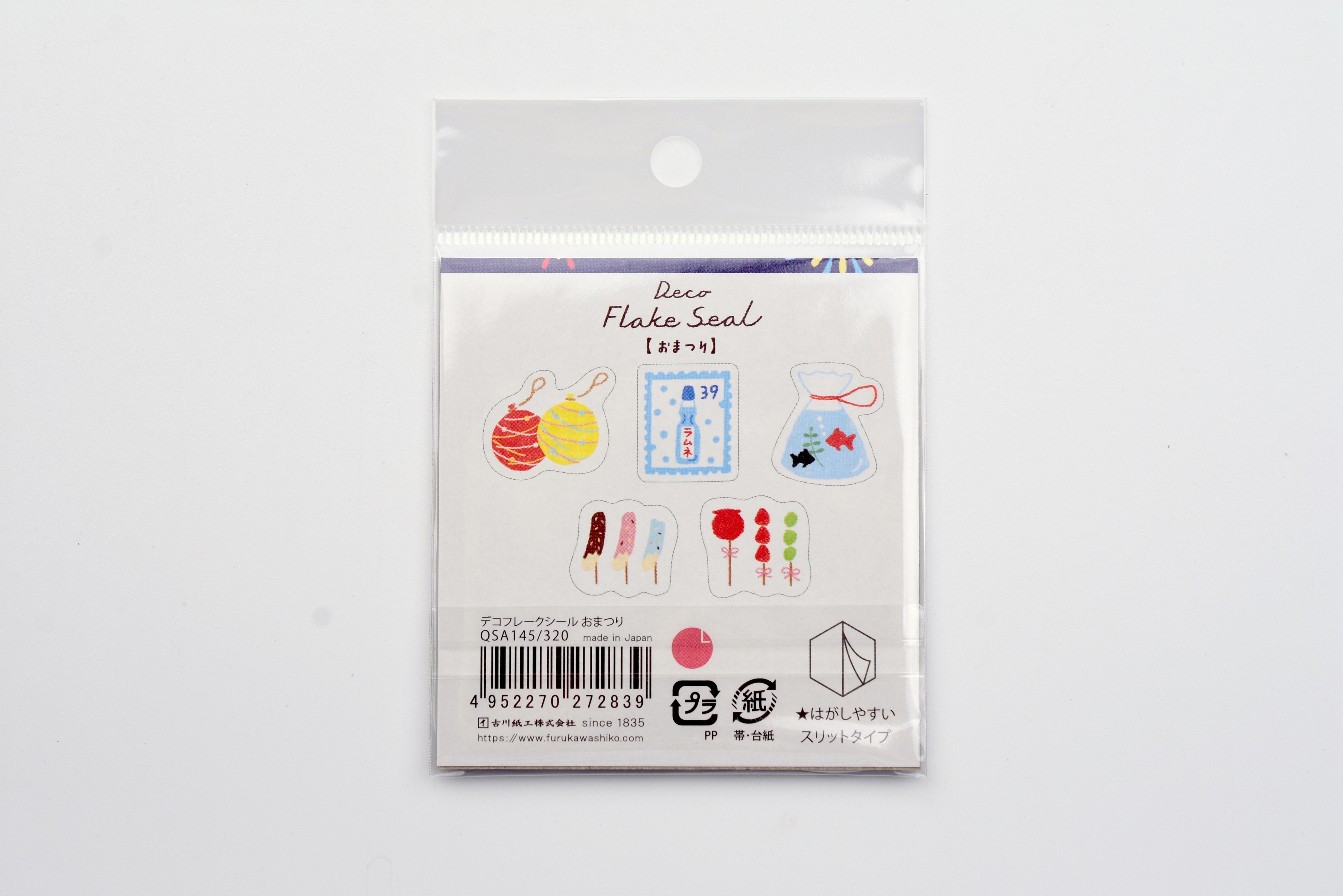 Furukawa Paper Deco Flake Sticker - Festival. Made with the Furukawa washi paper we know and love in endearing designs, these flake stickers will add whimsy and charm to your journaling, gift wrapping, or letter writing. And, these stickers have a slit film on the back so you can easily peel it off.
