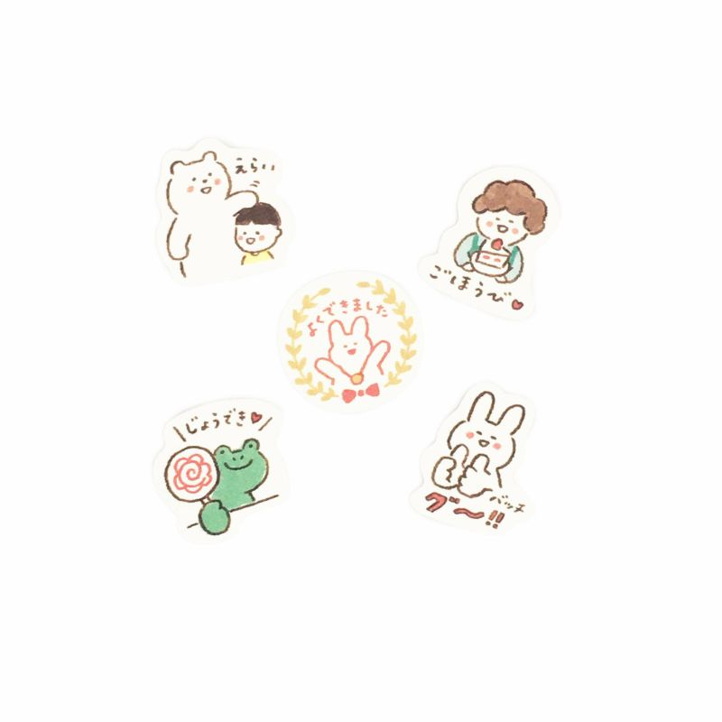 Stickers conveying different praise phrases for a job well done featuring human, frog, bear, and rabbit characters in an illustrated style.