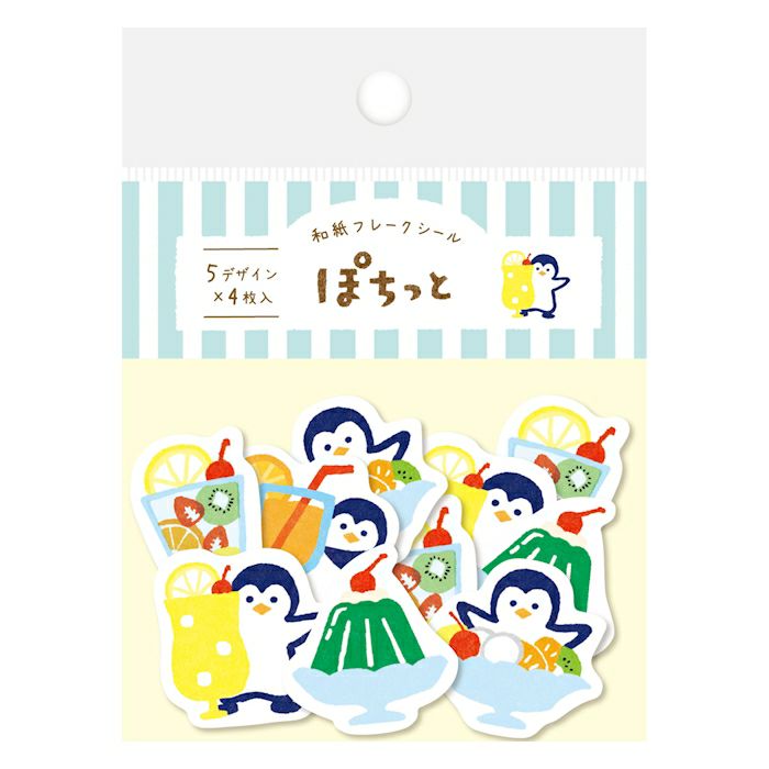 Furukawa Paper "Pochitto" Flake Sticker - Penguins & Cold Treats. Made with the Furukawa washi paper we know and love in endearing designs, these flake stickers will add whimsy and charm to your journaling, gift wrapping, or letter writing. And, these stickers have a slit film on the back so you can easily peel it off.