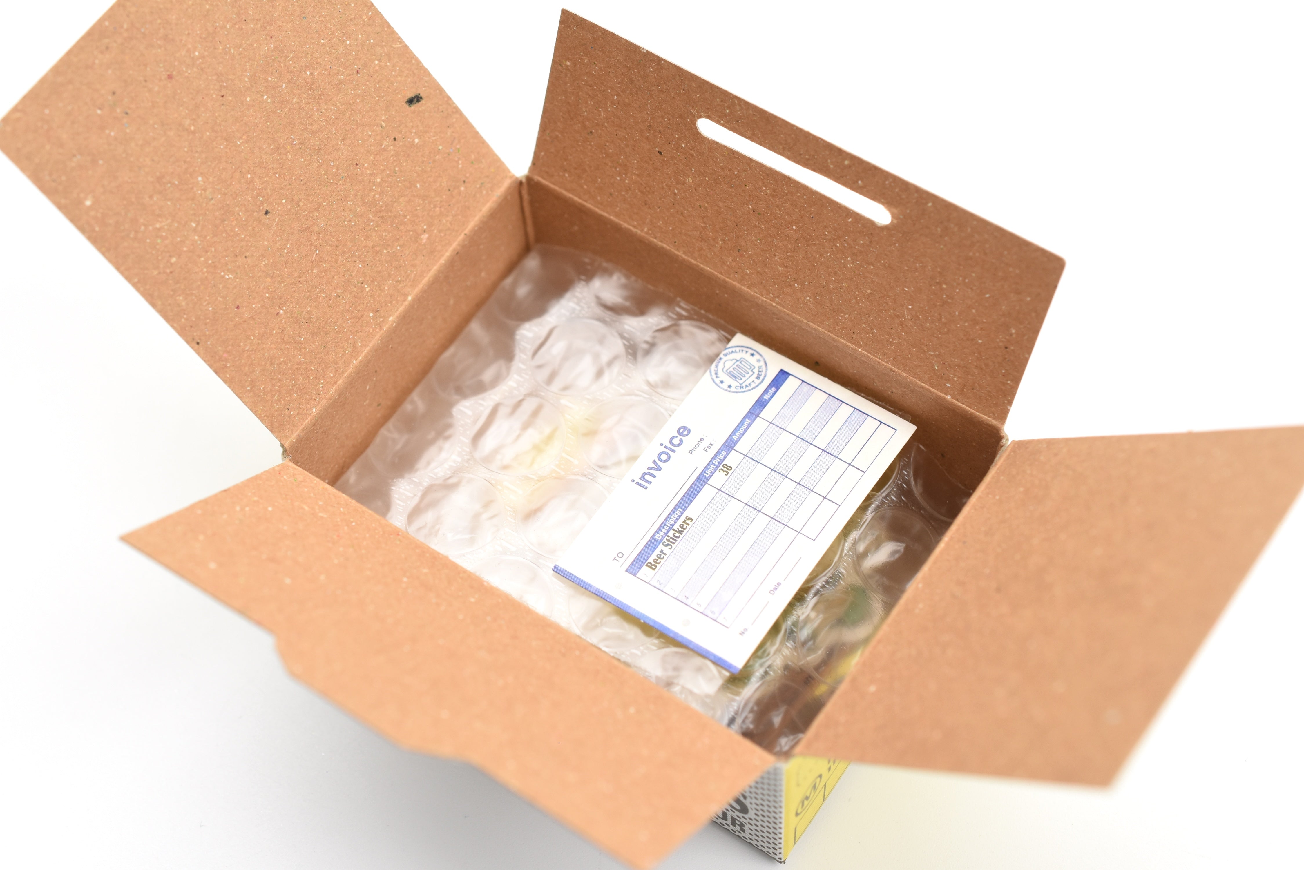Greeting Life's Flake Stickers come in a miniature shipping box, complete with a tiny invoice inside! Each box includes 40 unique stickers with fun holographic finish.