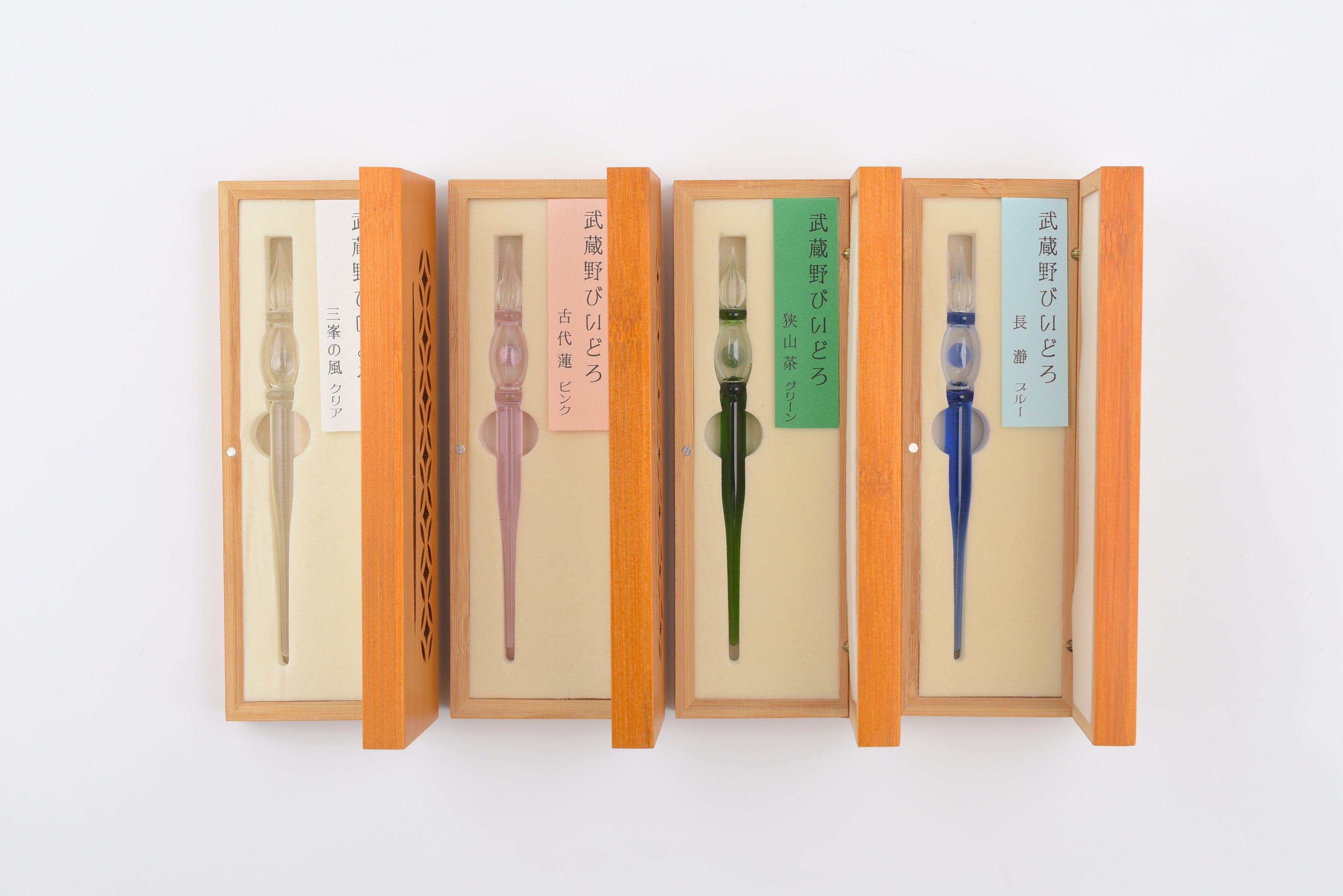 These glass pens are inspired by scenic spots and local specialties from Musashino, Japan, which extends across the Kanto Plain. Inside the glass pen's hollow barrel rests a small glass bead that gently chimes like a wind bell when shaken, adding a touch of charm to every use. The pen is presented in an elegant wooden box, making it a thoughtful and memorable gift.