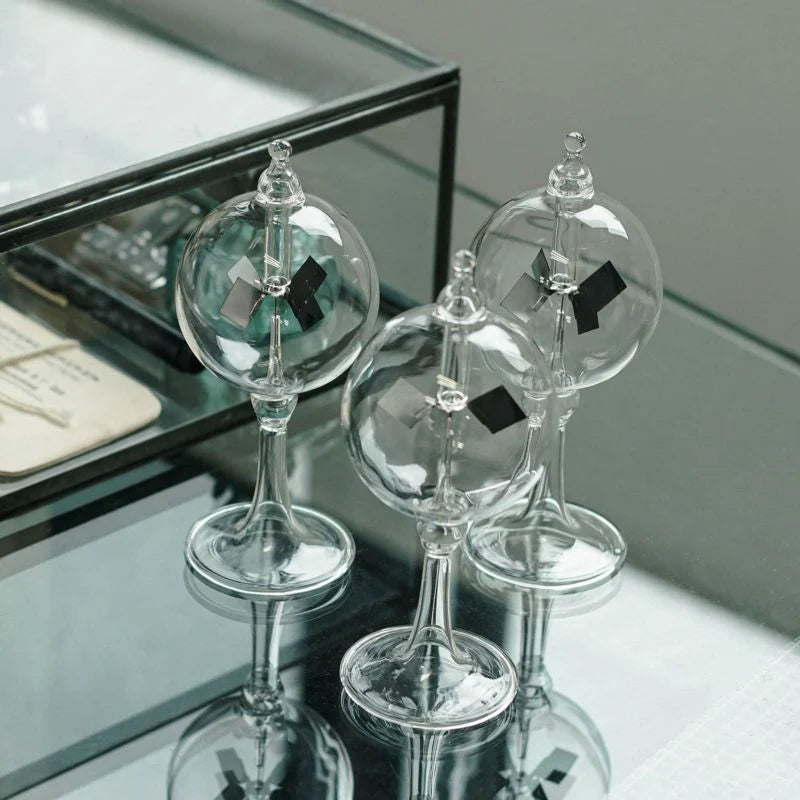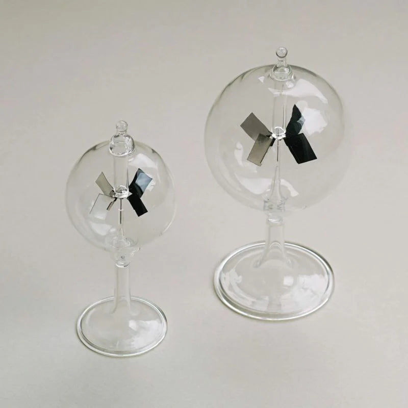 A radiometer, invented in the 1870s to turn light into kinetic energy, spins when hit by light. Feel free to shine a flashlight on it to test it out!