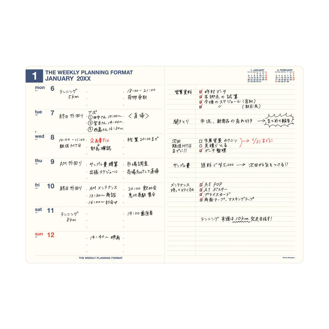 Each weekly spread is laid out with the days of the week on the left-hand side and a lined section for notes, lists and reminders on the right. The Minute Manager also includes a yearly overview, monthly pages, weekly pages, and lines pages.