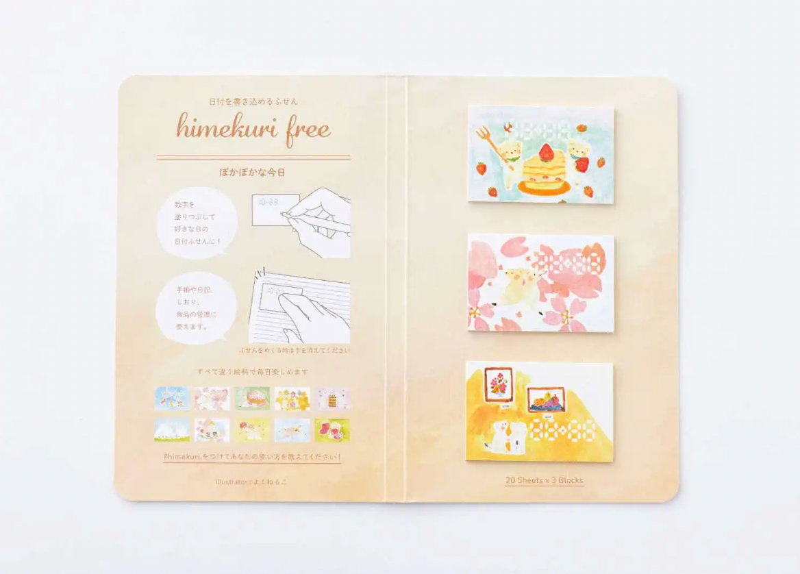 Himekuri Day-Free Sticky Calendar. Himekuri traditionally means a daily tear-off calendar, but Himekuri Sticky Calendar's take on it is a relatively new calendar concept since 2018. To put it simply, it’s a combination of the traditional daily calendar and a sticky memo. Typically on a himekuri daily calendar, the pages are thrown away right away. With this sticky memo version, each page not only works like a daily calendar but also can be reused in a journal or other places as a cute way of marking your daily memories throughout the year — in cards, as bookmarks, or any places where you mark dates.