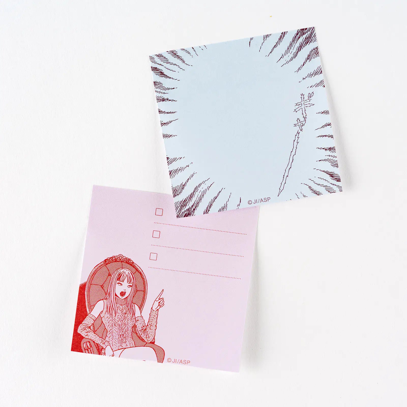 These sticky notes feature artwork from Tomie, the debut and one of the most iconic works of horror manga artist Junji Ito. Using original illustrations from the manga, created nearly 40 years ago in 1987, the designs capture the eerie, one-of-a-kind world Junji Ito is known for.