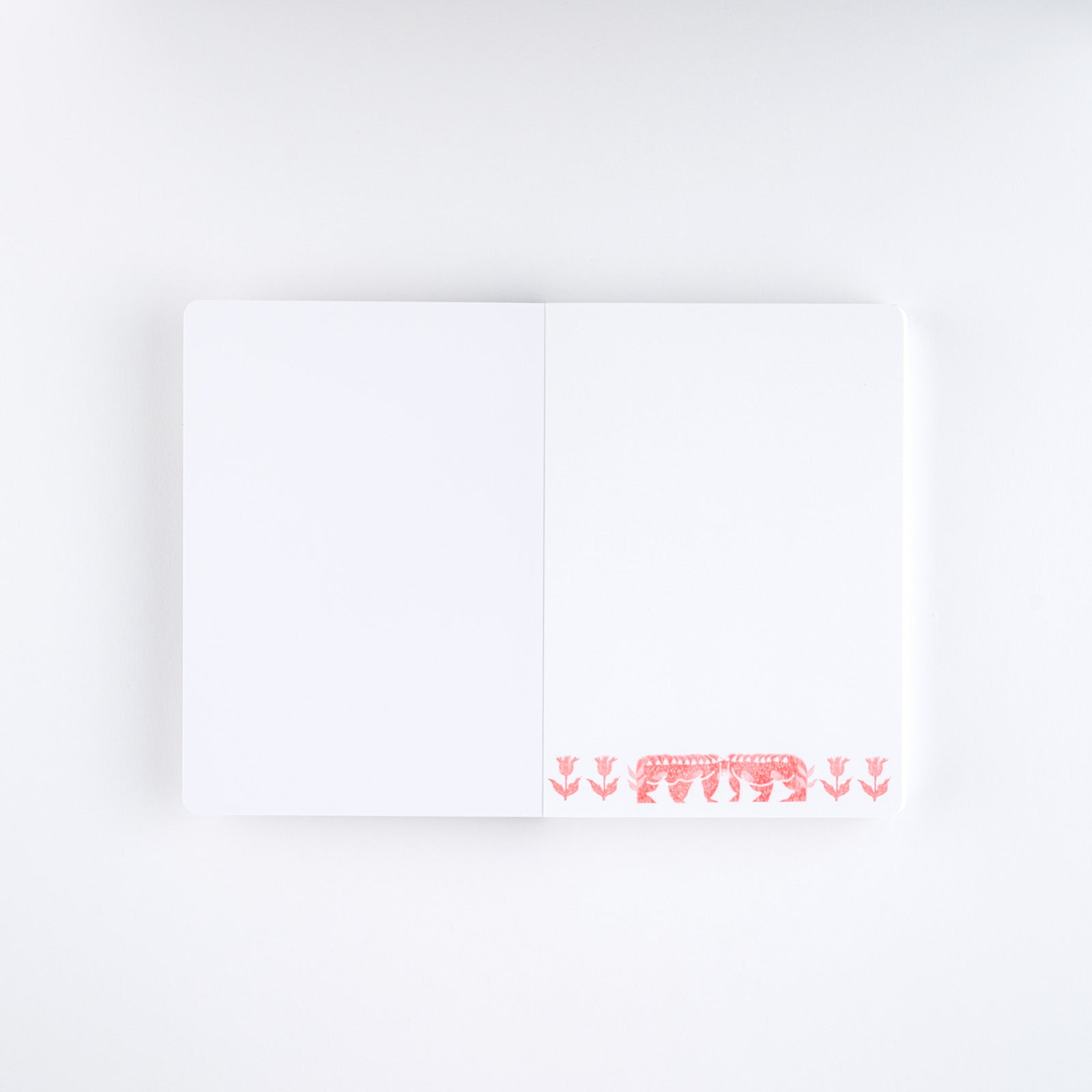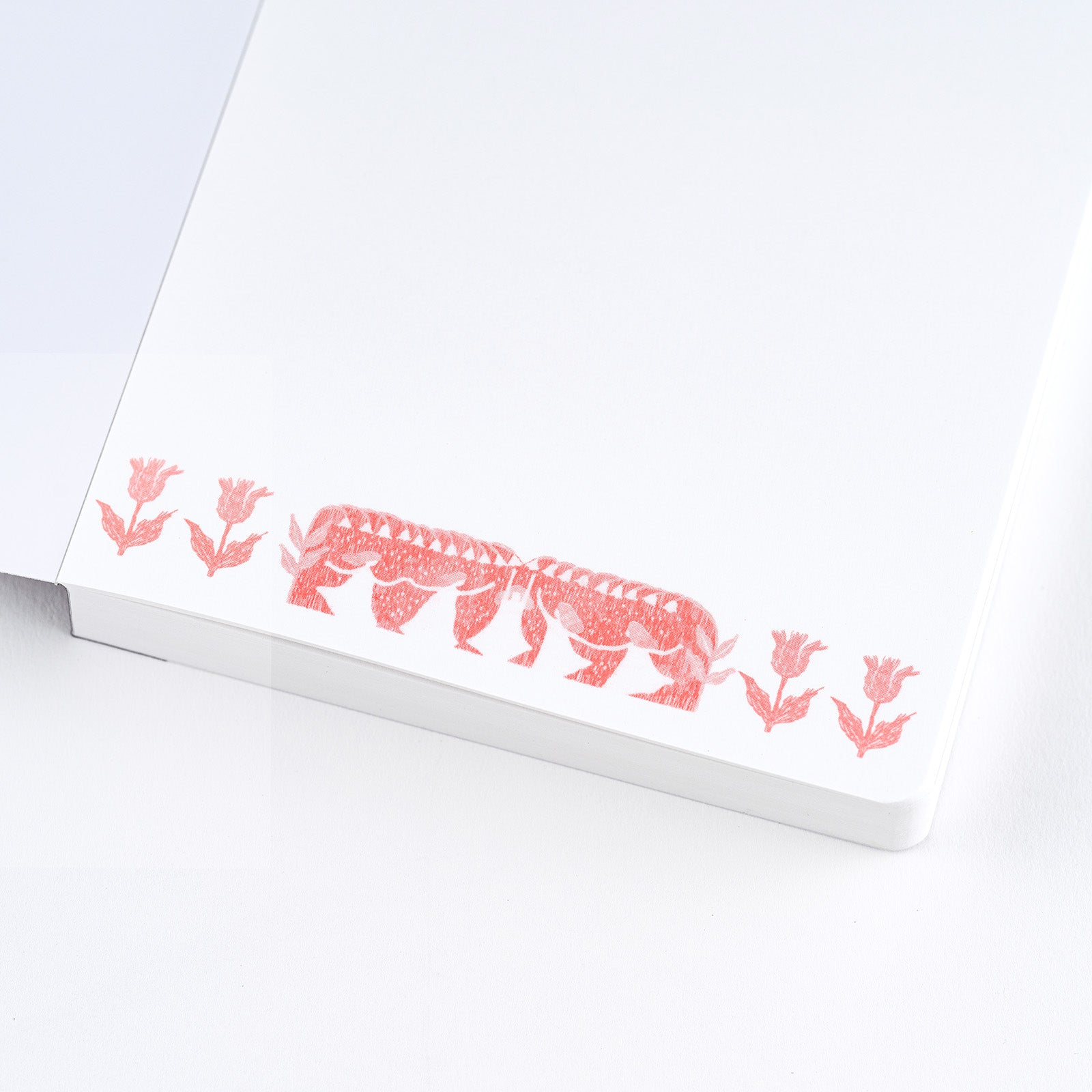 This A6 notepad has 155 pages. The paper inside is blank except for a lightly printed illustration, and the pages are glued in instead of sewn, making them very easy to rip out for shopping lists or passing along messages.