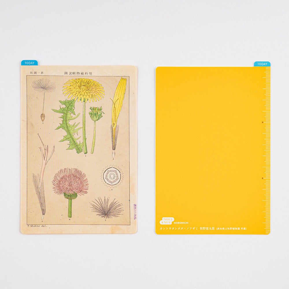 The A6 pencil board displays a precise botanical illustration of a Kanto dandelion and Japanese thistle. The back is a bright yellow that matches the dandelion.