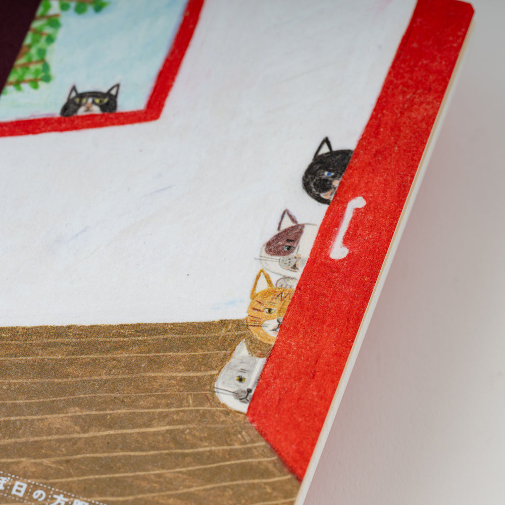 “Who is it?” depicts cats noticing the sound of a guest that has come to their house and staring at the front door from the room door and even from outside the window. Are the cats in a welcoming mood, or are they trying to see if they can let the guest inside? A unique scene from their daily life is rendered with a warm touch of oil pastel. The back cover is as red as the door, with Keiko Shibata’s autograph printed.