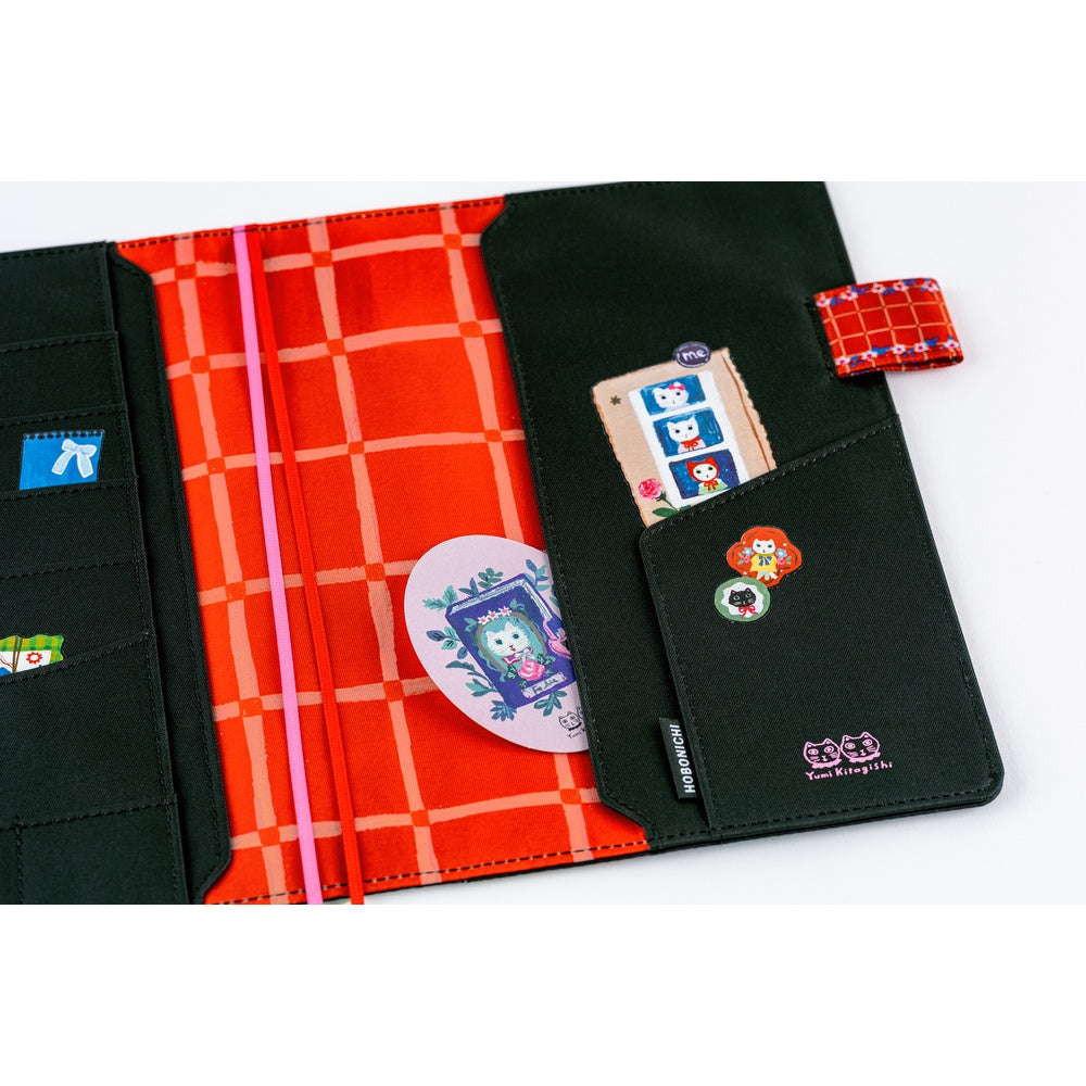 This cover will comfortably fit A5 notebooks with a spine of 0.5 inches (1.27cm) or smaller. Though it has the capacity to fit spines larger than 0.5in, the cover might have a tighter fit. Add a clear Hobonichi Cover on Cover to protect this cover from wear and tear and add extra space for storing photos, stickers, and postcards.