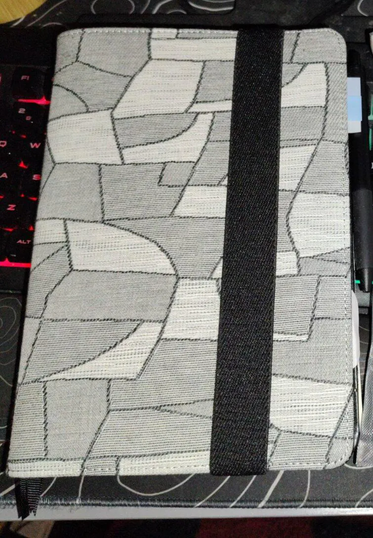 Yuge Fabric Farm: Kagome Lattice Crest uses a brocade fabric cover, featuring the intricate "kagome" lattice pattern reminiscent of a traditional Japanese stone wall. Originally designed for kimonos and obis, this soothing gray-toned material exudes a serene charm that complements any style. Its minimalist design and practical features, including a convenient pen clip hook, make it a versatile and sophisticated choice."