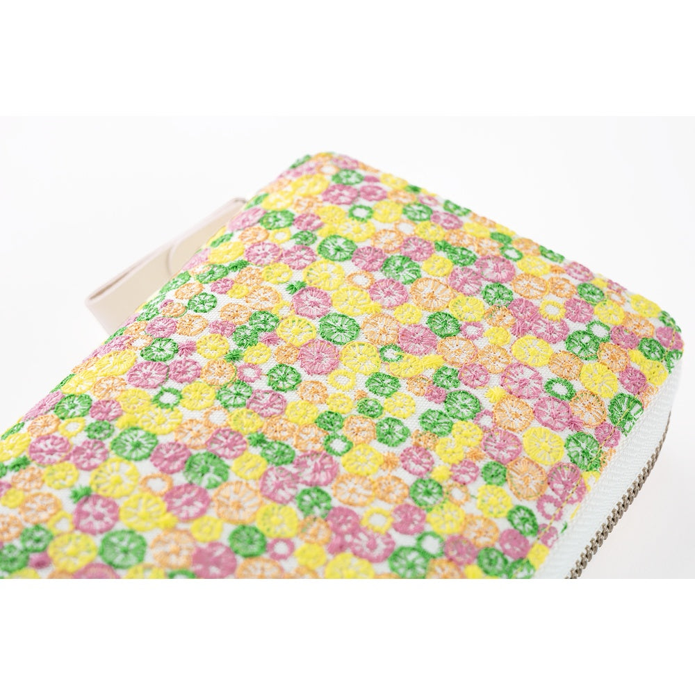 Inspired by the twinkling stars above, this cover features multicolored embroidered dots in a color scheme created exclusively for the Hobonichi Techo. Made from soft cotton fabric with two types of embroidery thread, it offers both texture and charm. The vivid yellow interior contrasts beautifully with the vegetable-tanned leather zipper pull, while the butterfly-shaped fastening adds a whimsical touch. Inside, a pen hook holds a pen securely by its clip.