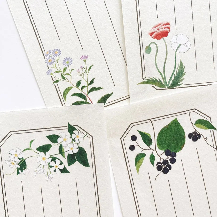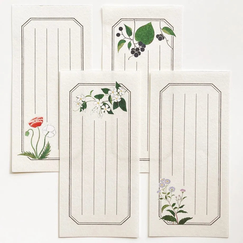 A stylish notepad inspired by botanical picture books from Japan’s Edo period. It features beautiful illustrations of seasonal Japanese plants like Poppy, Teika Kazura, Aotsura Wisteria, and Nokon Chrysanthemum. The warm, modern design adds a touch of elegance to your messages. Made with Mino washi paper, it has a fun, rough texture that gives a unique and enjoyable writing feel.