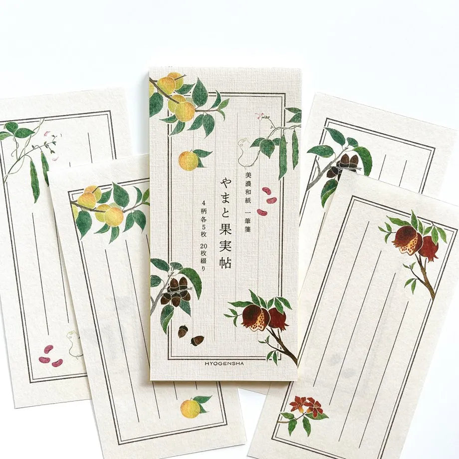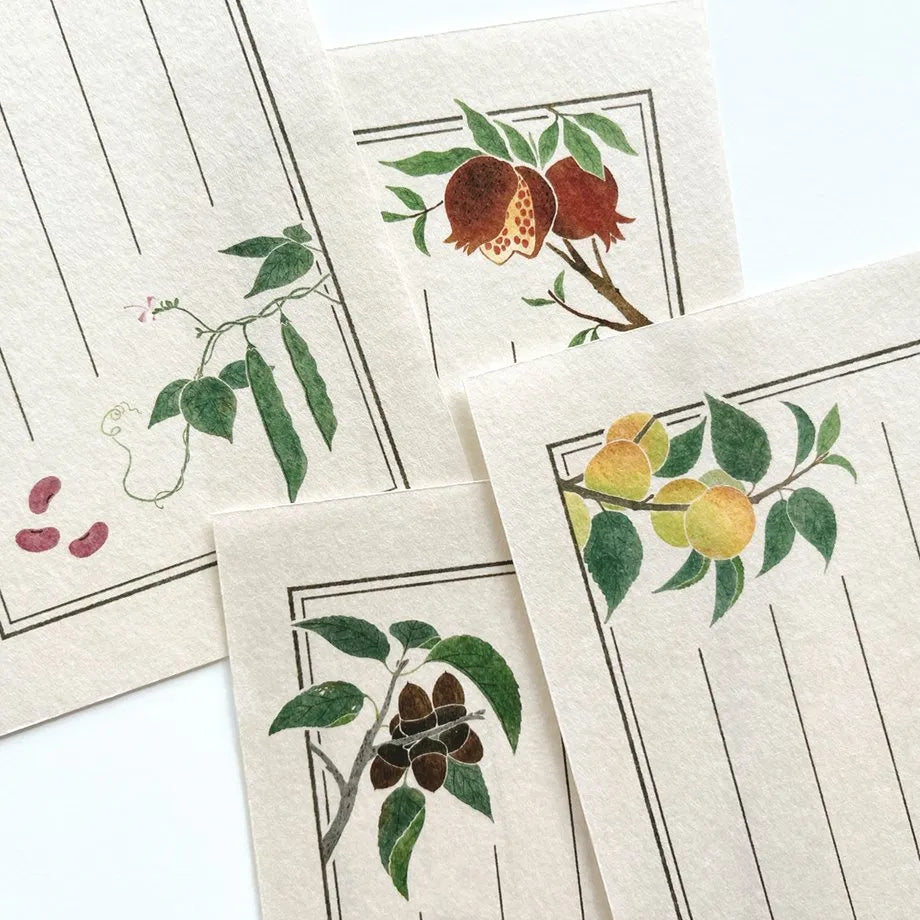A stylish notepad inspired by botanical picture books from Japan’s Edo period. It features charming illustrations of seasonal Japanese plants and fruits, including Plum, Kidney Bean, Pomegranate, and White Oak (Acorn). The warm yet modern design adds a touch of elegance to your messages. Made with Mino washi paper, it offers a fun, rough texture that enhances the unique and enjoyable feel of writing on traditional washi paper.