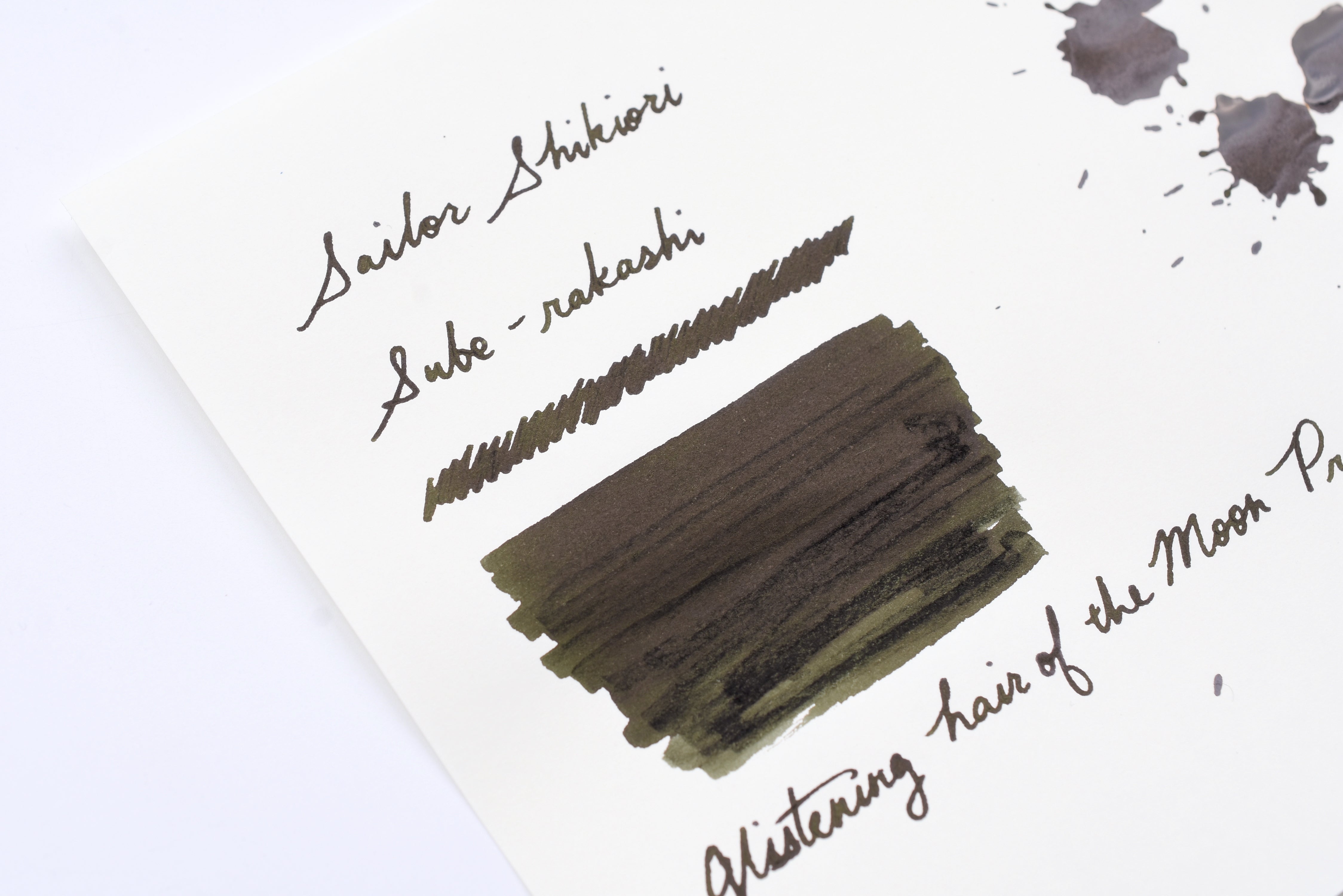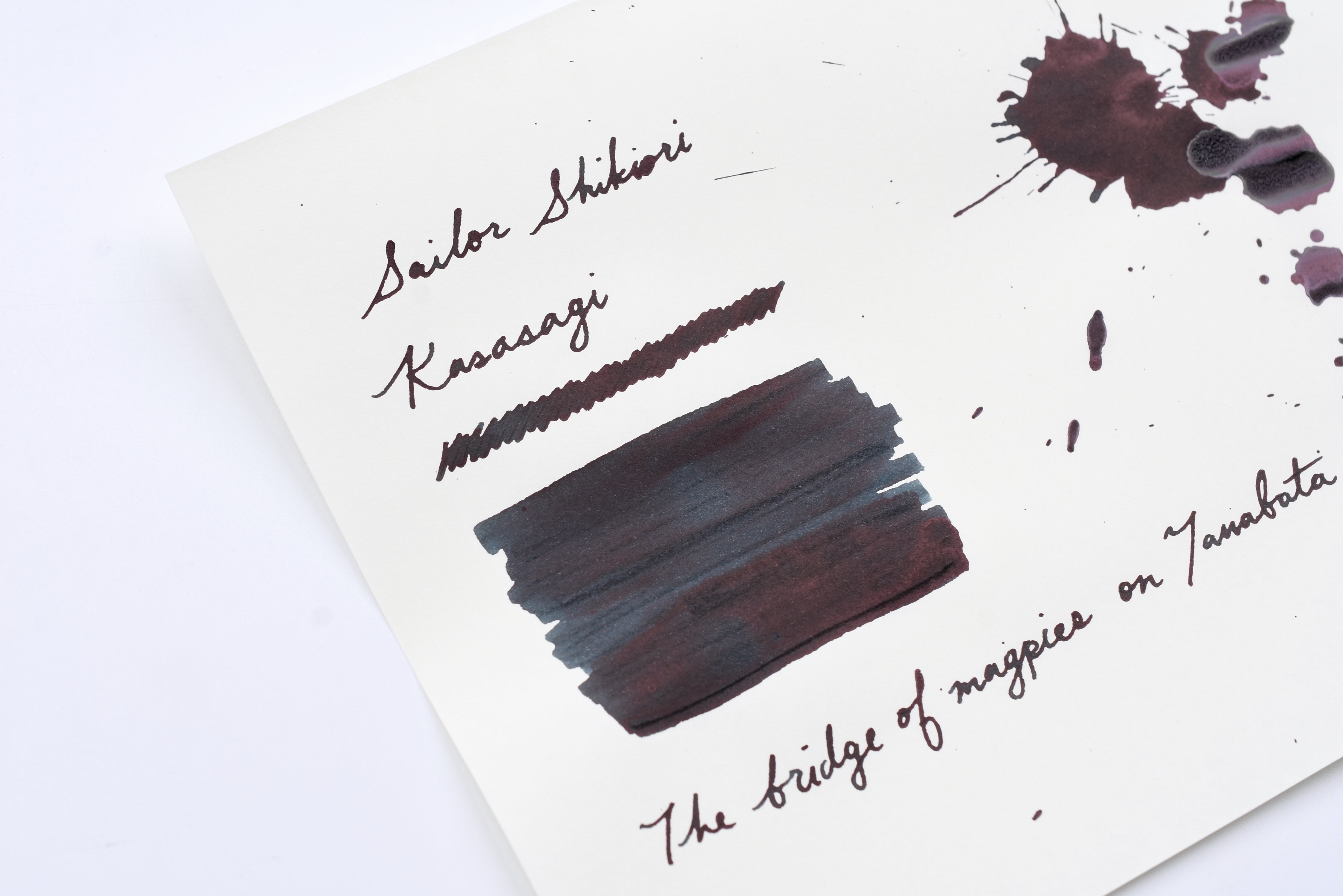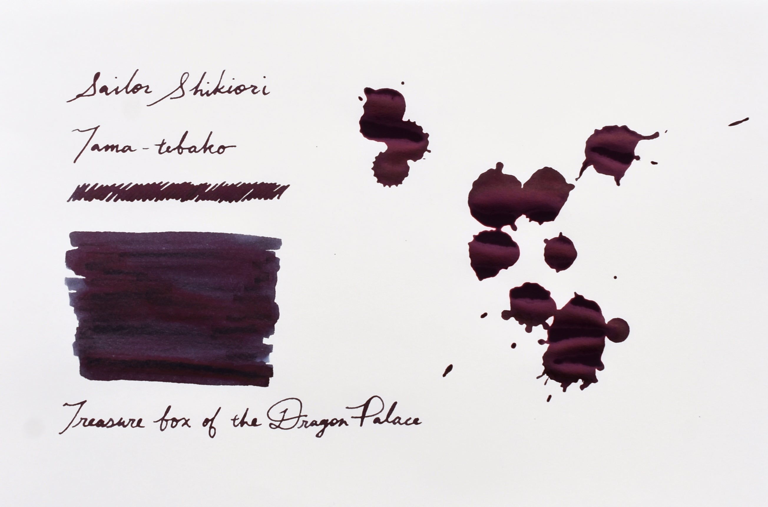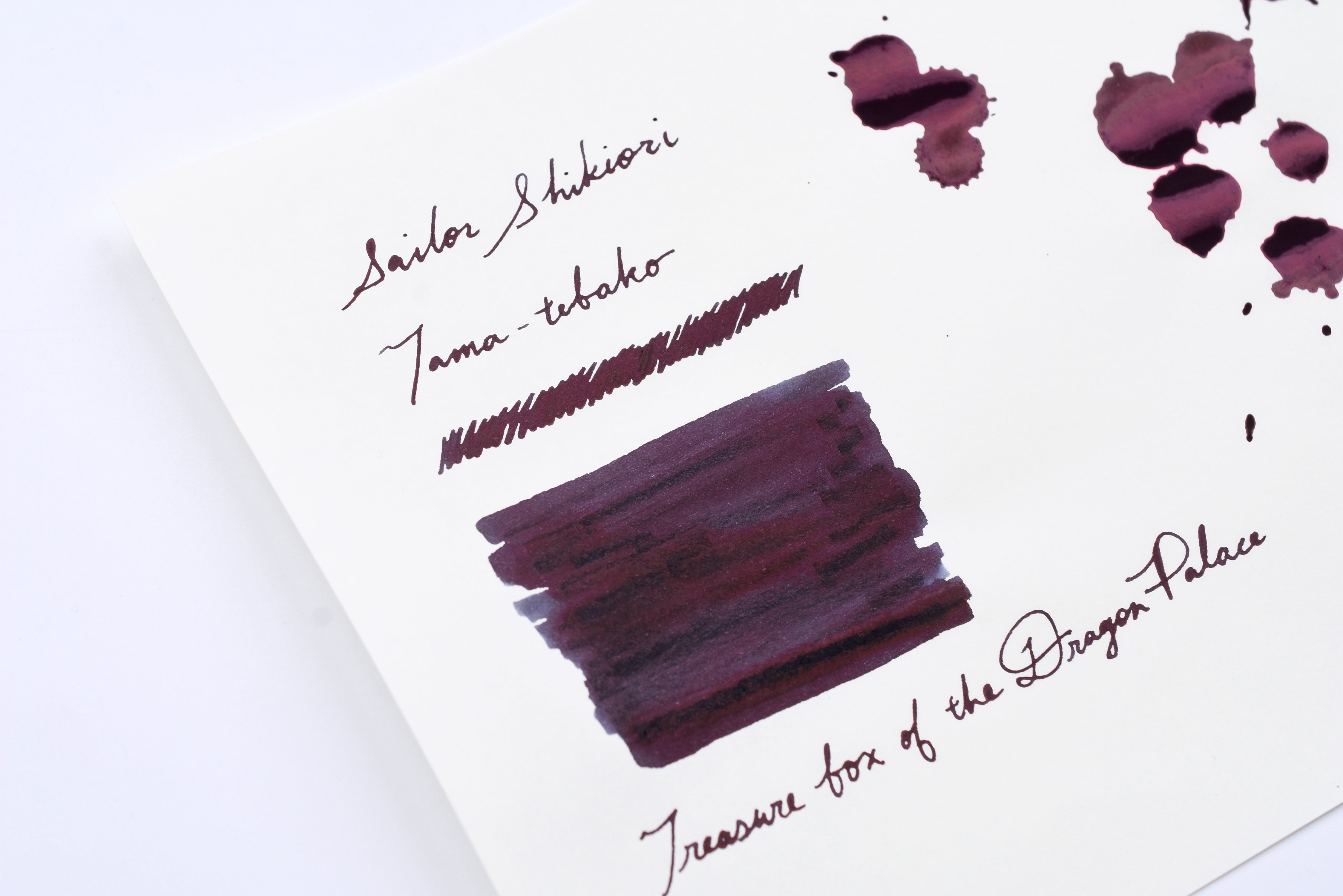 comes in a cute little container. it has more shading than the swatch and a small amount of red sheen, but other than that the swatch is pretty accurate. it looks pretty good even in thin nibs. flow is good, it's not too wet and not too dry.