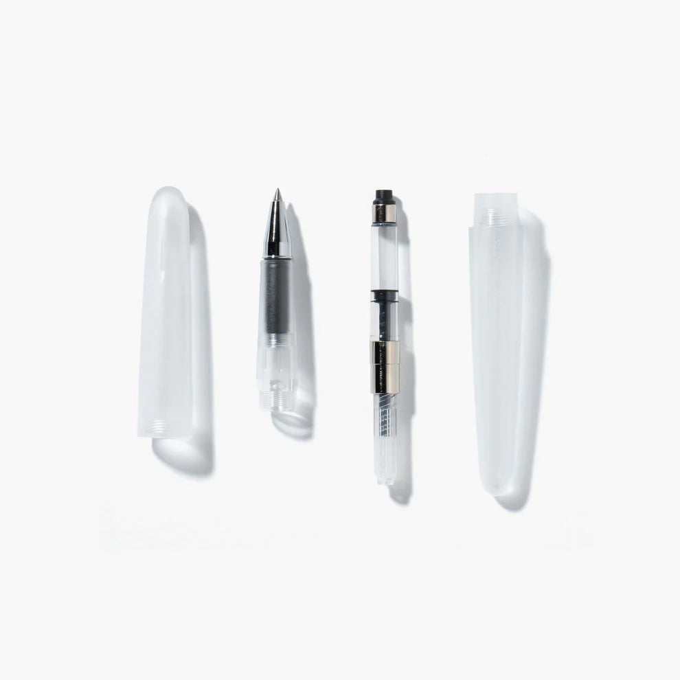 The pen is equipped with thoughtful functionality, including an extended grip section and a screw cap designed for quick access with minimal turns. The visible ink level allows for easy refills. The nib is swappable between Kakimori's Fountain Pen F & M nibs and the Rollerball nib.