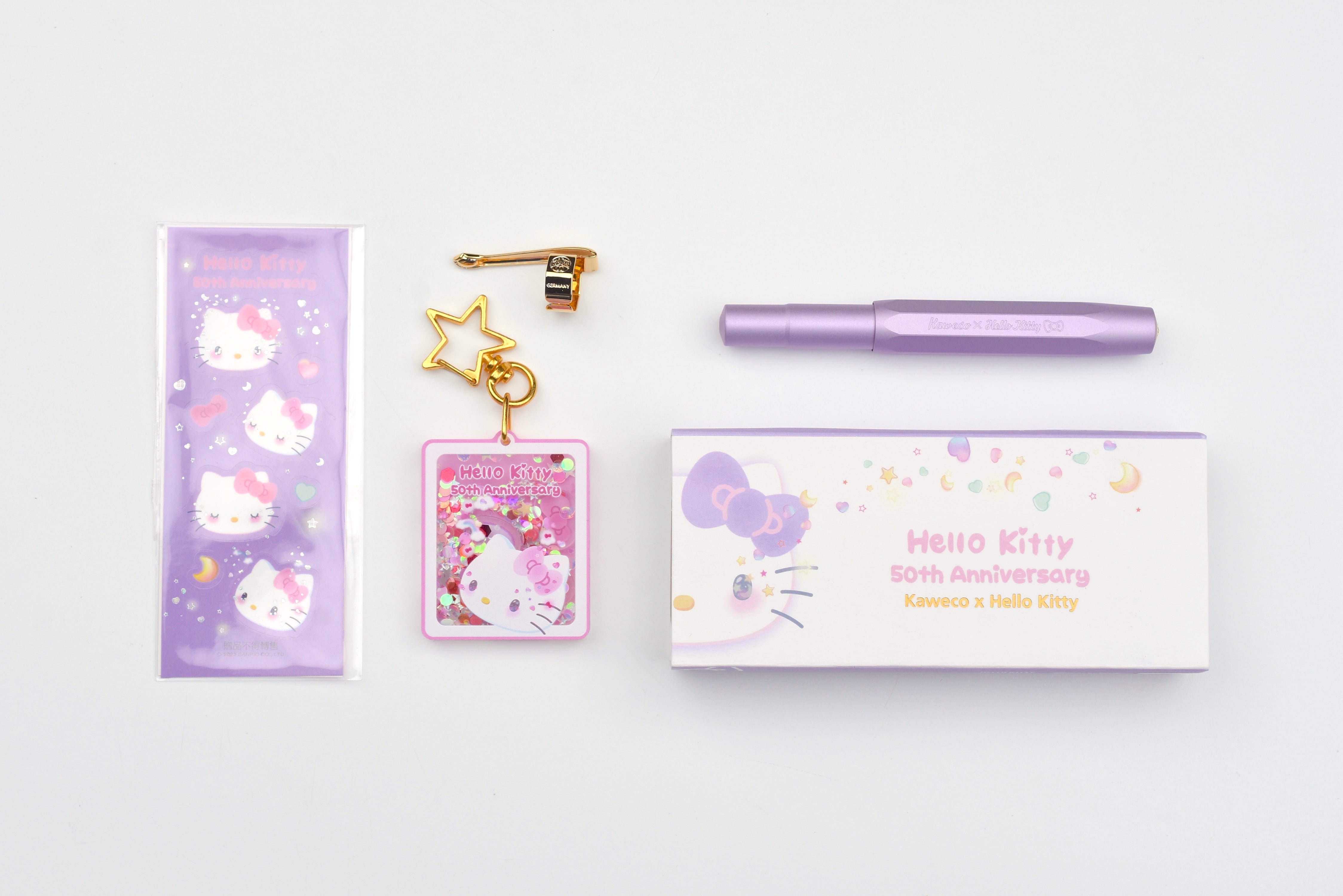 This edition of Kaweco's well-loved sport pens is a collaboration with Hello Kitty to celebrate Sanrio's 50th Anniversary! The aluminum pen body is a single pastel color with Hello Kitty's face stamped into the nib. This exclusive set comes with a Hello Kitty glitter keychain and a set of Hello Kitty stickers, as well as a deluxe Kaweco gold pen clip and starter blue ink cartridge.
